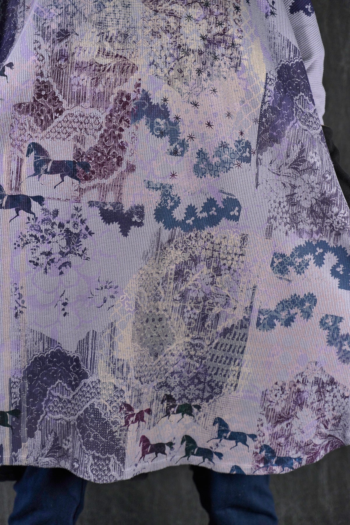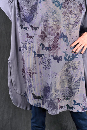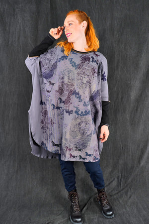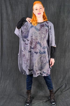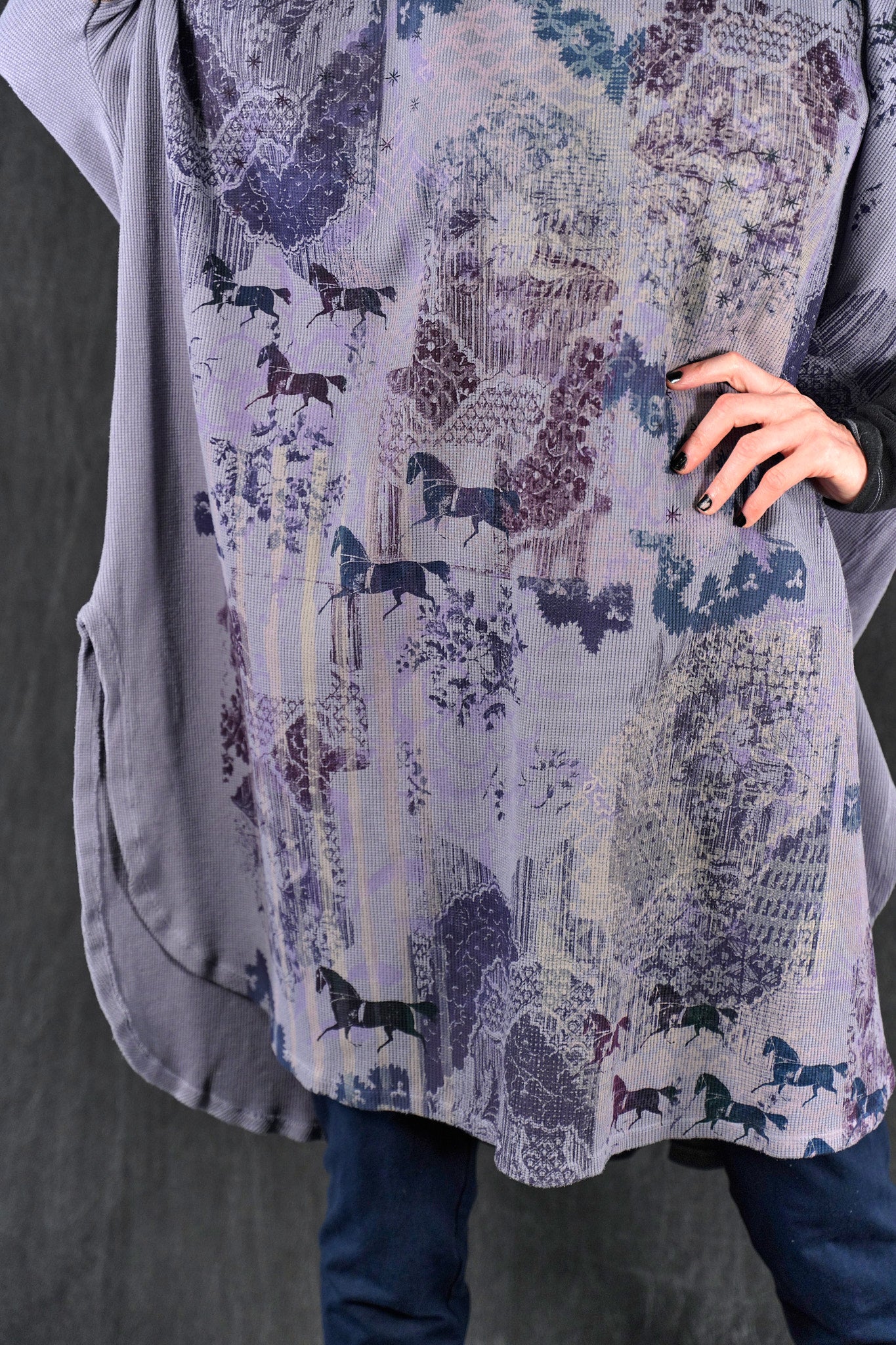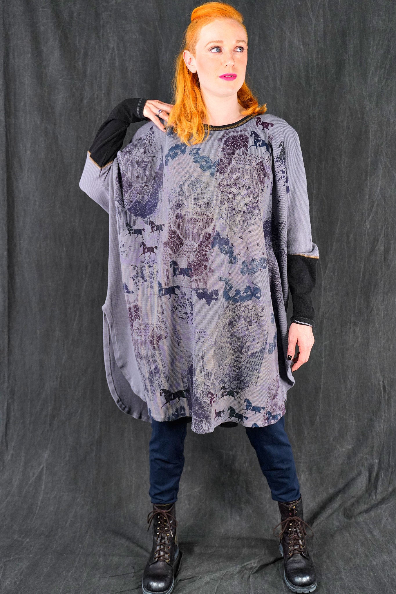 This organic, hand dyed ,stylish, one-size, thermal tunic is an instant classic. Color block trimmed at the neck and sleeves of a thick cotton lycra and contrasting thread stitching. Printed with a plethora of layered artful designs from our studio artists... a true work of art!