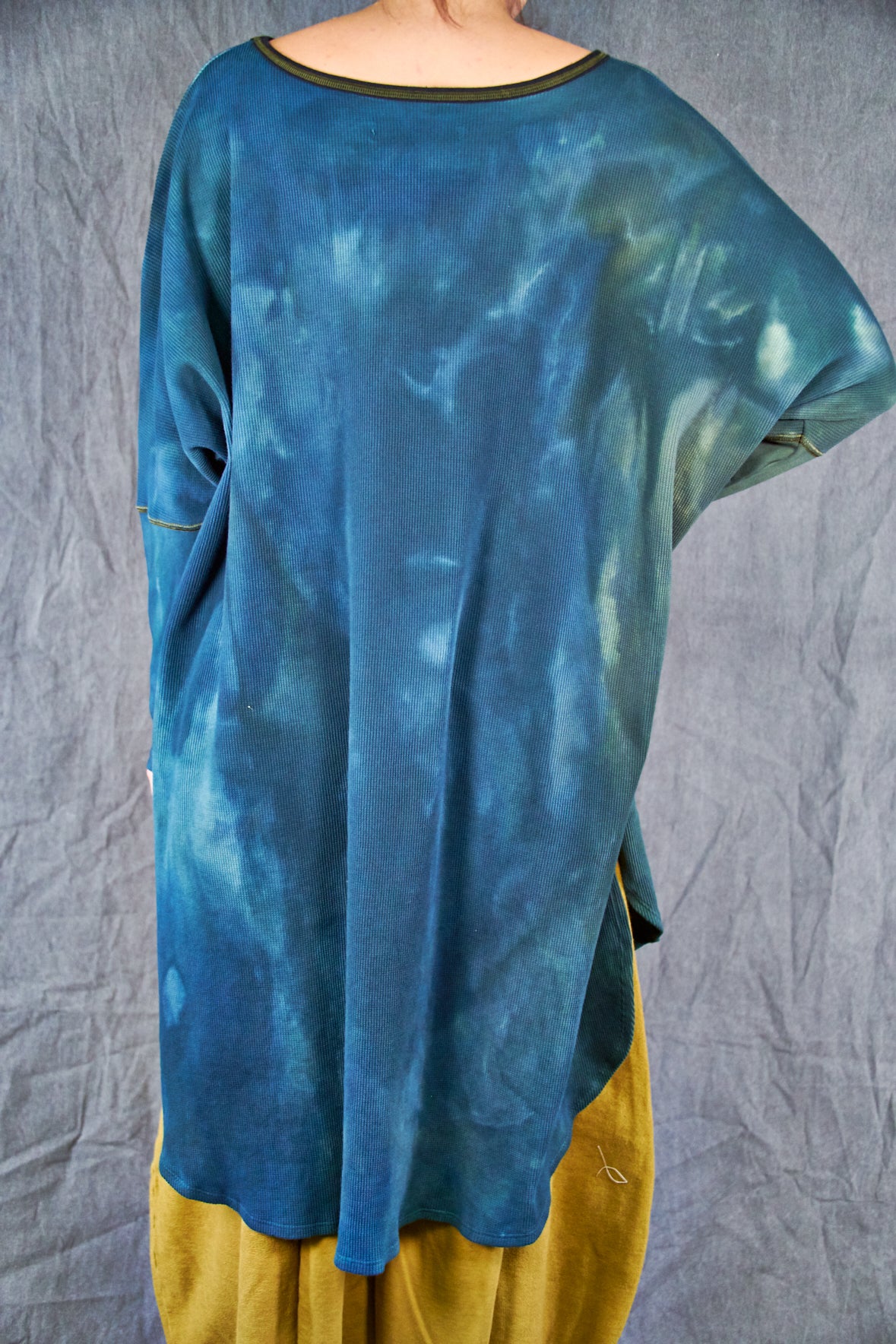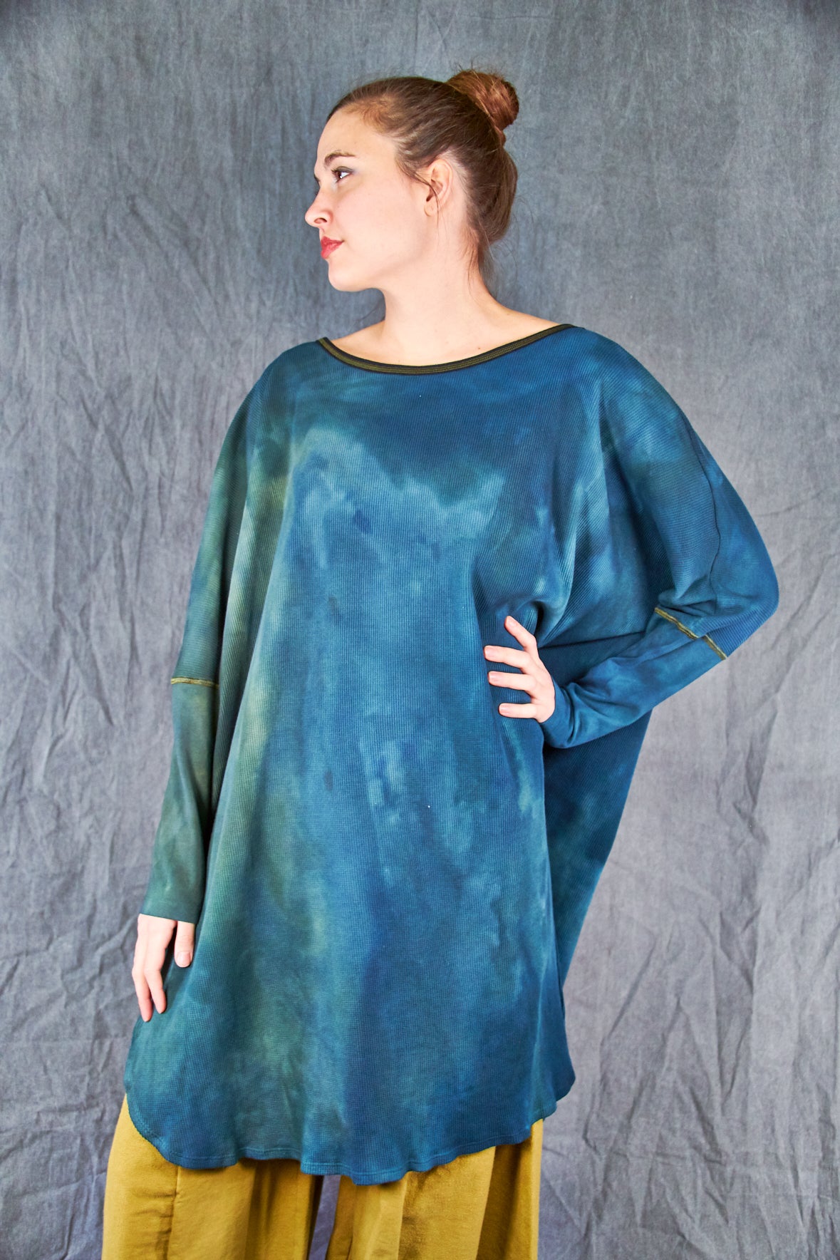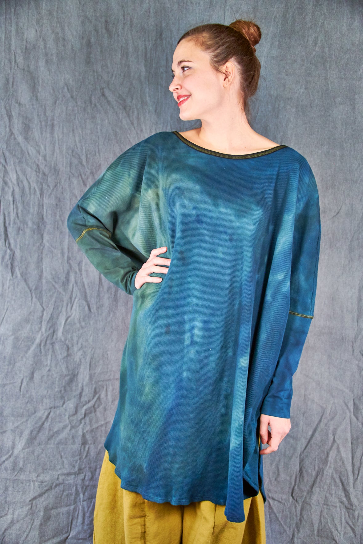 This organic, stylish, one-size, hand-dyed thermal tunic is an instant classic. Color block trimmed at the neck and sleeves with a thick cotton/hemp blend and contrasting thread stitching. Printed with a plethora of layered artful designs from our studio artists... a true work of art!