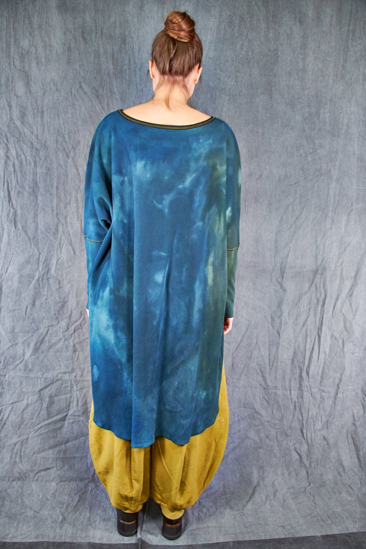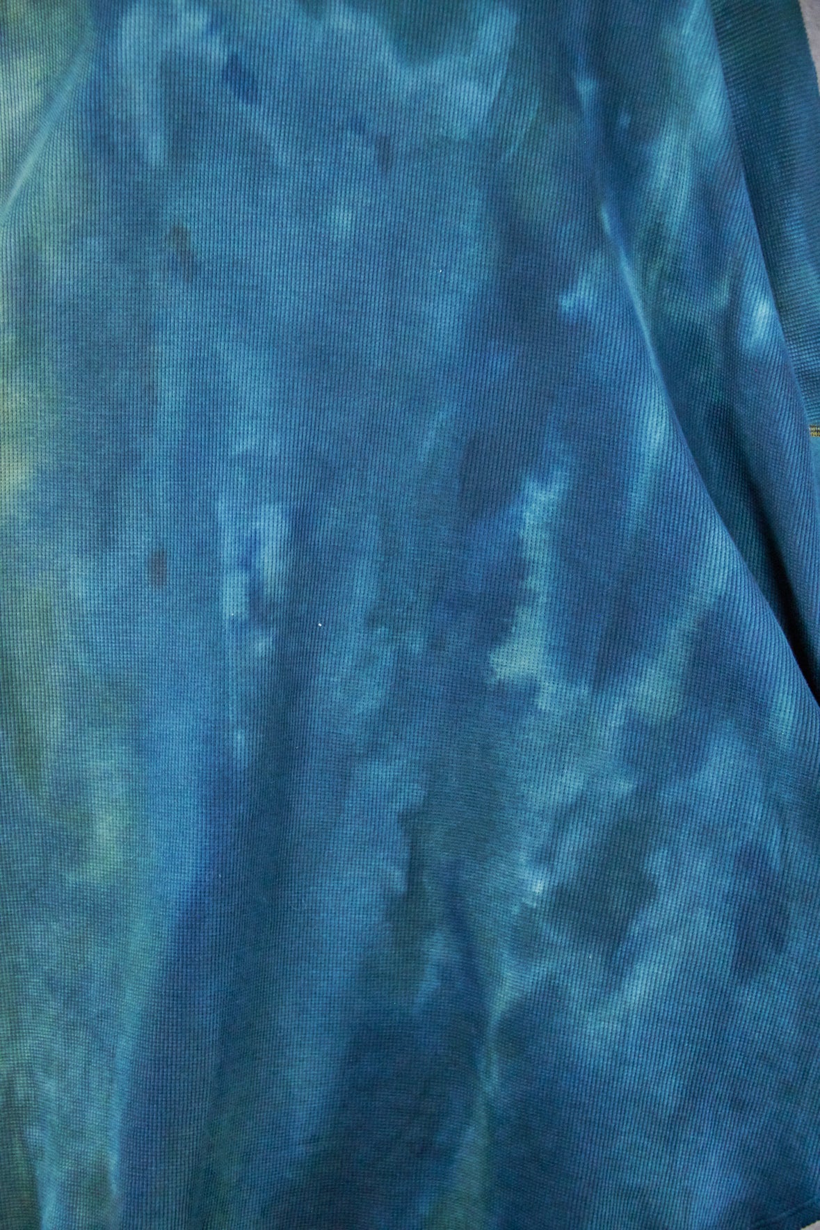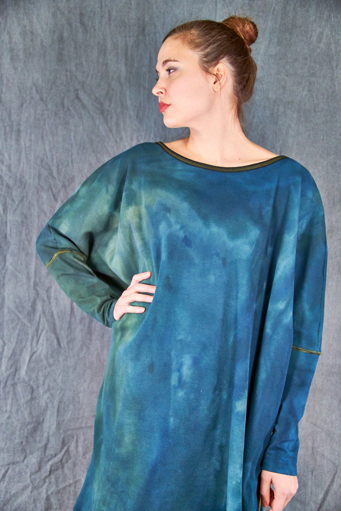 This organic, stylish, one-size, hand-dyed thermal tunic is an instant classic. Color block trimmed at the neck and sleeves with a thick cotton/hemp blend and contrasting thread stitching. Printed with a plethora of layered artful designs from our studio artists... a true work of art!