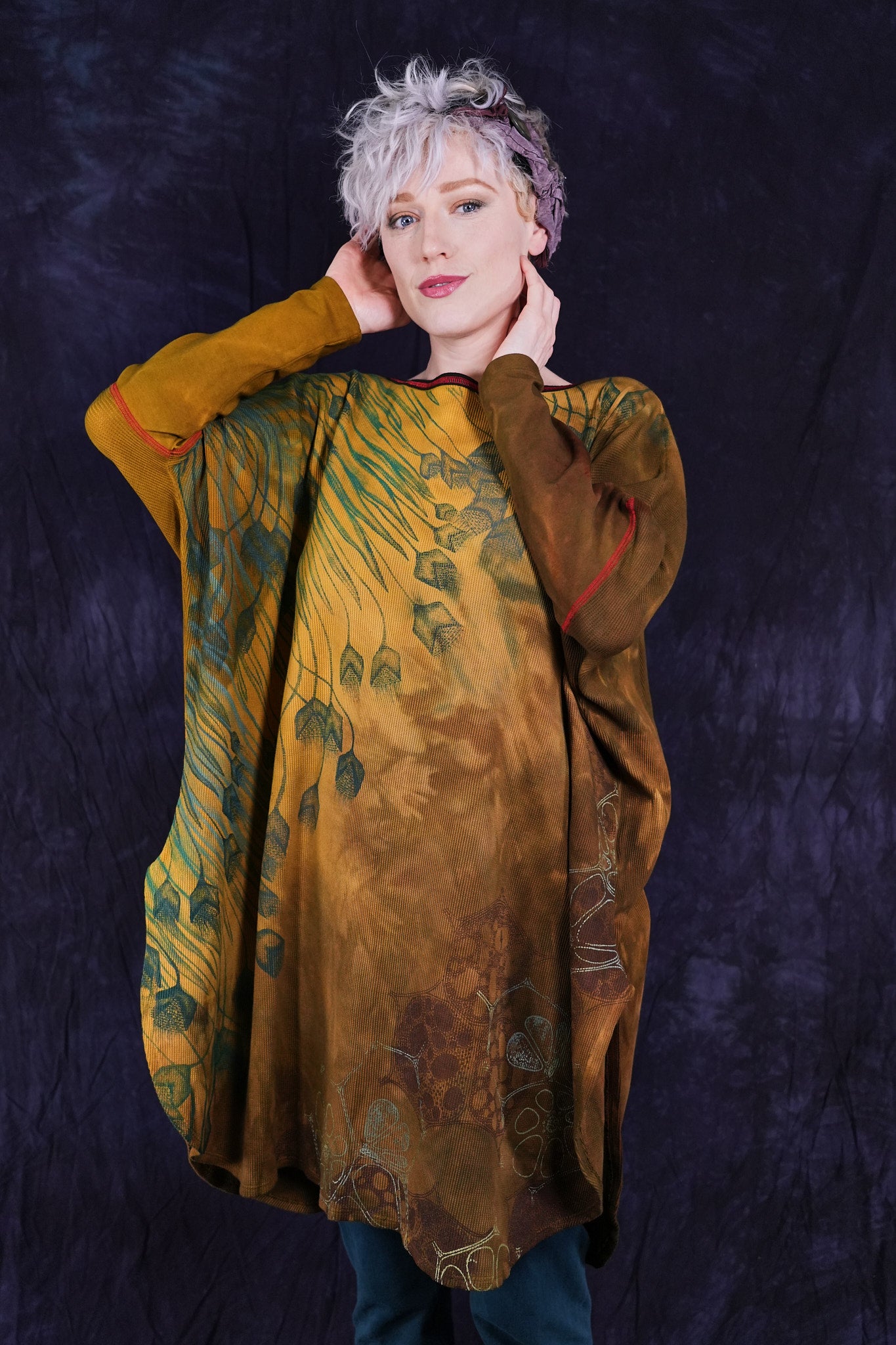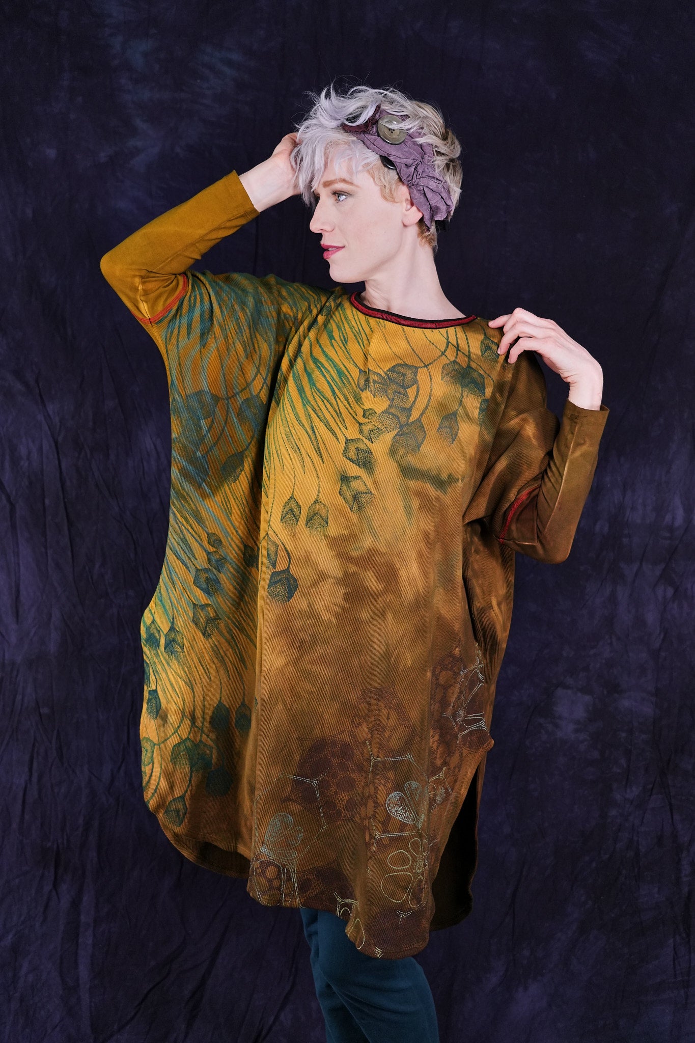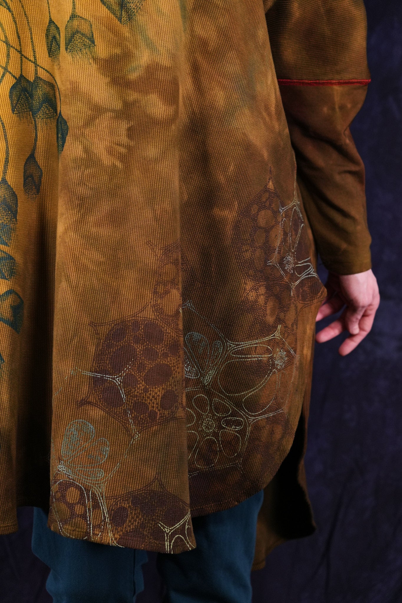 This organic, stylish, one-size, hand-dyed thermal tunic is an instant classic. Color block trimmed at the neck and sleeves with a thick cotton/hemp blend and contrasting thread stitching. Printed with a plethora of layered artful designs from our studio artists... a true work of art!