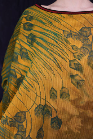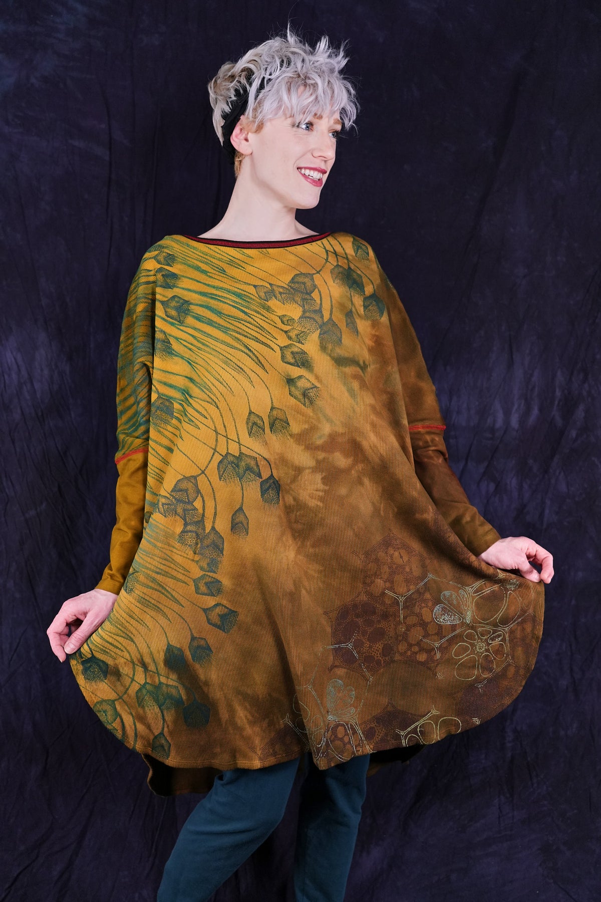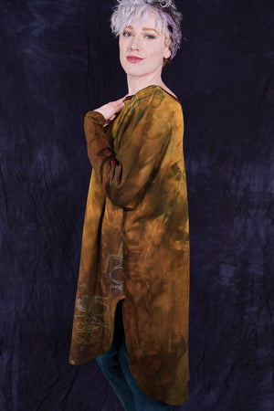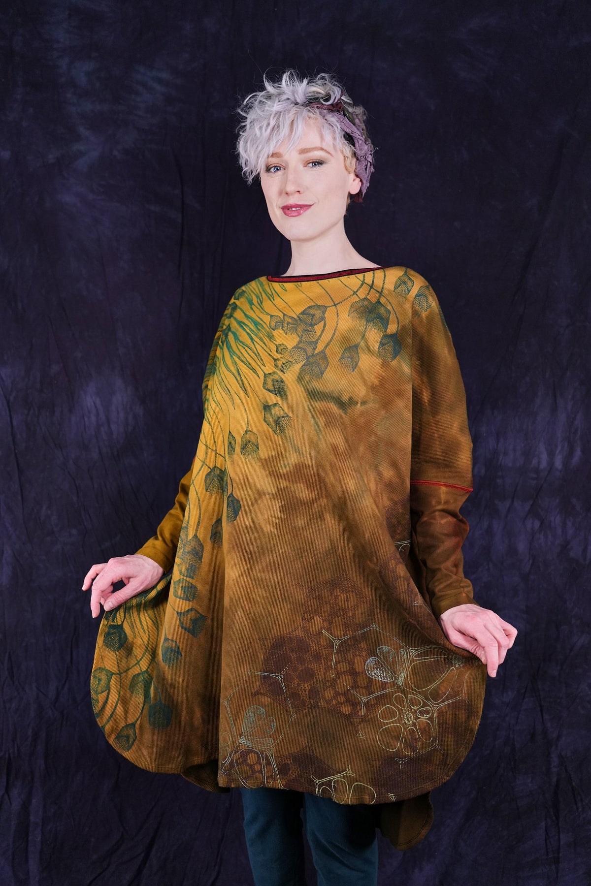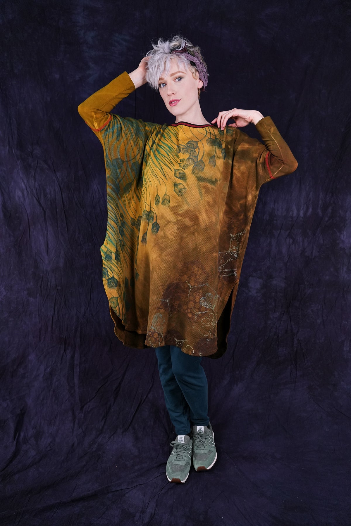 This organic, stylish, one-size, hand-dyed thermal tunic is an instant classic. Color block trimmed at the neck and sleeves with a thick cotton/hemp blend and contrasting thread stitching. Printed with a plethora of layered artful designs from our studio artists... a true work of art!
