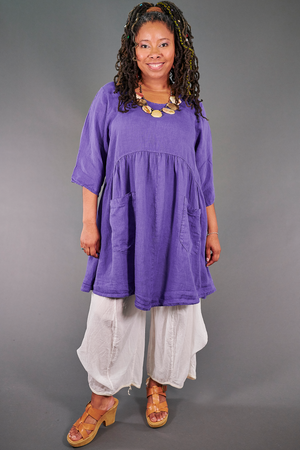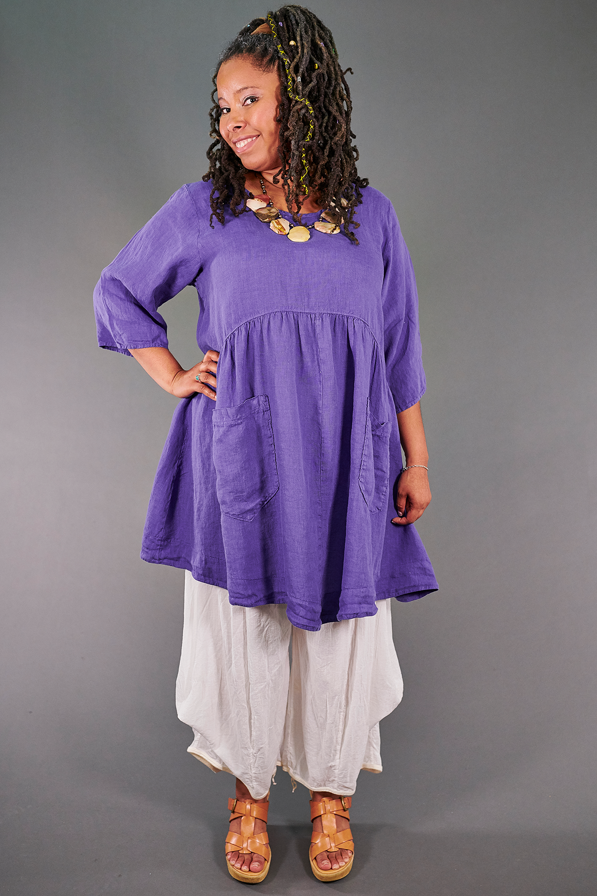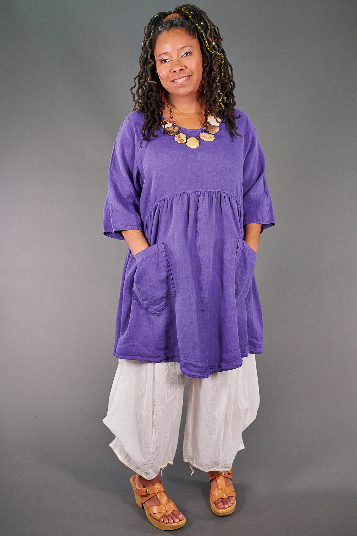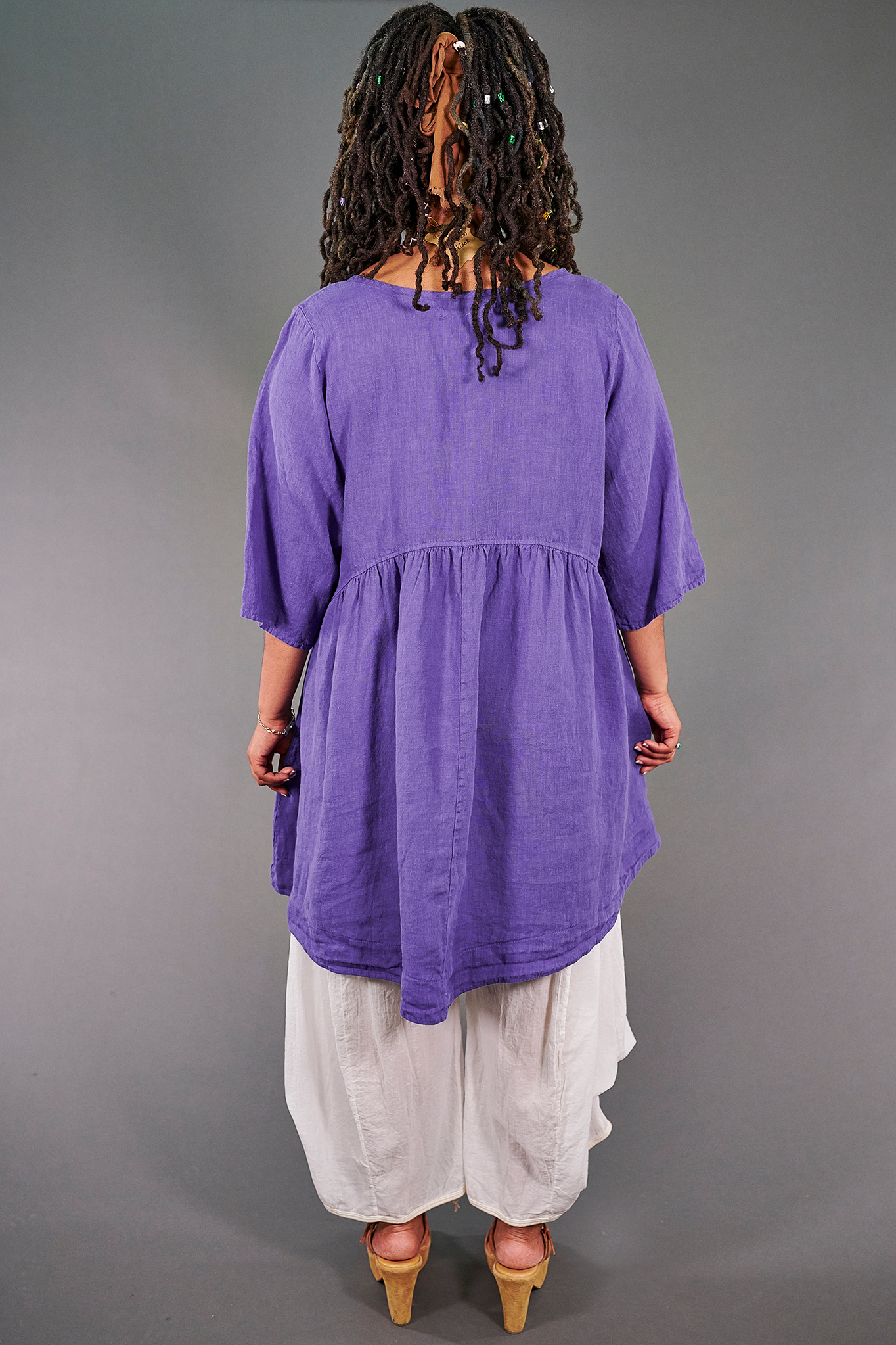 This wonderfully romantic mid-weight linen tunic is the perfect top for warm days. The cut is generous and flattering, with elbow-length sleeves. The playfully skirted bottom adds a touch of feminine elegance. This is truly a collector's item & one that you will wear for many years to come!