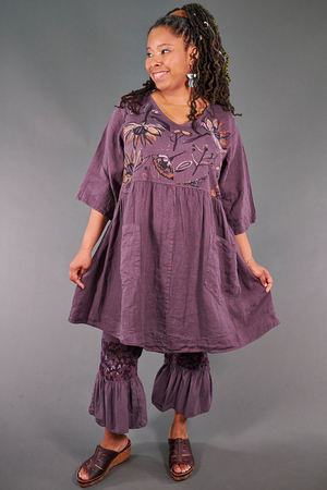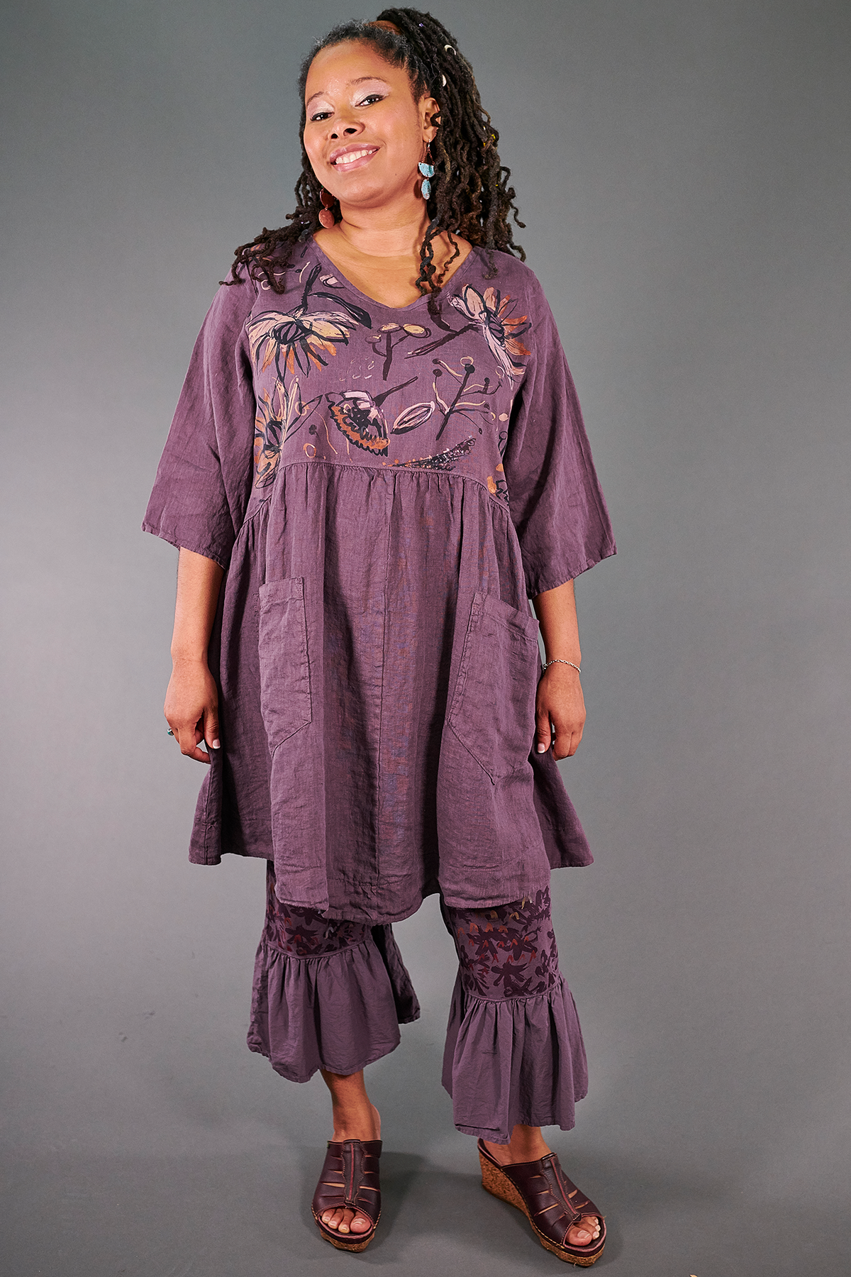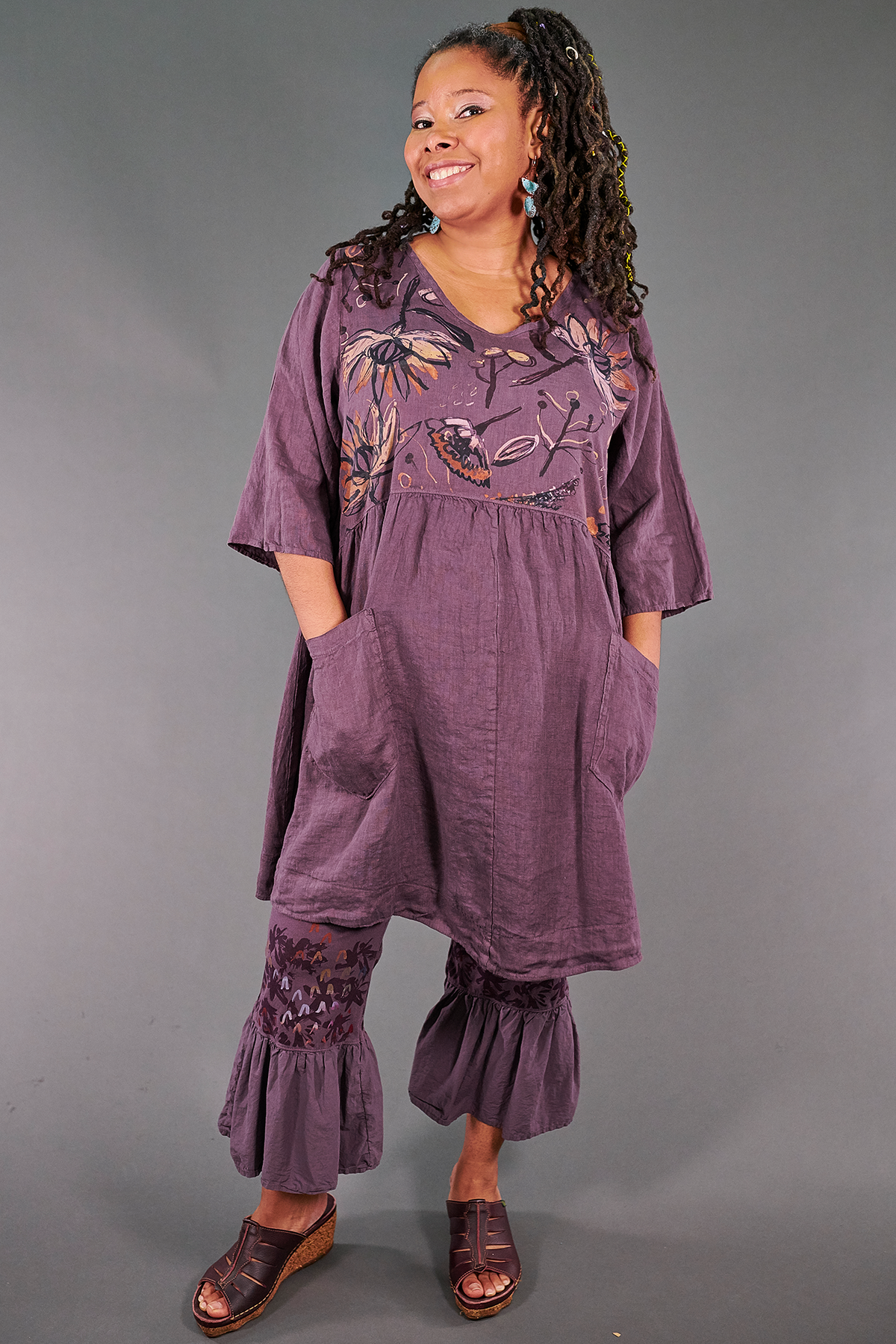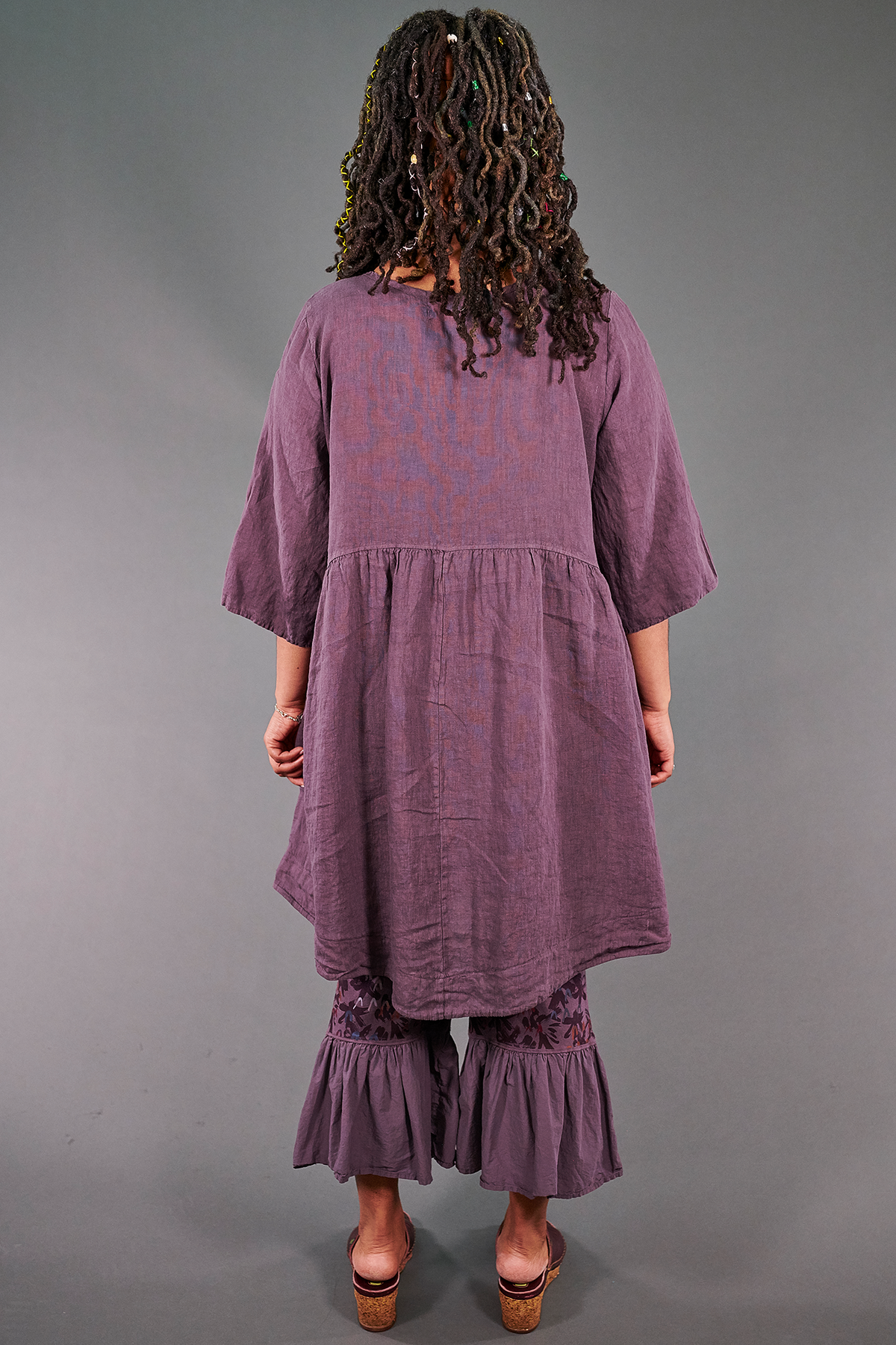 This wonderfully romantic mid-weight linen tunic is the perfect top for warm days. The cut is generous and flattering, with elbow-length sleeves. The playfully skirted bottom adds a touch of feminine elegance.