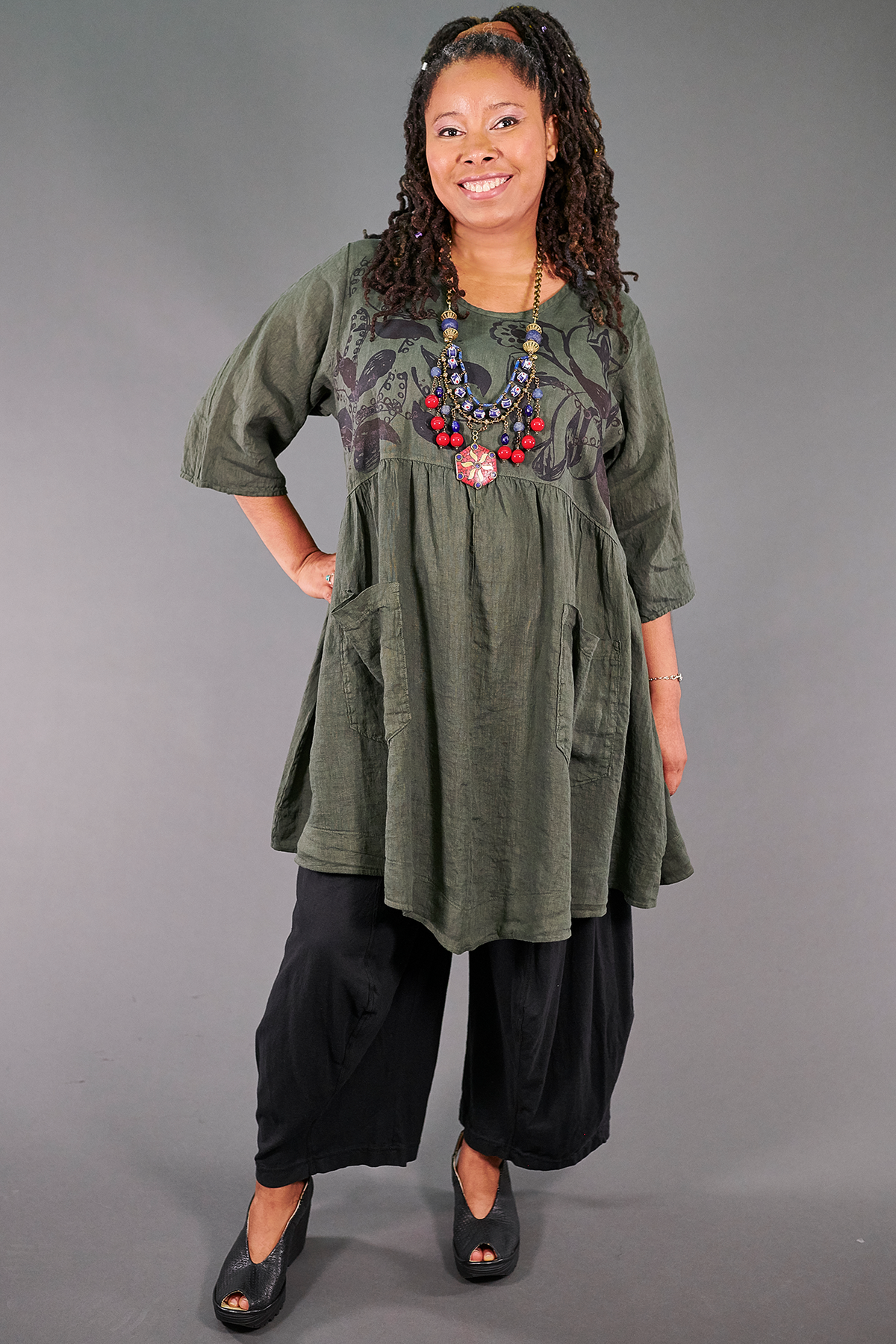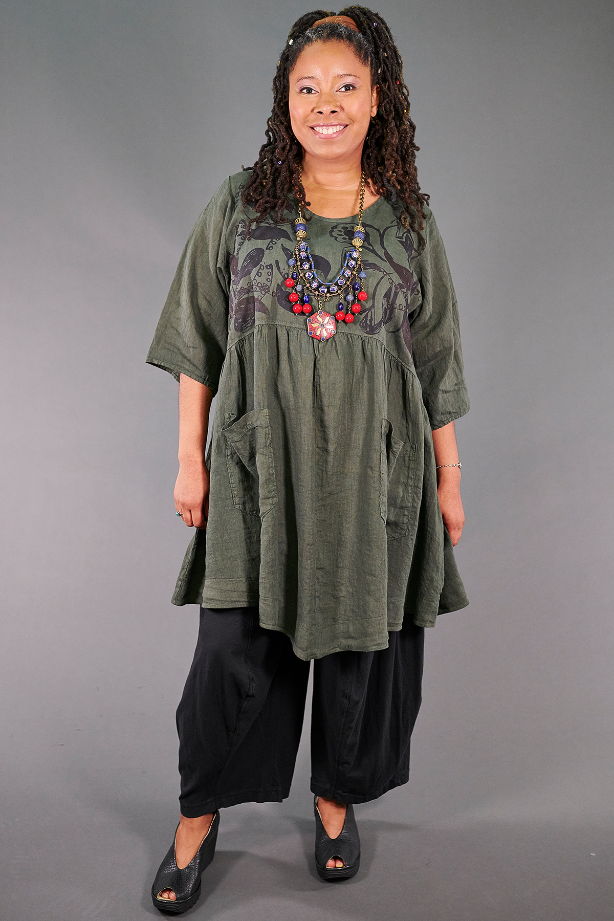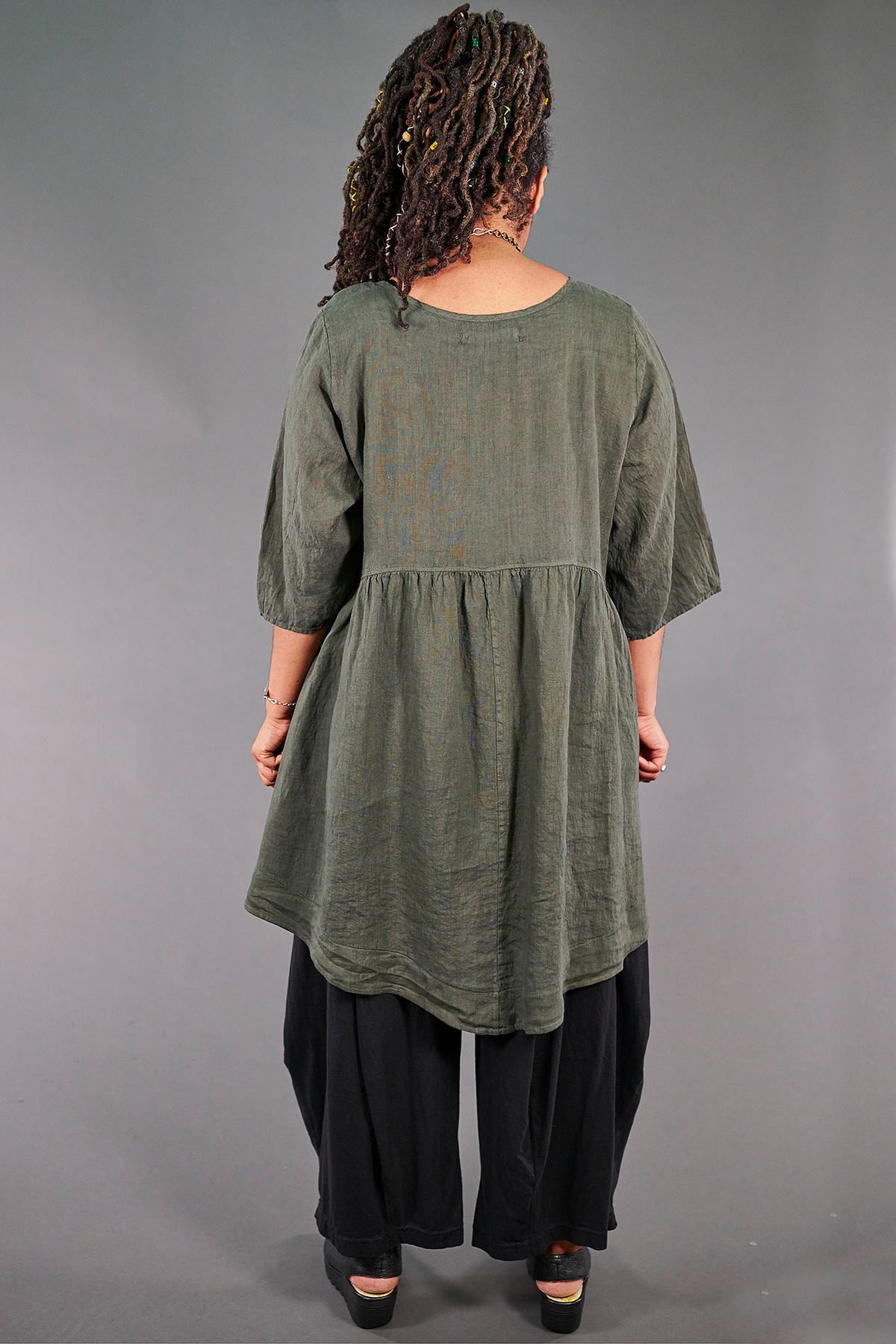 This wonderfully romantic mid-weight linen tunic is the perfect top for warm days. The cut is generous and flattering, with elbow-length sleeves. The playfully skirted bottom adds a touch of feminine elegance.