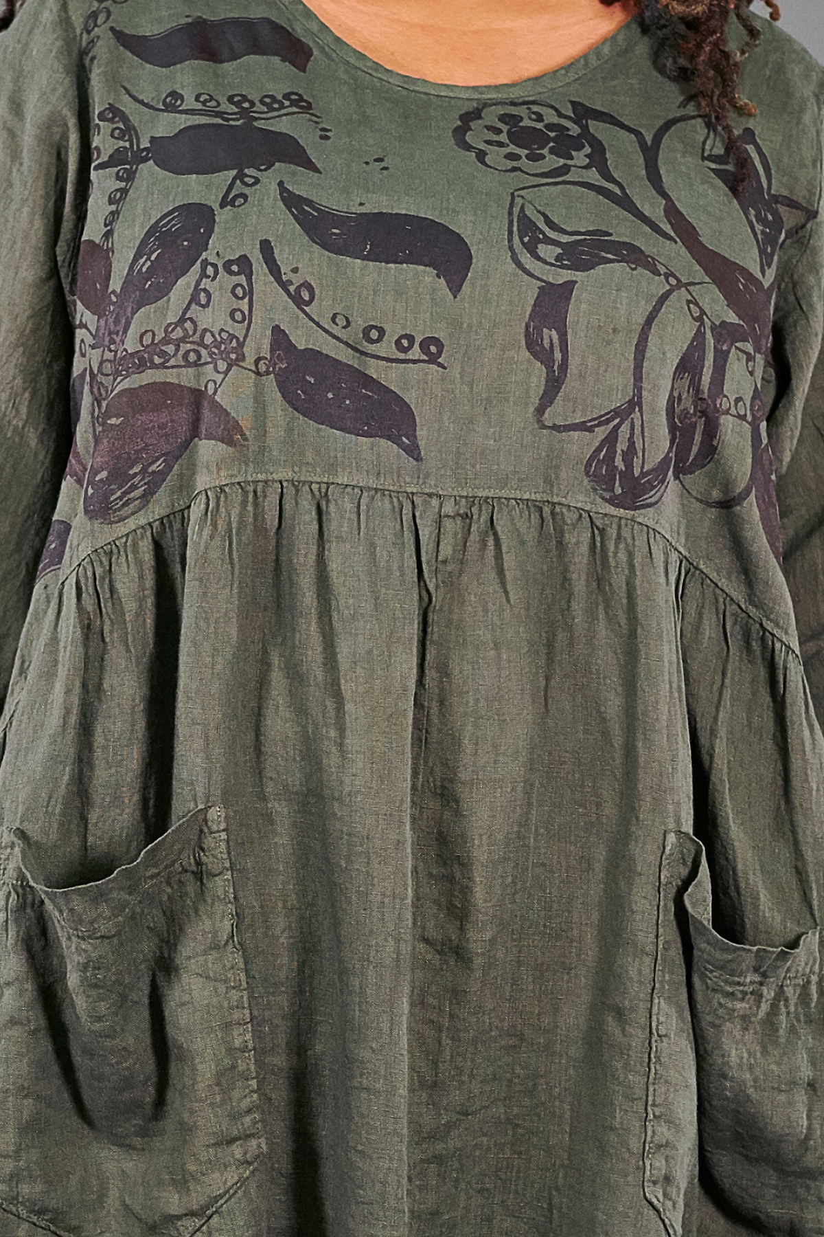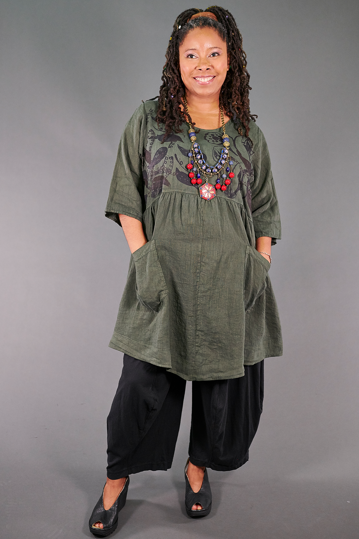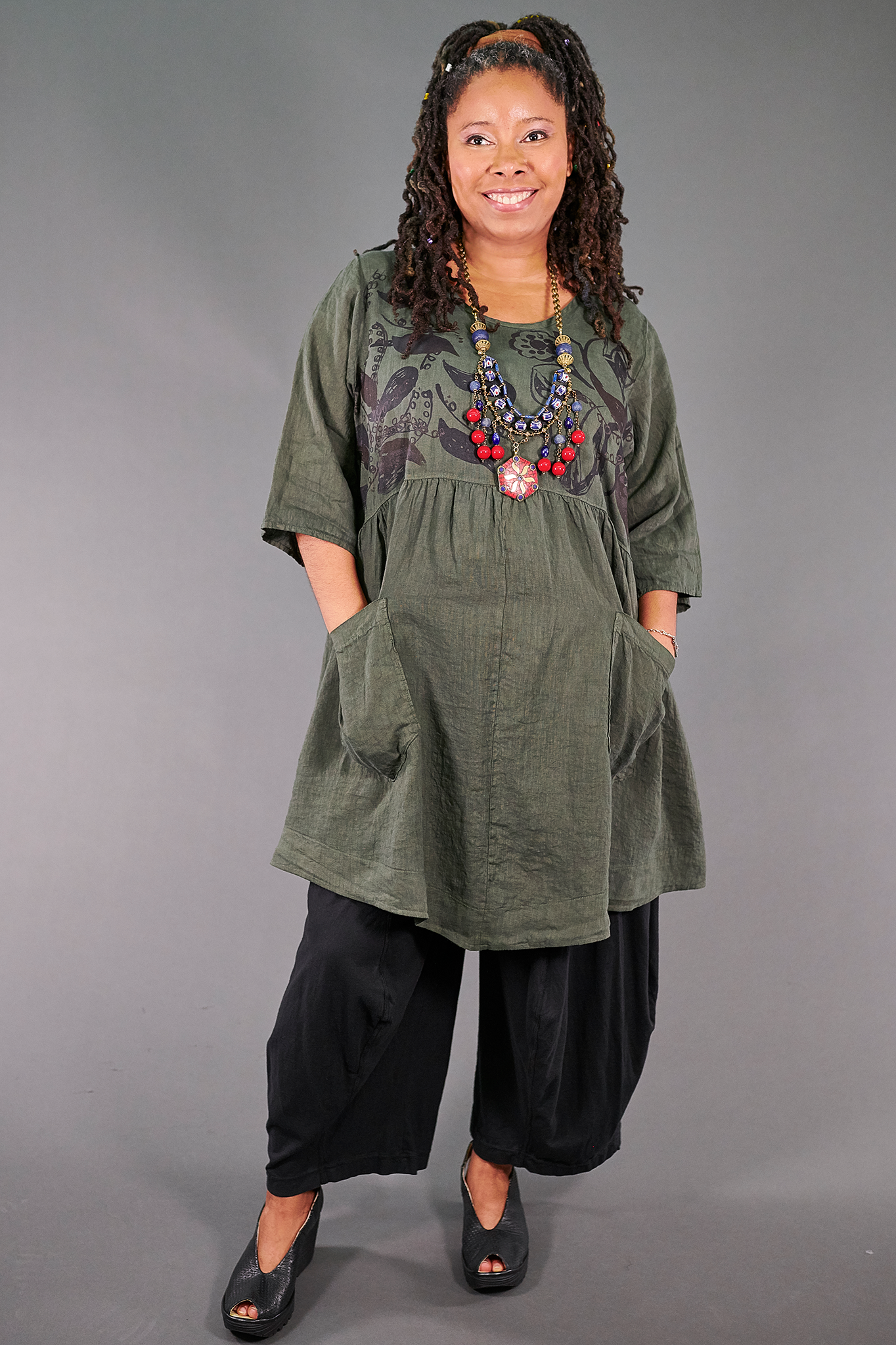 This wonderfully romantic mid-weight linen tunic is the perfect top for warm days. The cut is generous and flattering, with elbow-length sleeves. The playfully skirted bottom adds a touch of feminine elegance.
