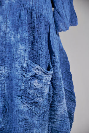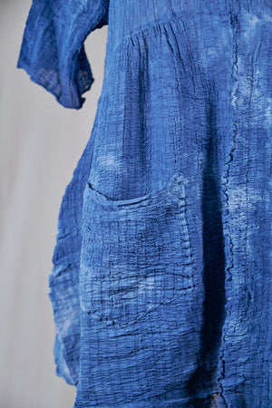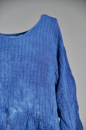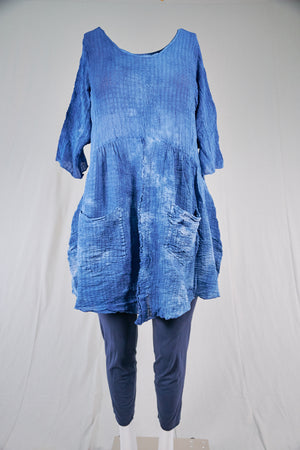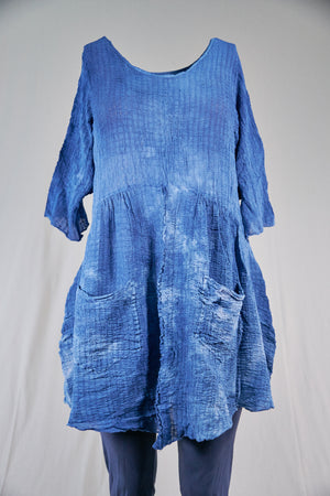 This hand dyed cotton tunic has a thread of lycra which causes it to pucker when dyed, creating a wonderful textural appeal. Hand dyed, each piece will vary in tone, colors and texture. THIS VERSION IS SLIGHTLY DEEPER BLUE THAN THE OTHER, SIMILAR LOOKING CRINKLE DRESS. You will receive a hand dyed dress that contains the colors as shown, however, please note that no two are alike and hand dyeing patterns will vary.