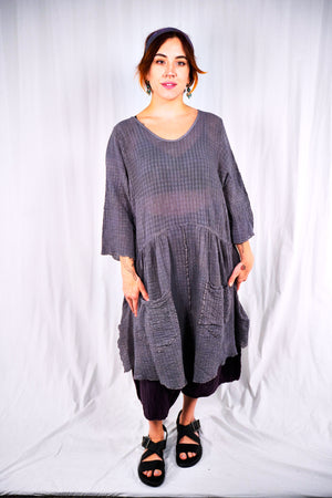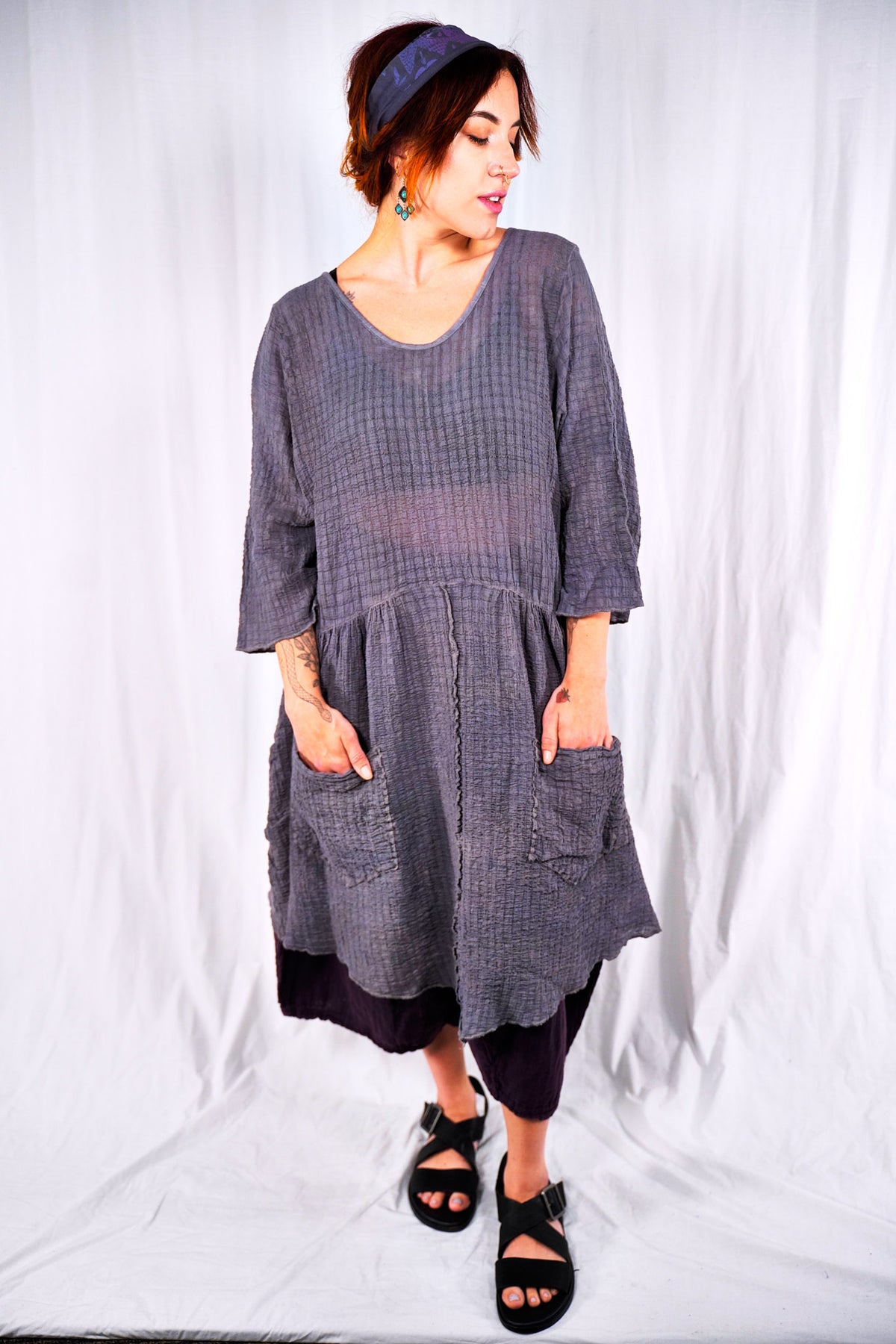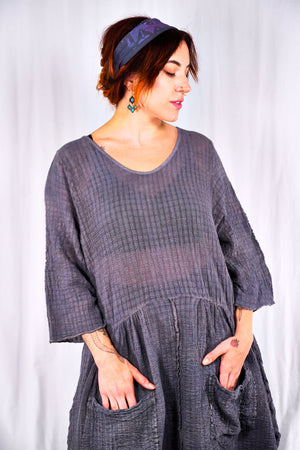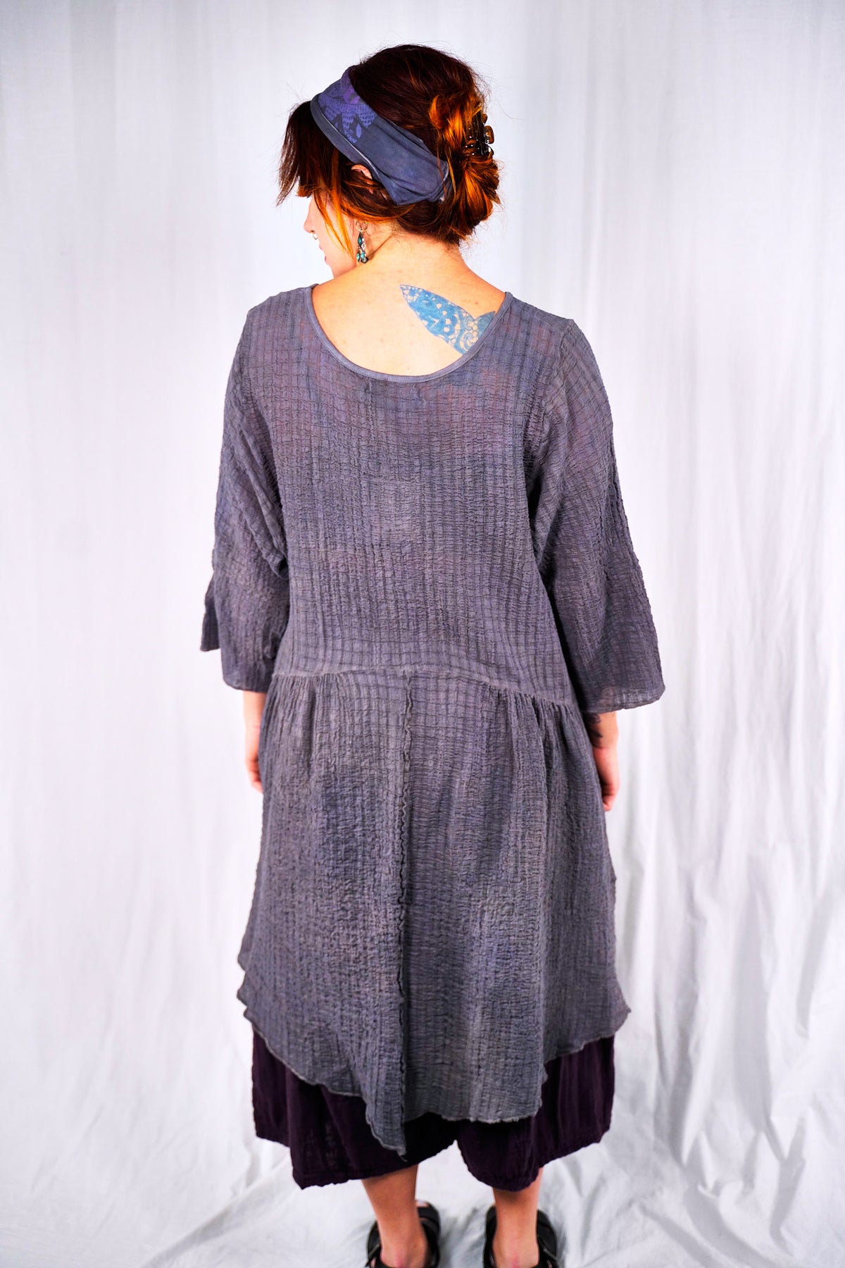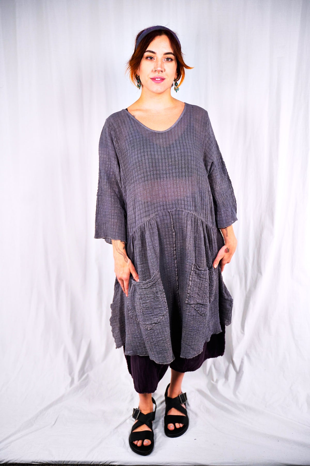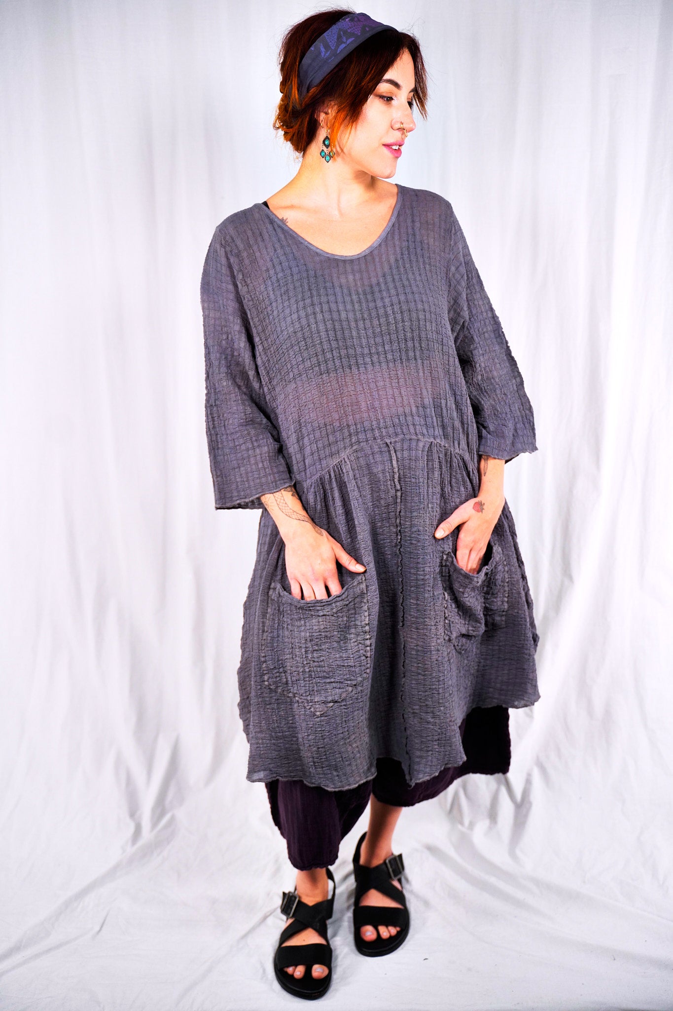 This hand dyed semi sheer lightweight airy cotton tunic has a thread of lycra which causes it to pucker when dyed, creating a wonderful textural appeal. Hand dyed, each piece will vary in tone, colors and texture. You will receive a hand dyed dress that contains the colors as shown, however, please note that no two are alike and hand dyeing patterns will vary. Perfect for throwing on when it is too hot to think what to wear. Rolls into a ball for traveling and so lightweight you will not even know it is there. Unfinished, raw edged hem at sleeve adds a bit of texture. Fun, flattering and a new favorite.