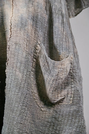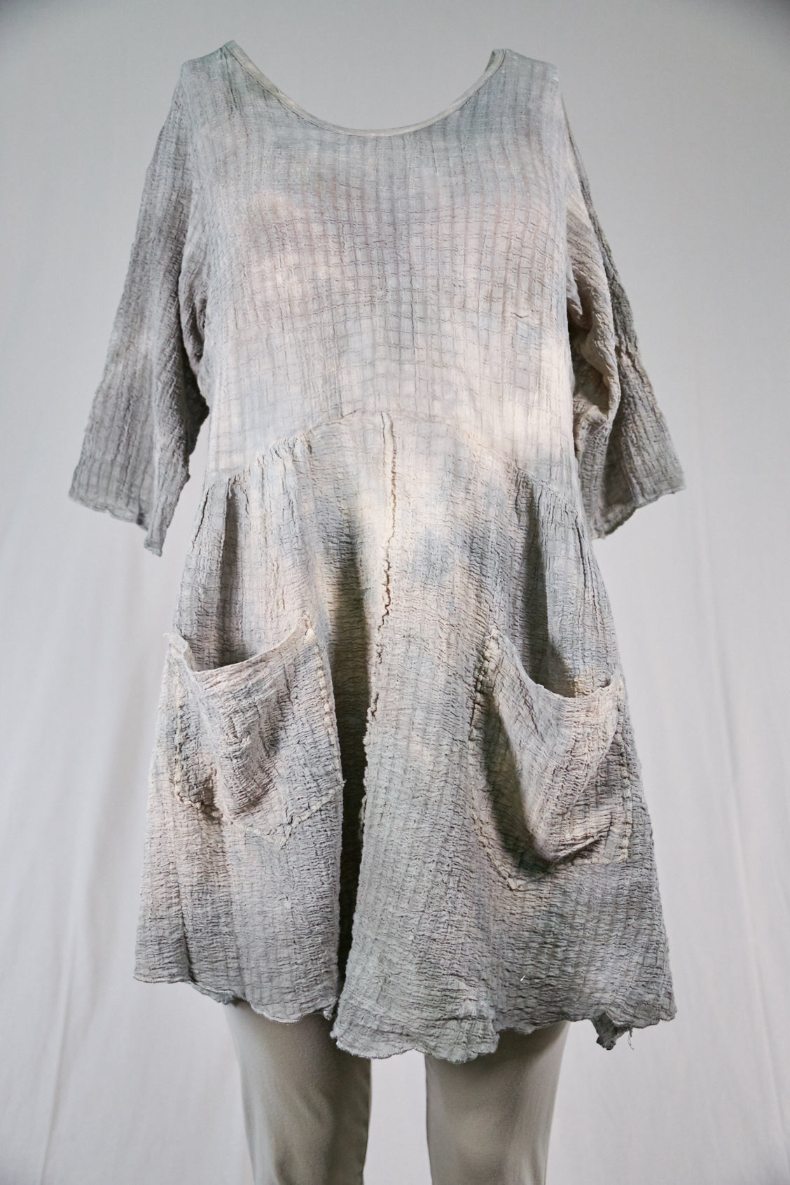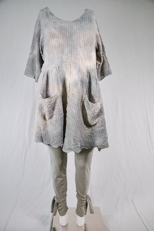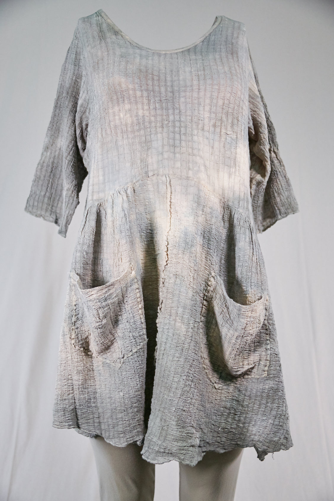 This hand dyed cotton tunic has a thread of lycra which causes it to pucker when dyed, creating a wonderful textural appeal. Hand dyed, each piece will vary in tone, colors and texture. THIS VERSION IS SLIGHTLY LIGHTER ( and has more textural variation) THAN THE OTHER, SIMILAR LOOKING CRINKLE DRESS. You will receive a hand dyed dress that contains the colors as shown, however, please note that no two are alike and hand dyeing patterns will vary.