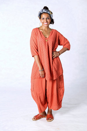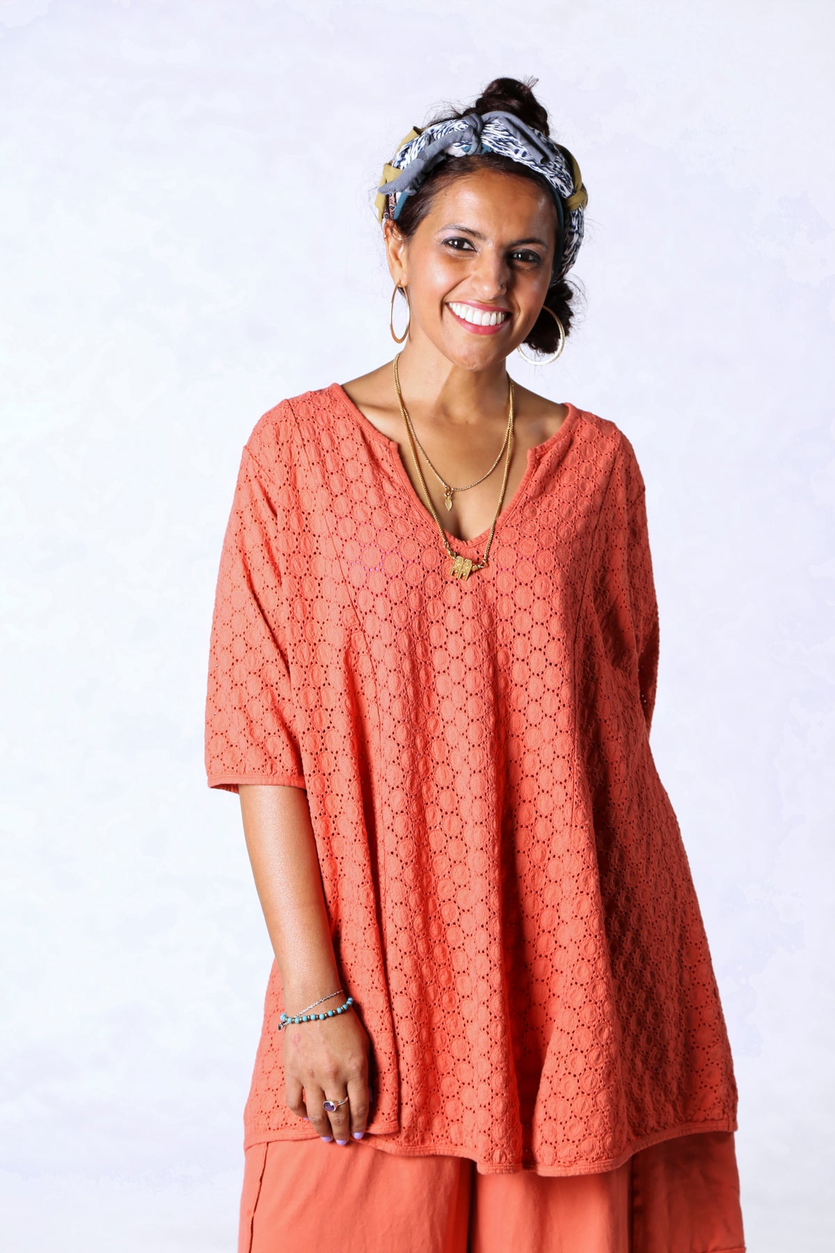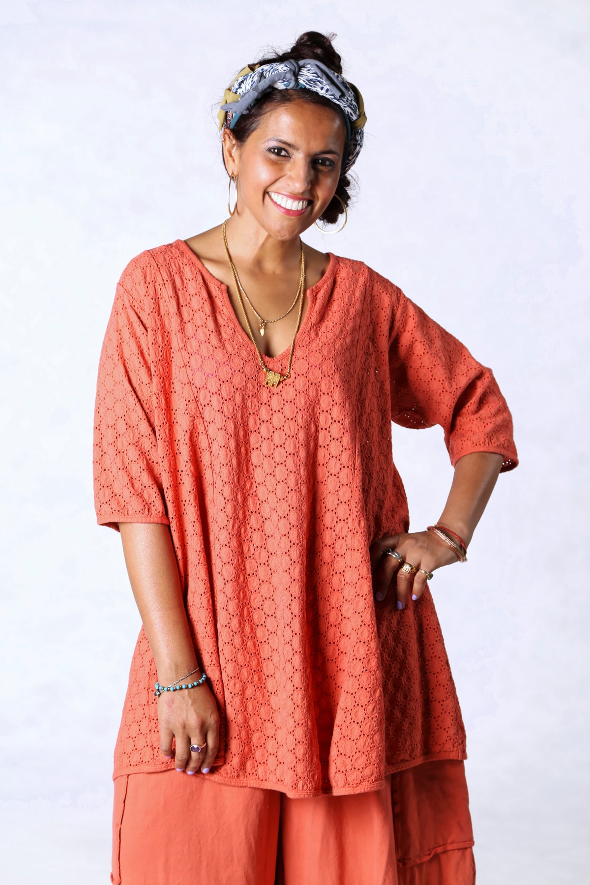Made from a beautiful eyelet lace--unusual coin eyelet in 100% cotton that drapes beautifully and ultra soft to the touch.