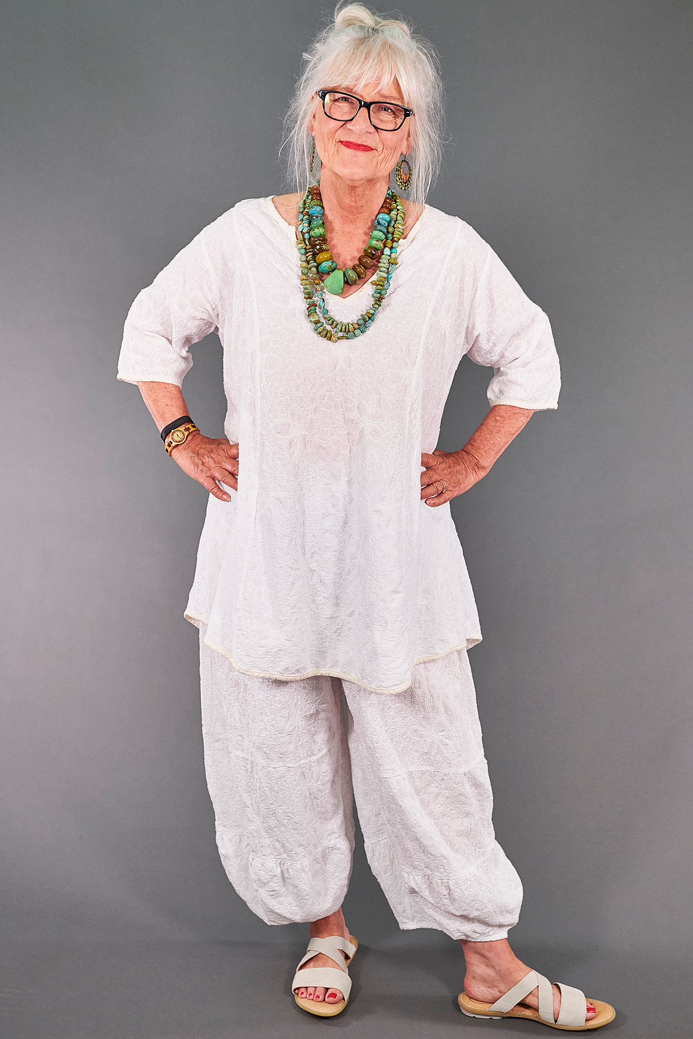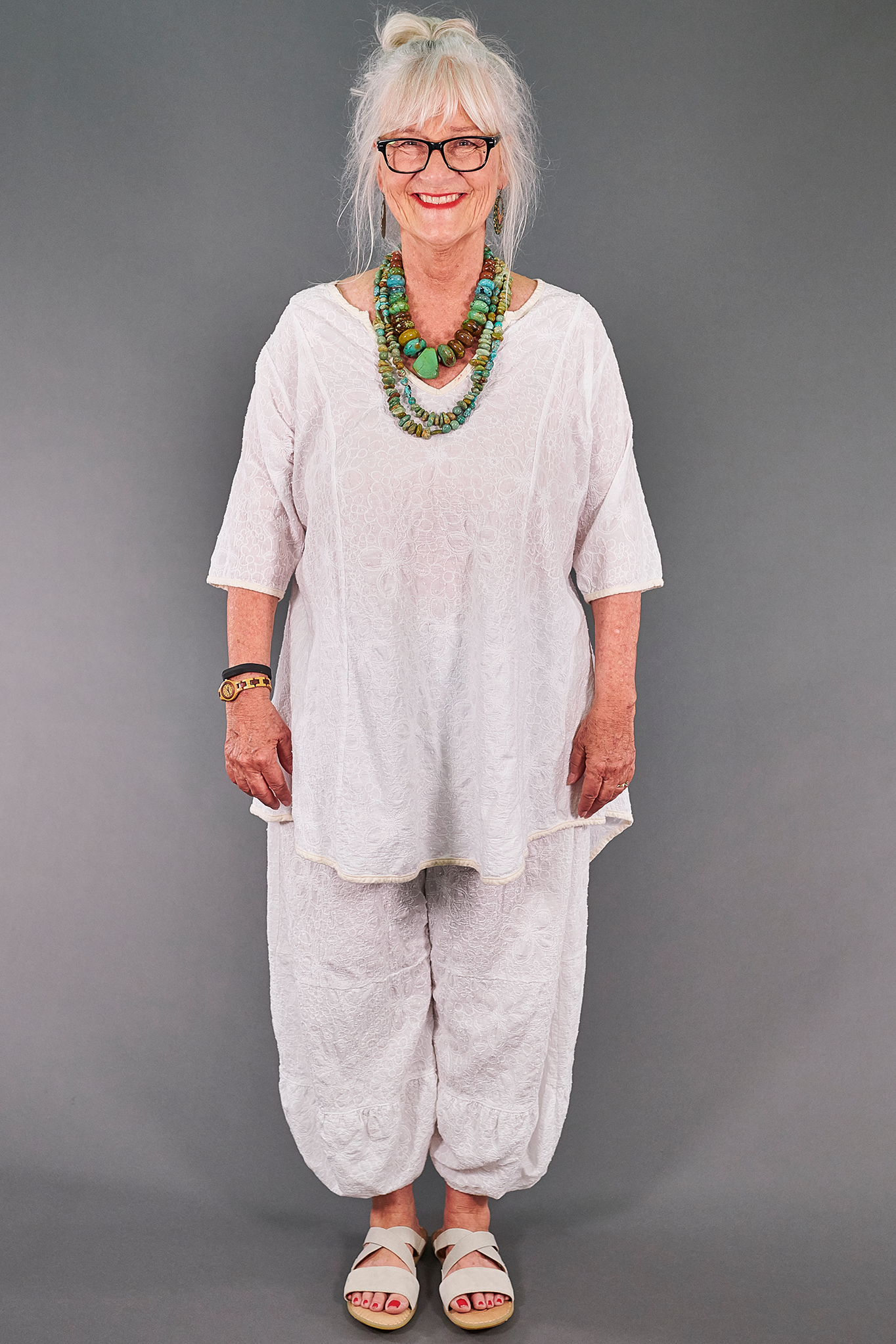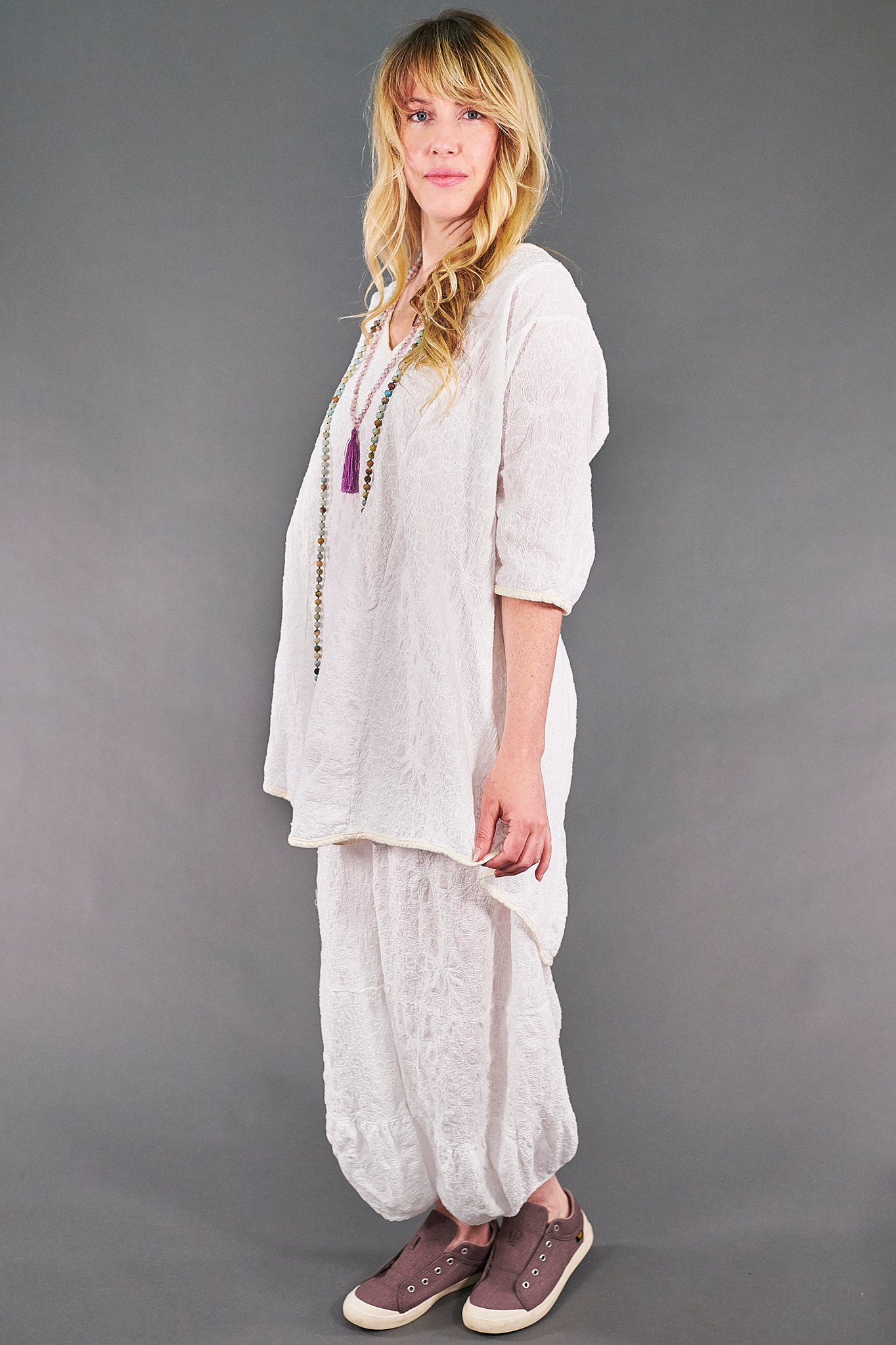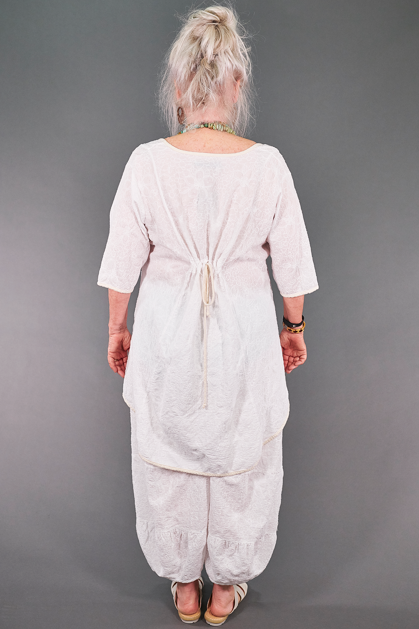 This style is generously cut & has a tie in the back to adjust the shape to your liking. Curved shirt tail hem & cut out neckline add interest. Perfect for wearing with leggings, linen pants, a skirt, or even our coordinating lace Meadow Pants. Strikingly beautiful & guaranteed to garner many compliments.
