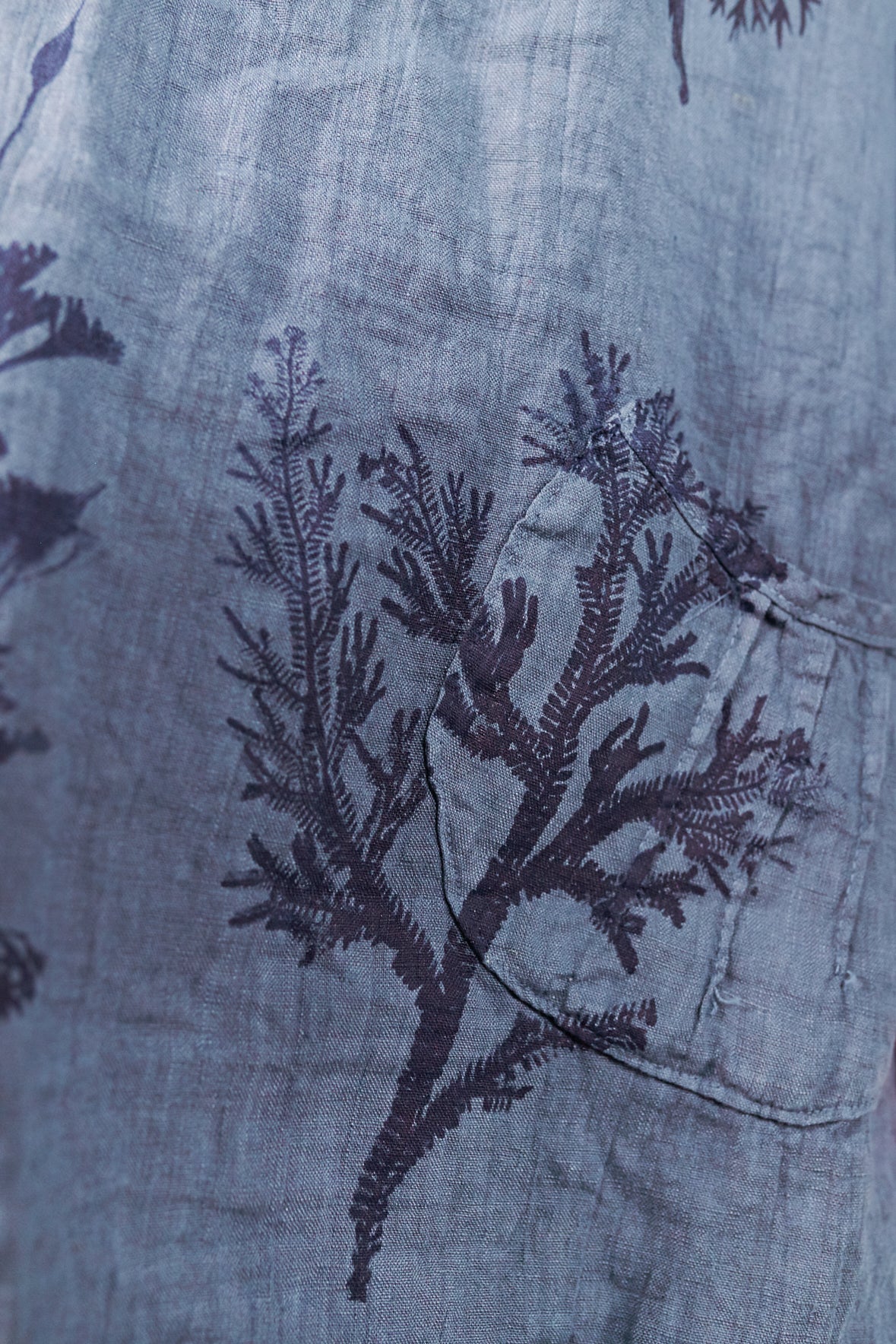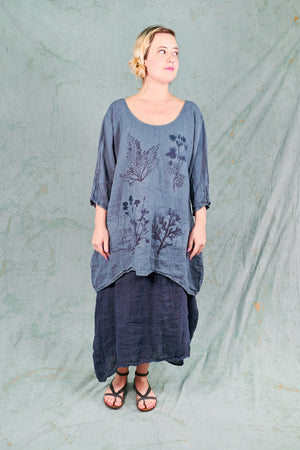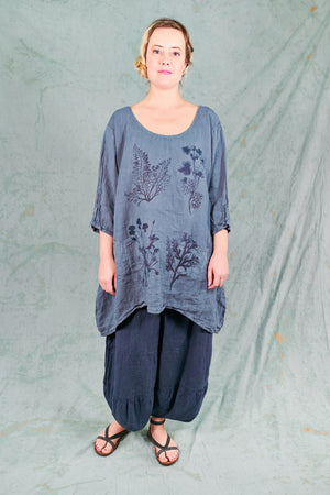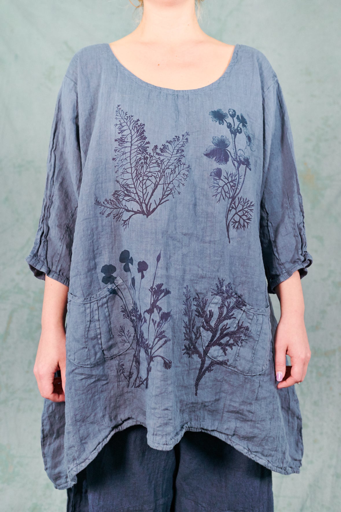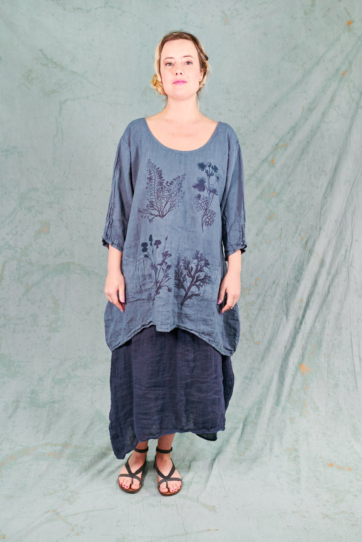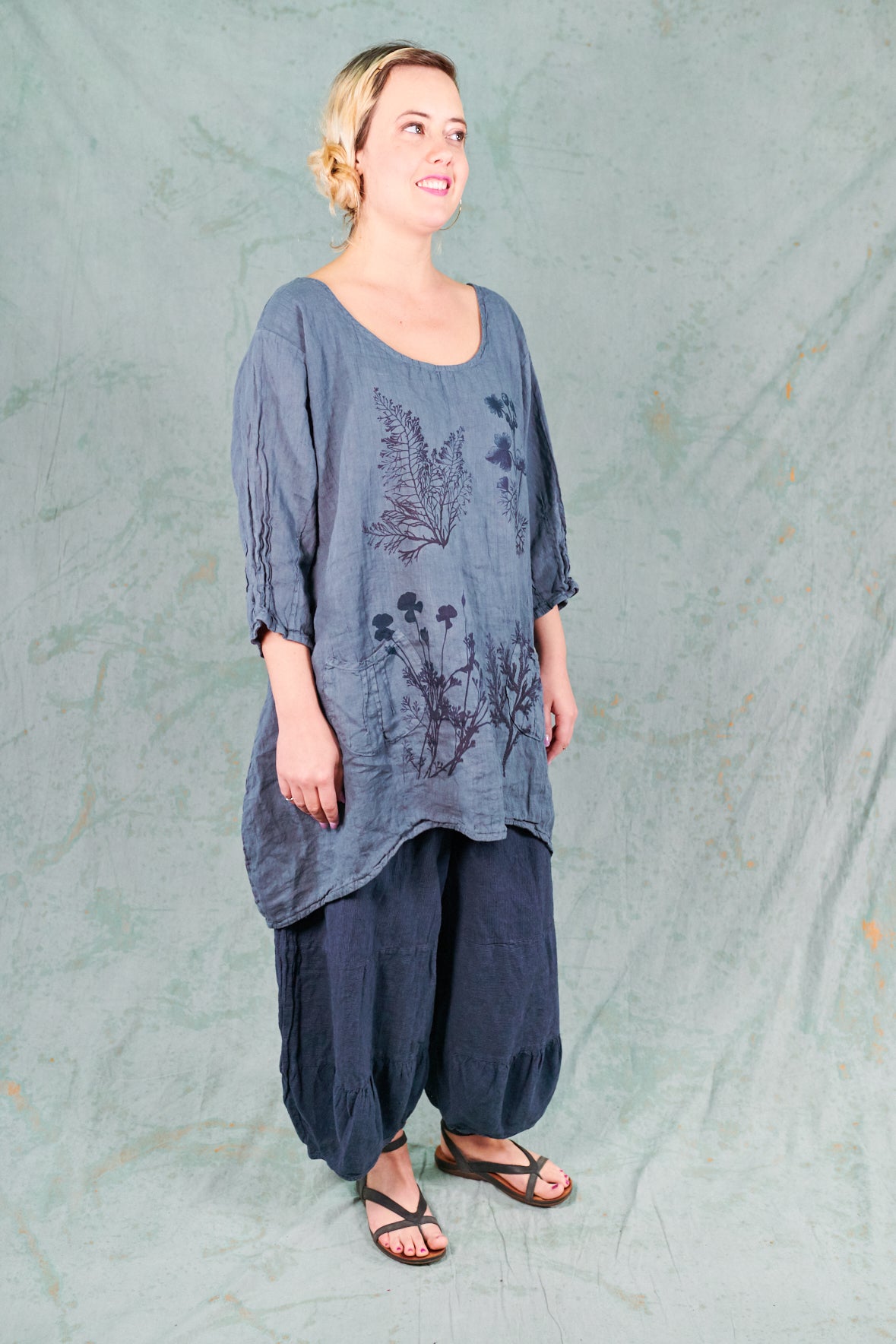 A pretty shape in spring weight linen. Has upcurved hem in front, dropped curve hem in back that is slightly longer. 2 sweet pockets. Not too long, hits at hip. Pretty, open scoop neck. Looks great with #4181 skirt or 3250 Mojo Pants. Arms feature slimming pinch sewn detailing. Sz one fits up to a size 14/16 well.