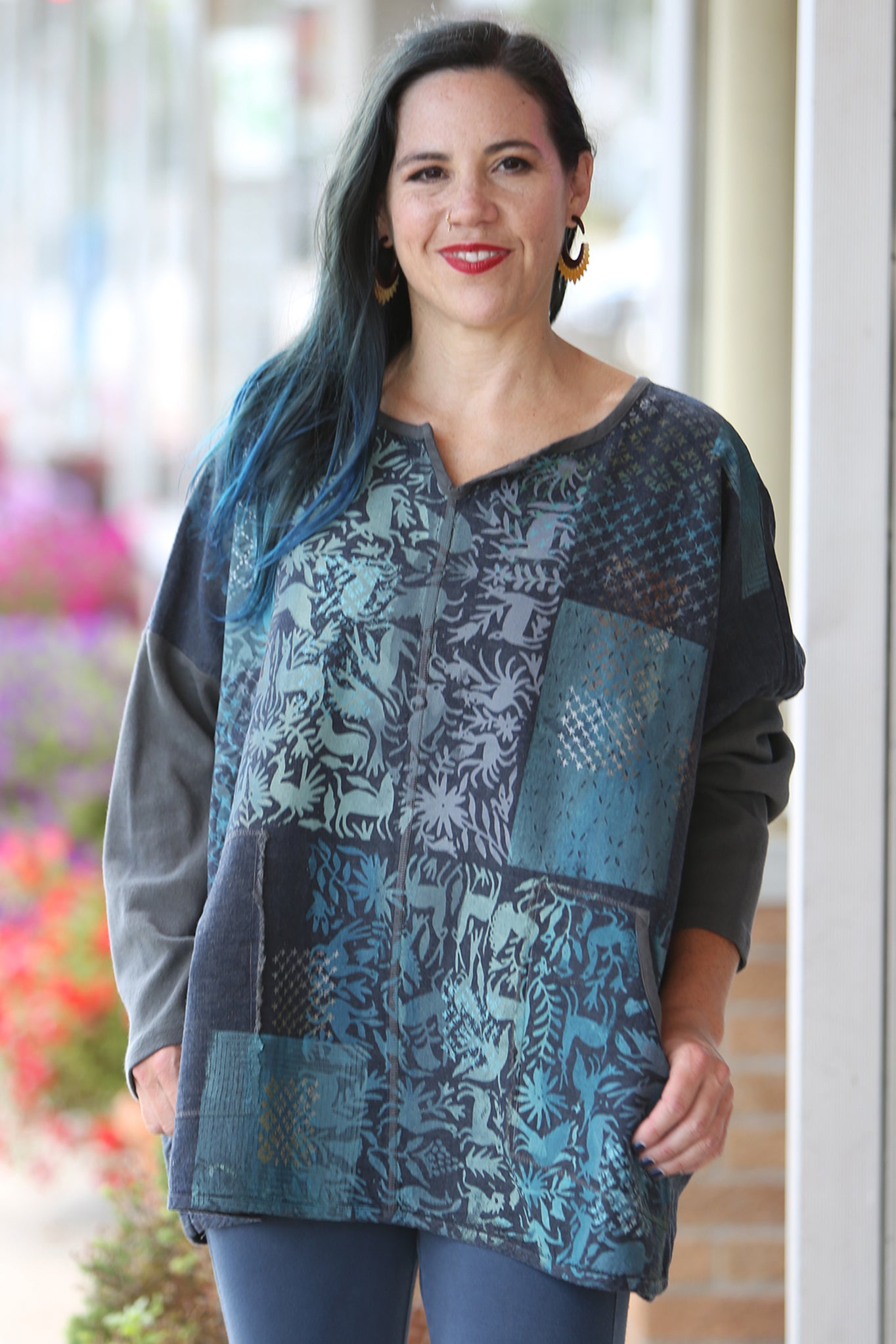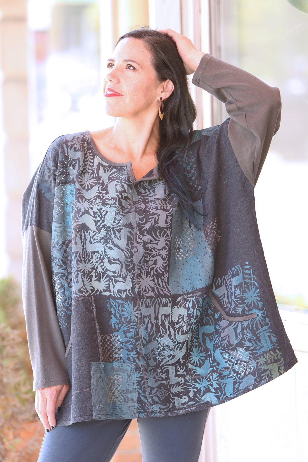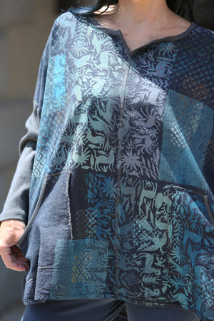 A favorite, fun top to pop over anything for added layer and dimension! The bodice is softest woven hemp in denim-dye washes, and the contrasting sleeves are a comfortable cotton knit. The cut-out patch pockets, contrast-stitch, and open placket add playfulness to this wonderfully eclectic and infinitely wearable piece!
