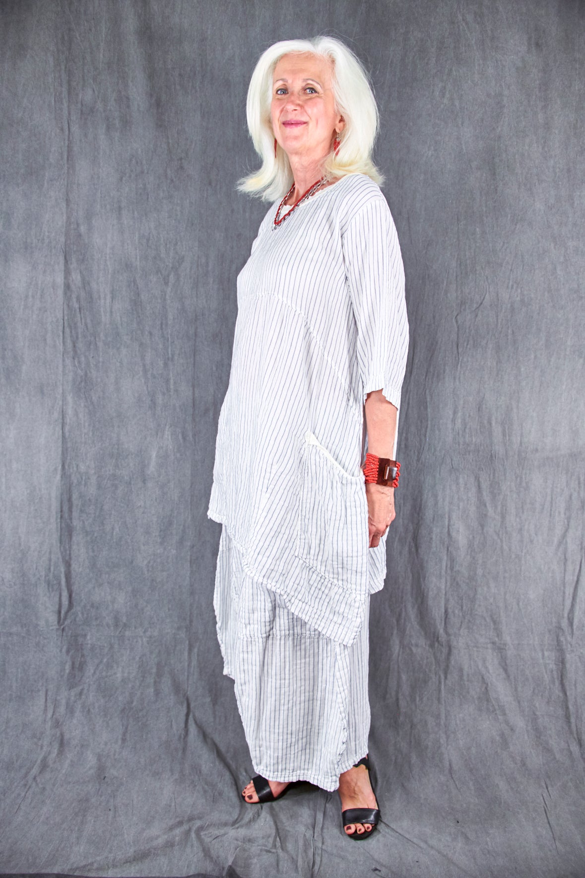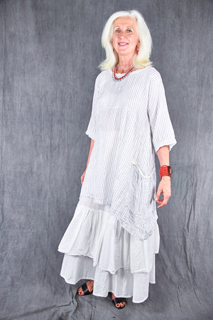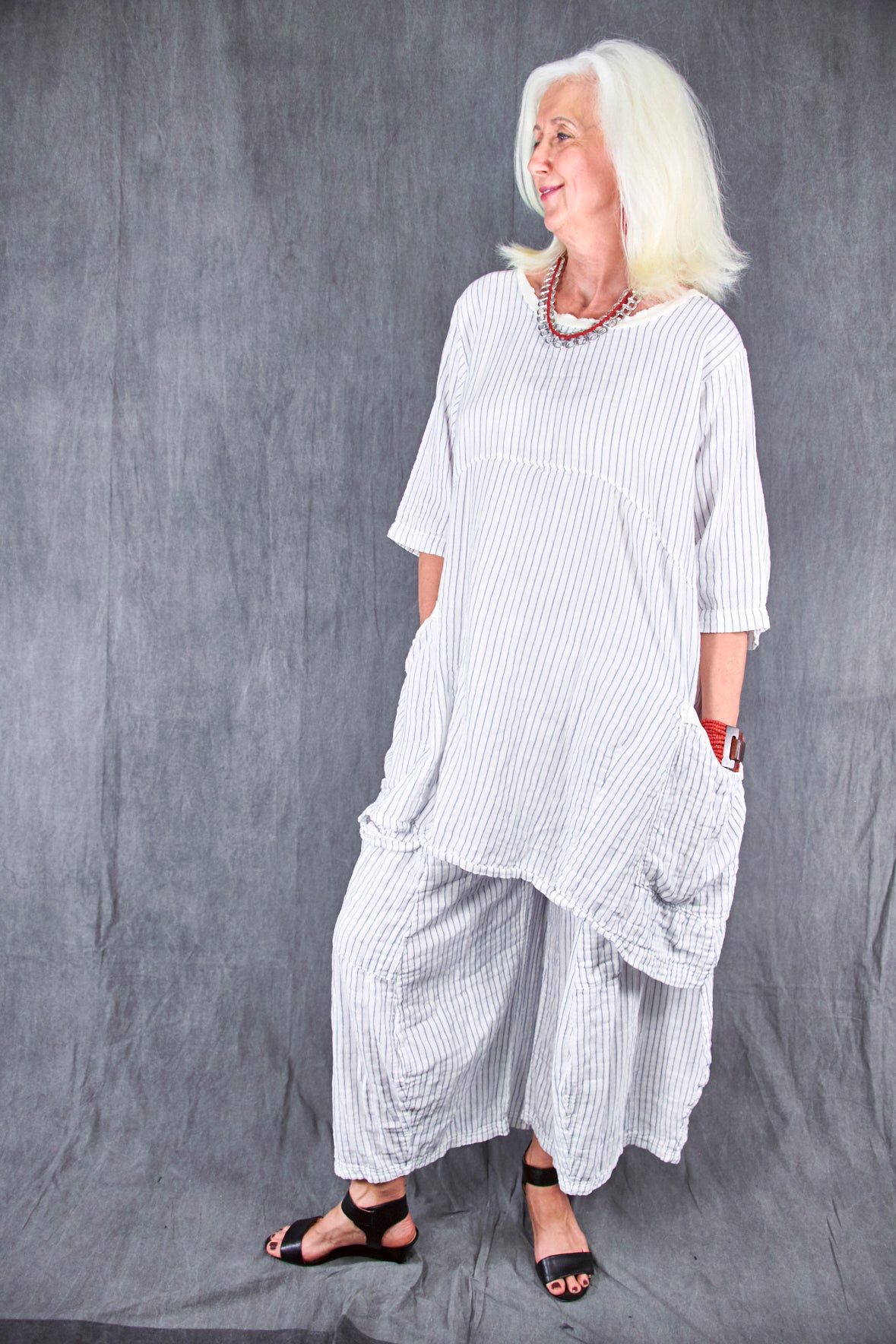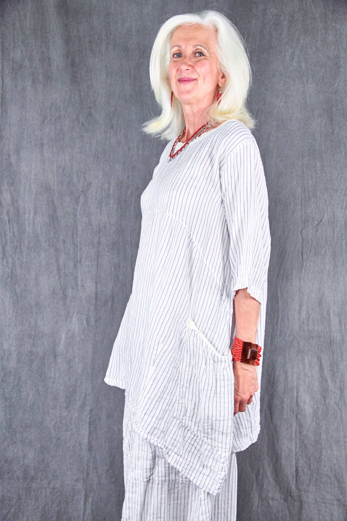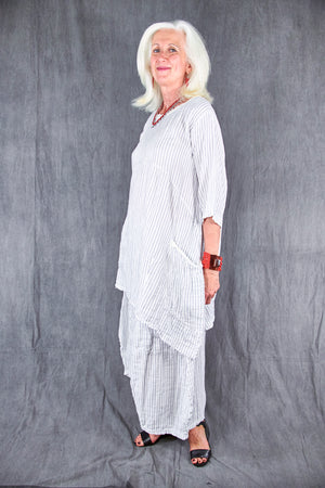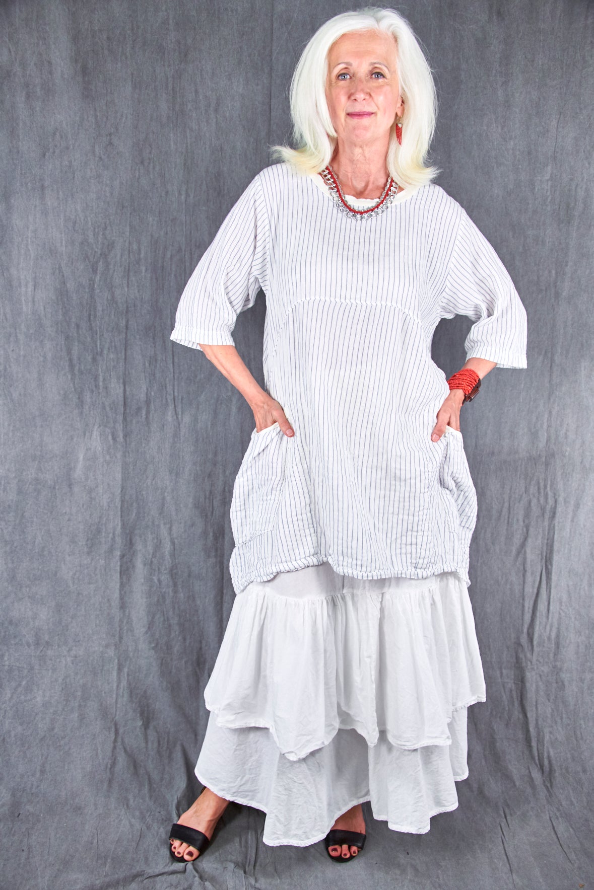 A lovely light summer tunic with pockets made from cool double gauze with sweet subtle stripes in a soft denim blue.