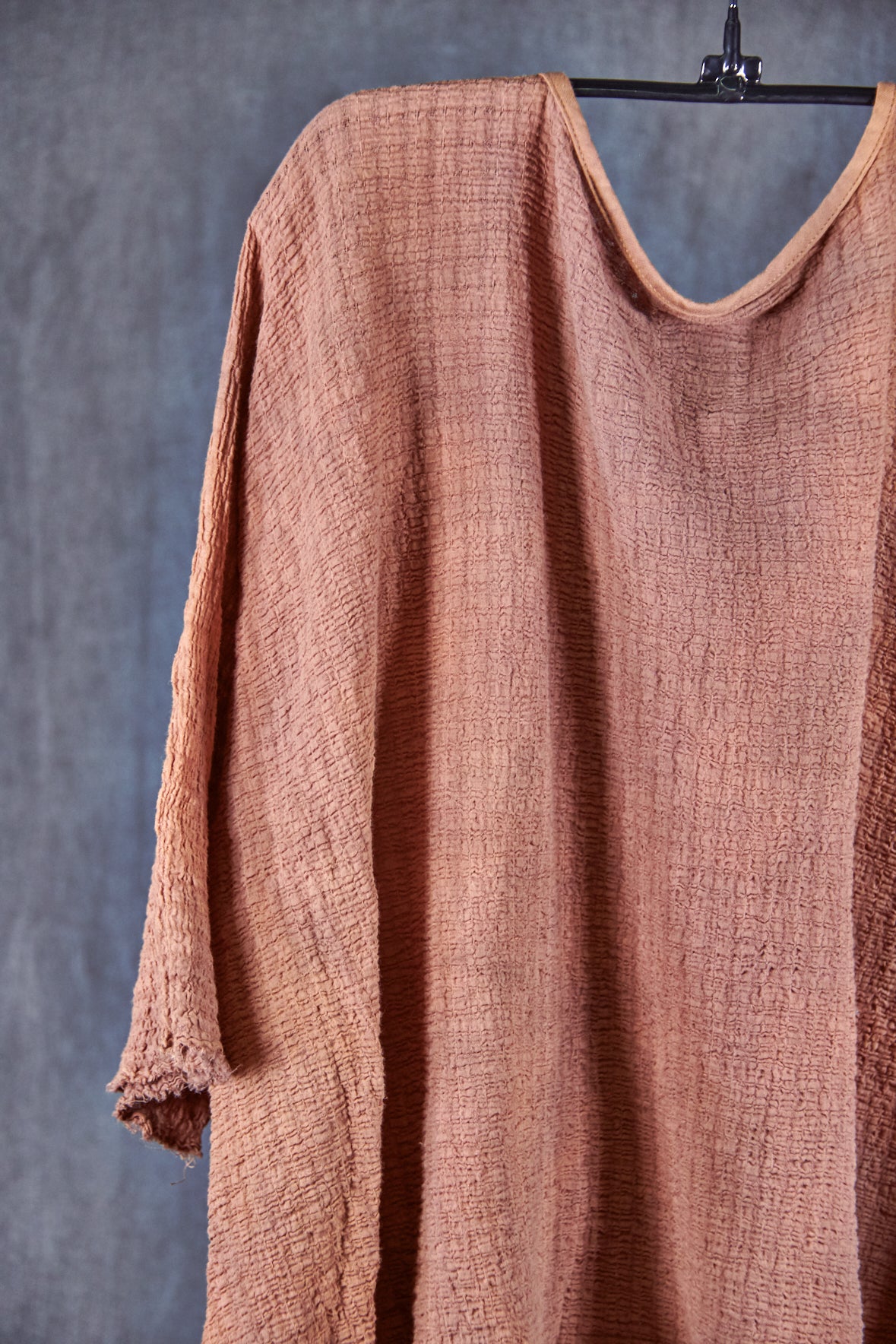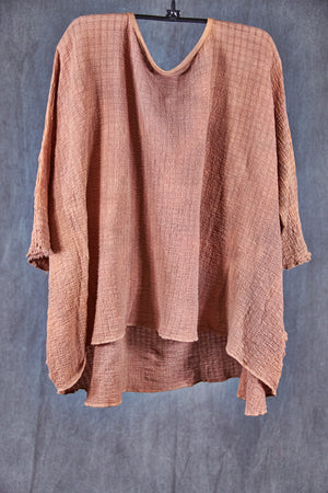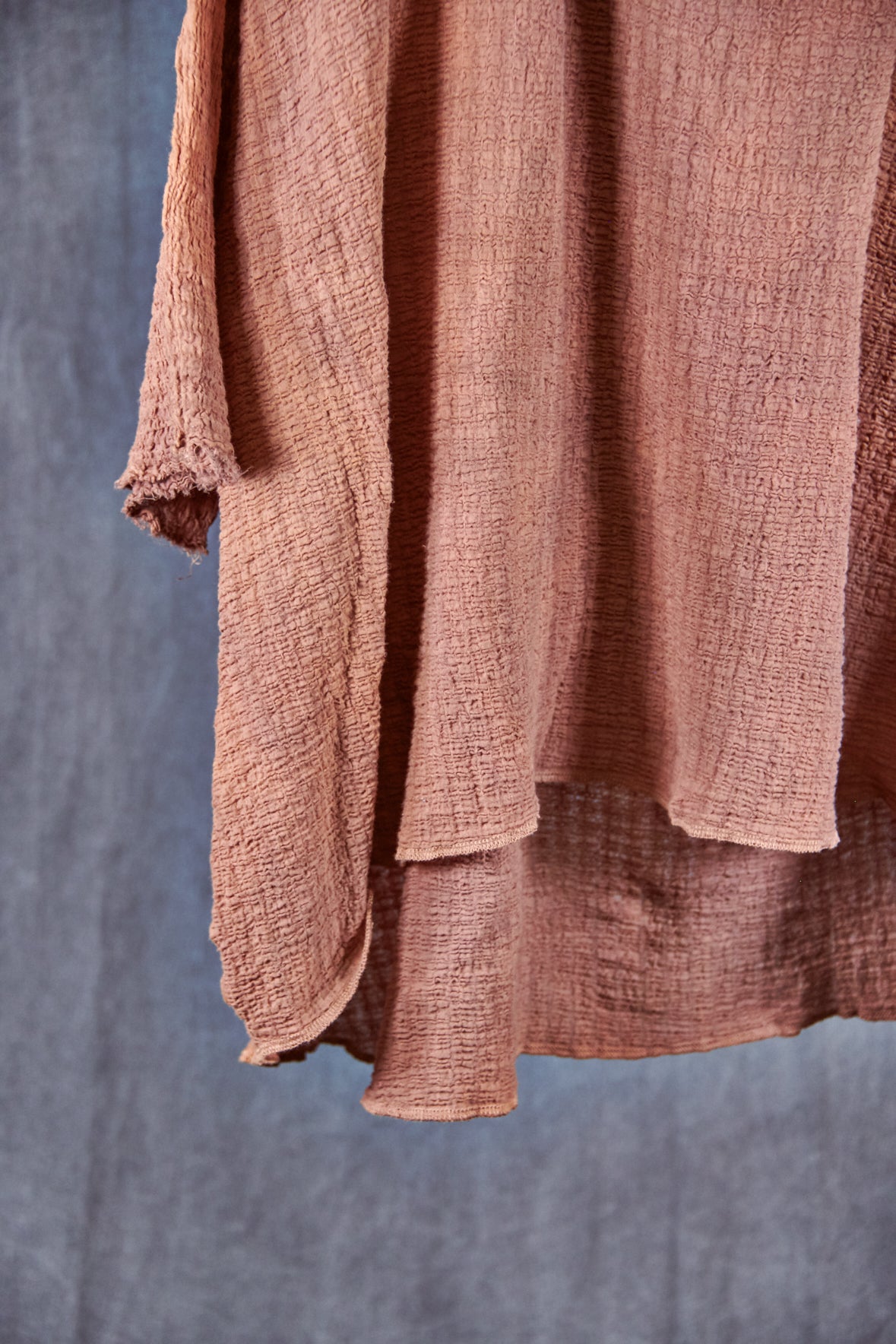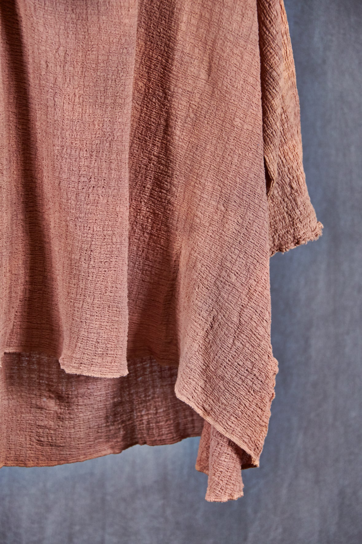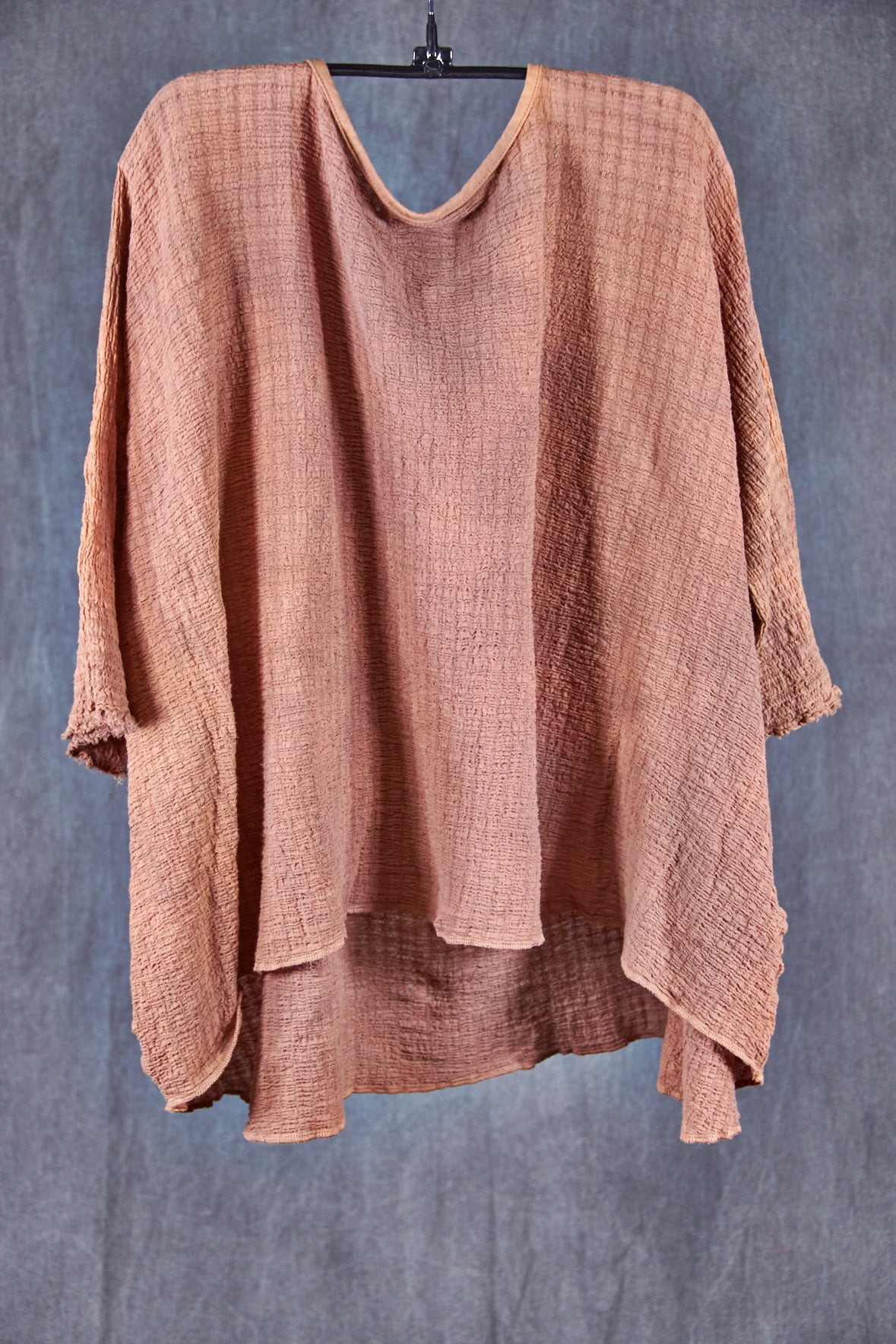 This hand dyed tunic has a thread of lycra which causes it to pucker when dyed, creating a wonderful textural appeal. Hand dyed, each piece will vary in tone and texture.