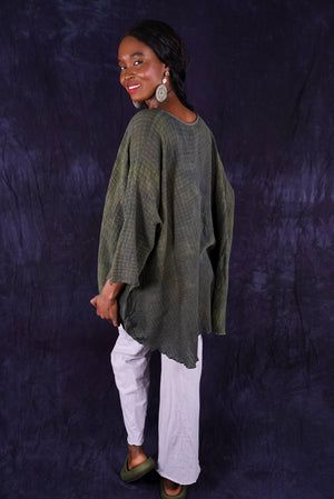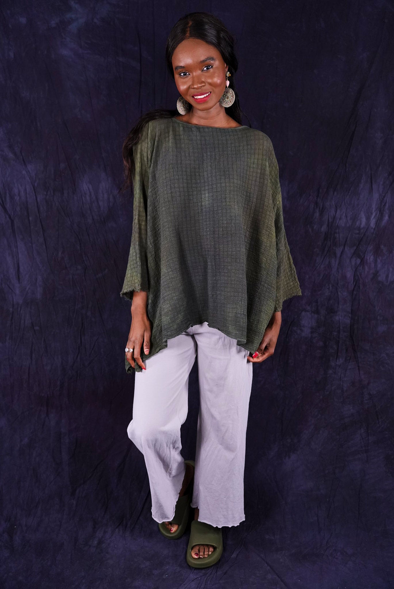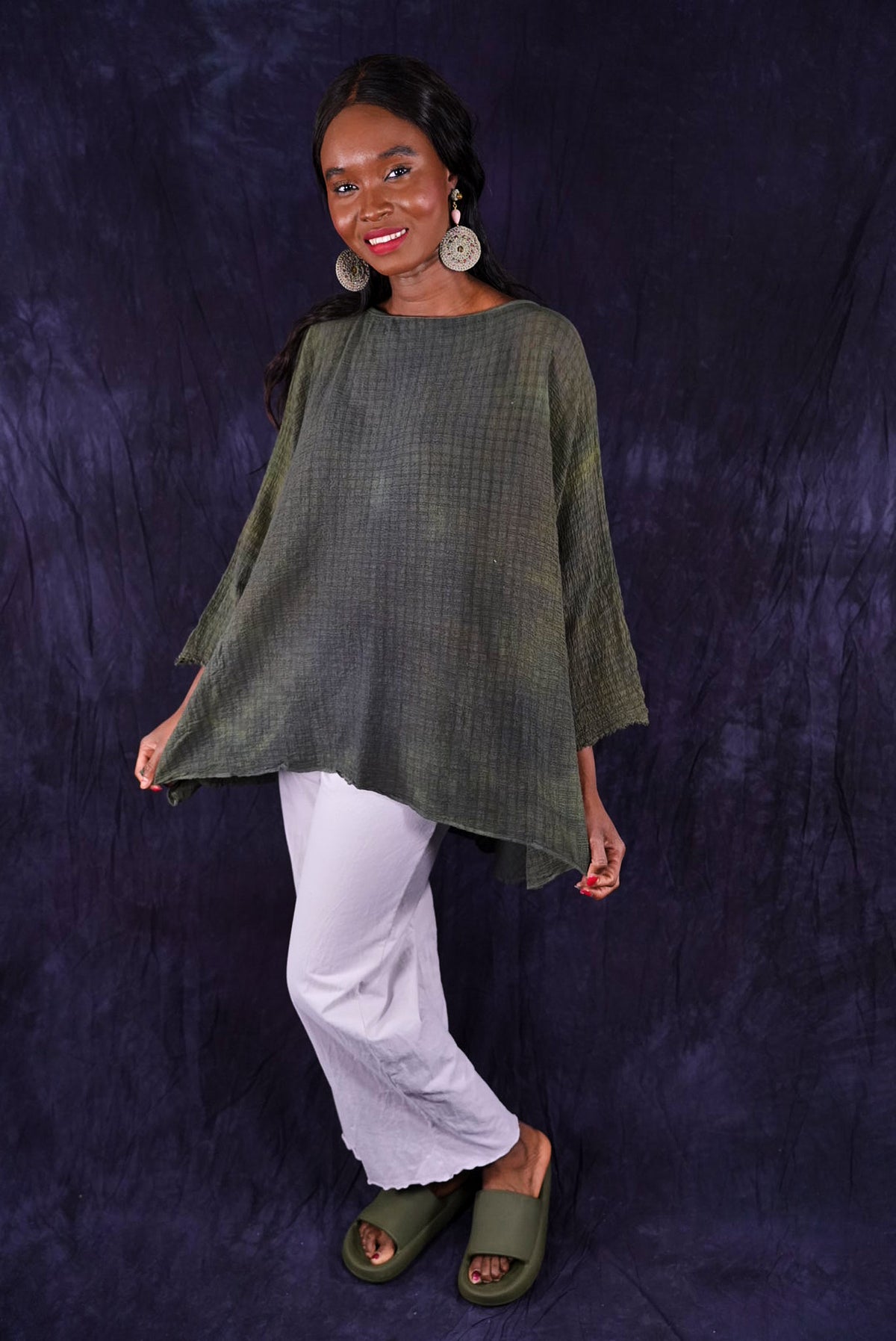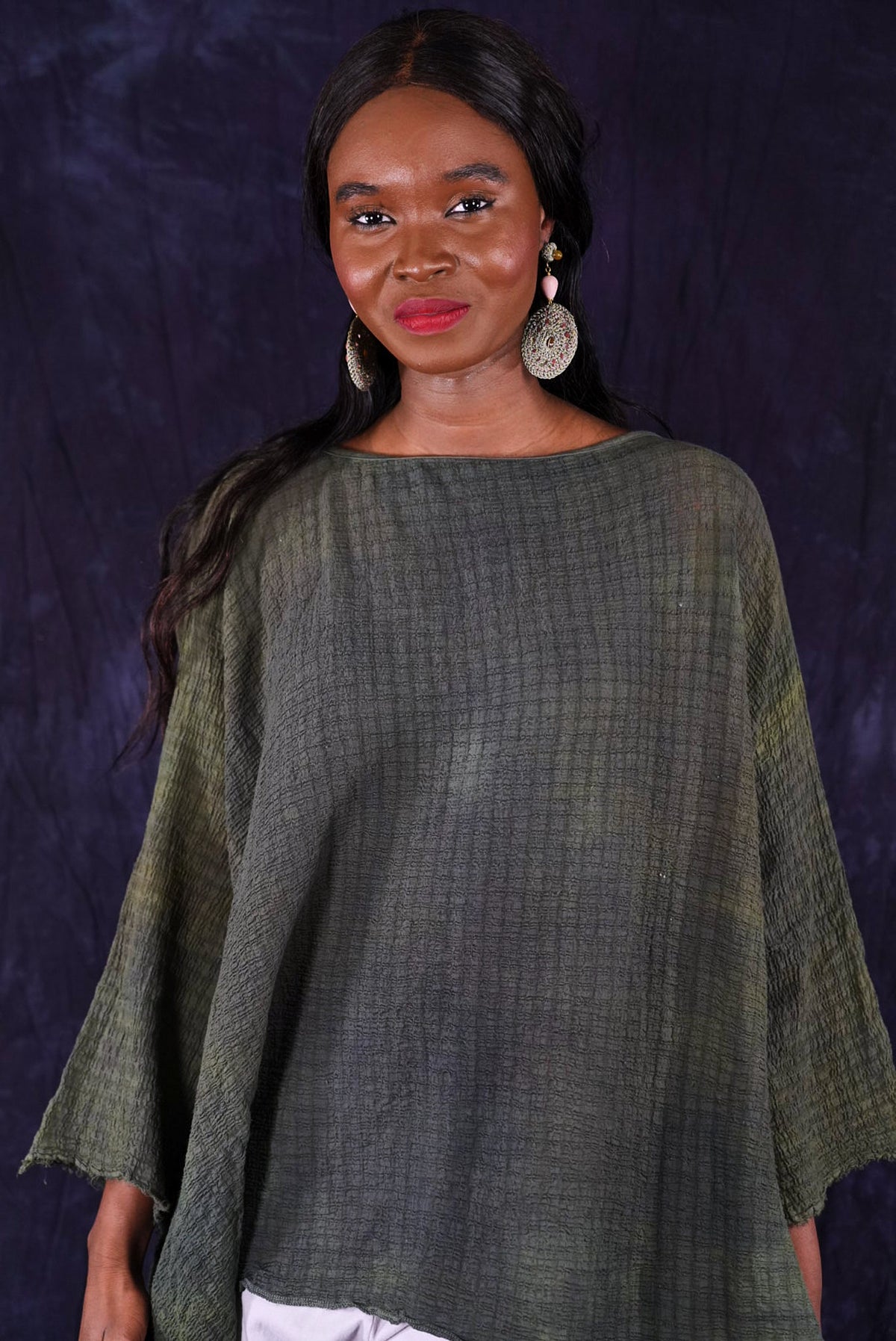 This hand dyed tunic has a thread of lycra which causes it to pucker when dyed, creating a wonderful textural appeal. Hand dyed, each piece will vary in tone and texture.