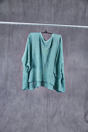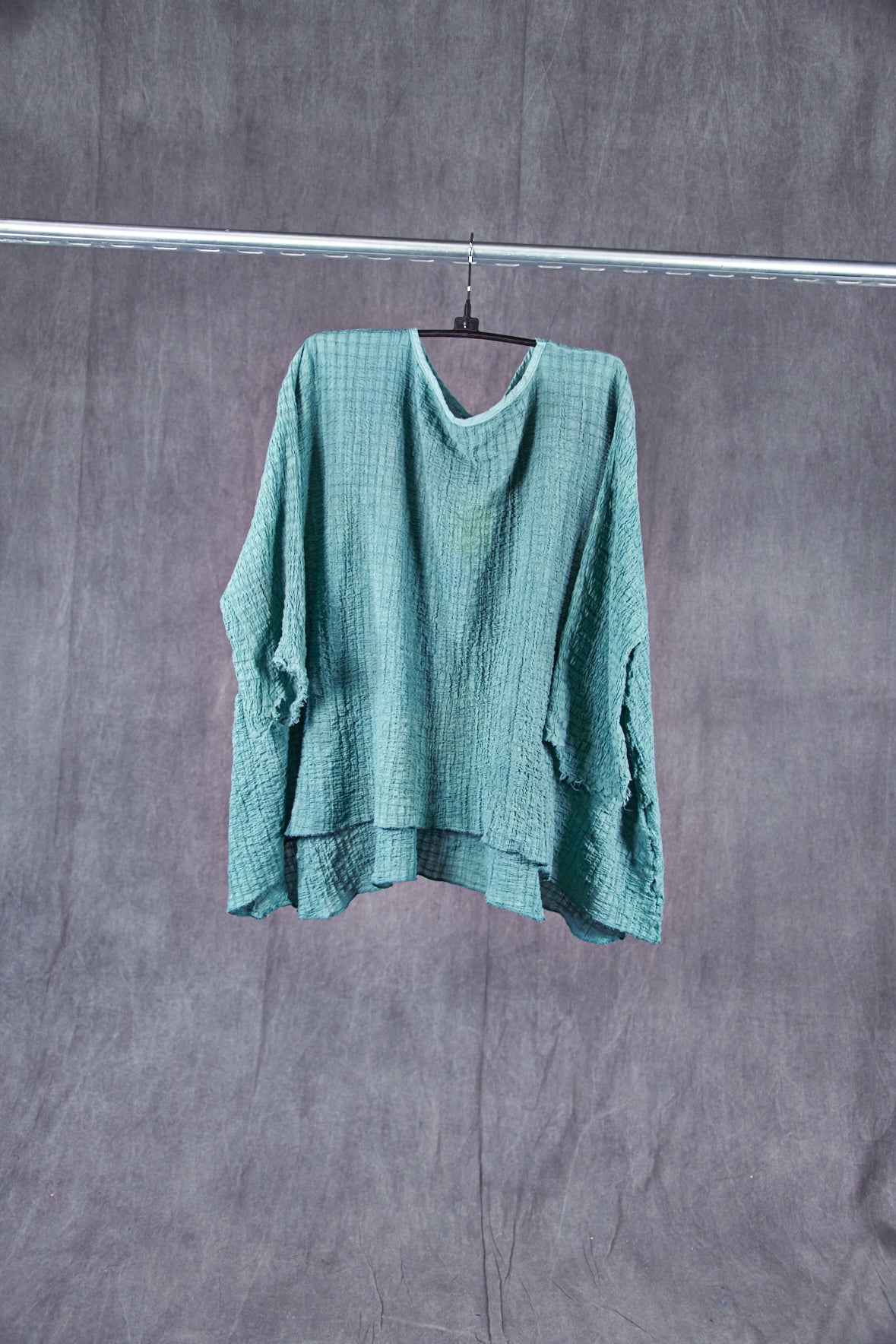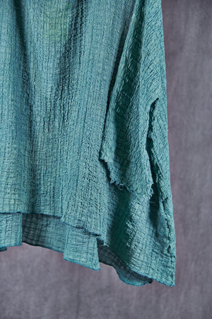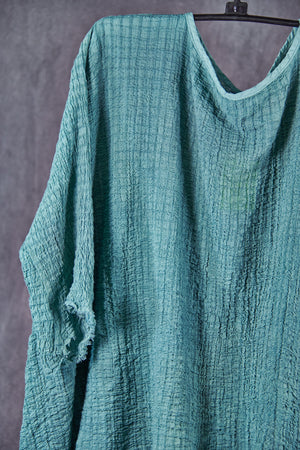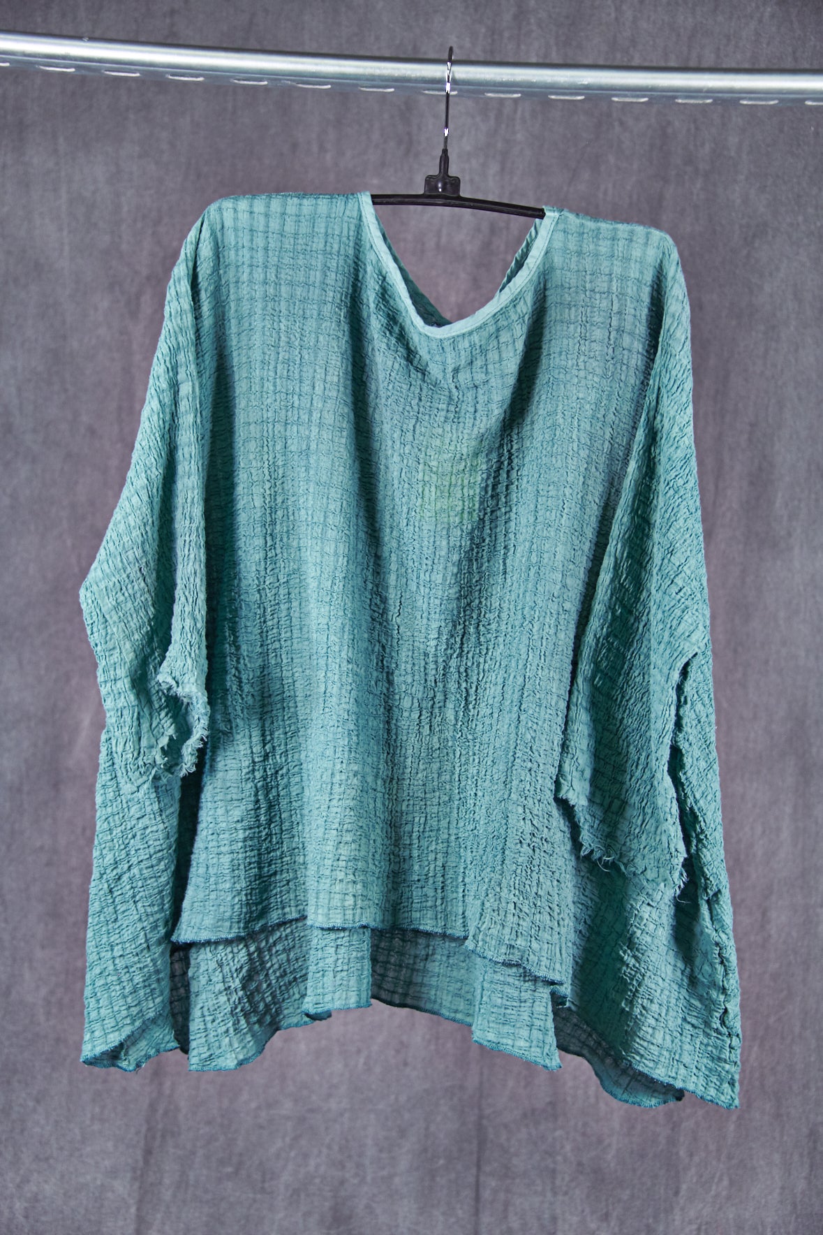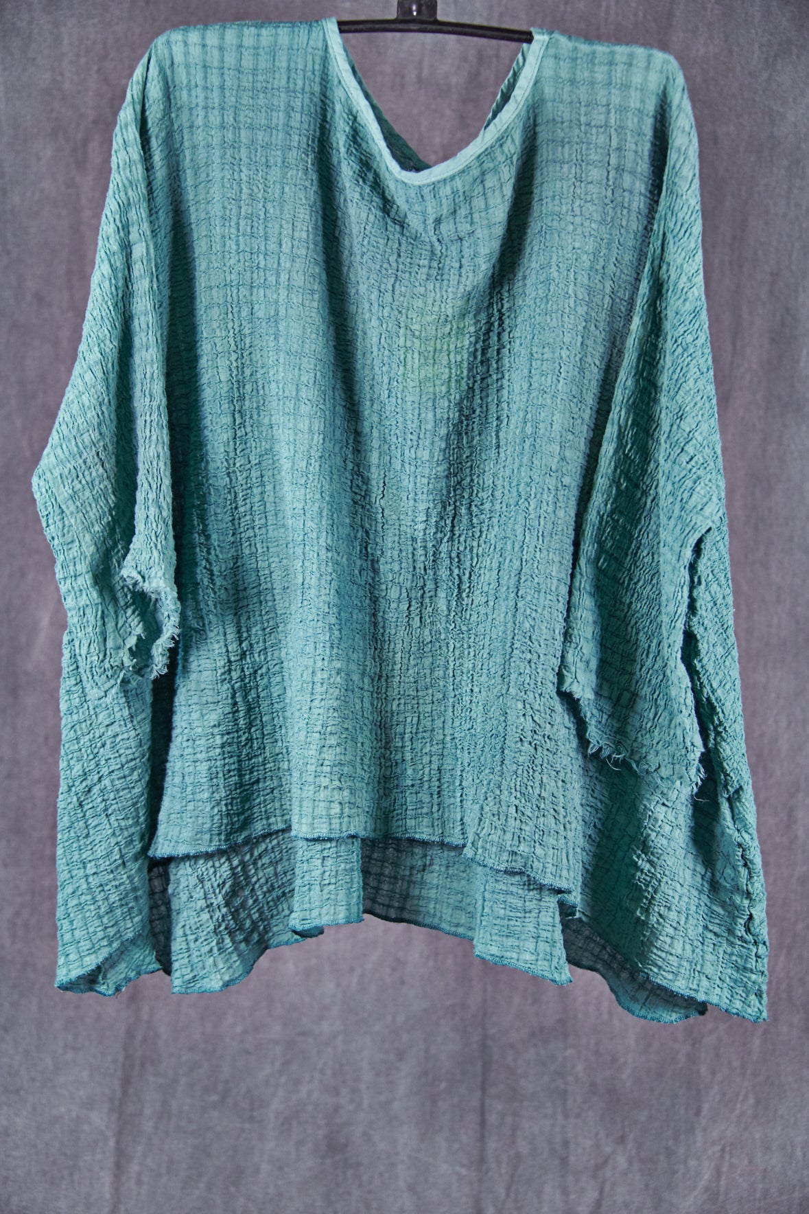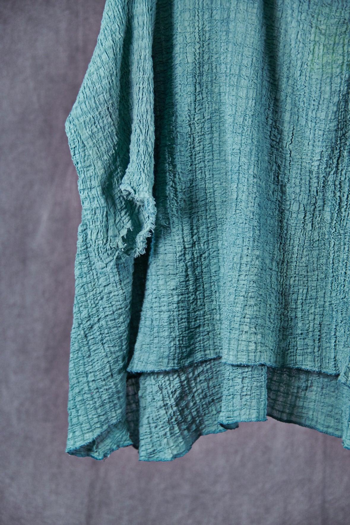This hand dyed tunic has a thread of lycra which causes it to pucker when dyed, creating a wonderful textural appeal. Hand dyed, each piece will vary in tone and texture.