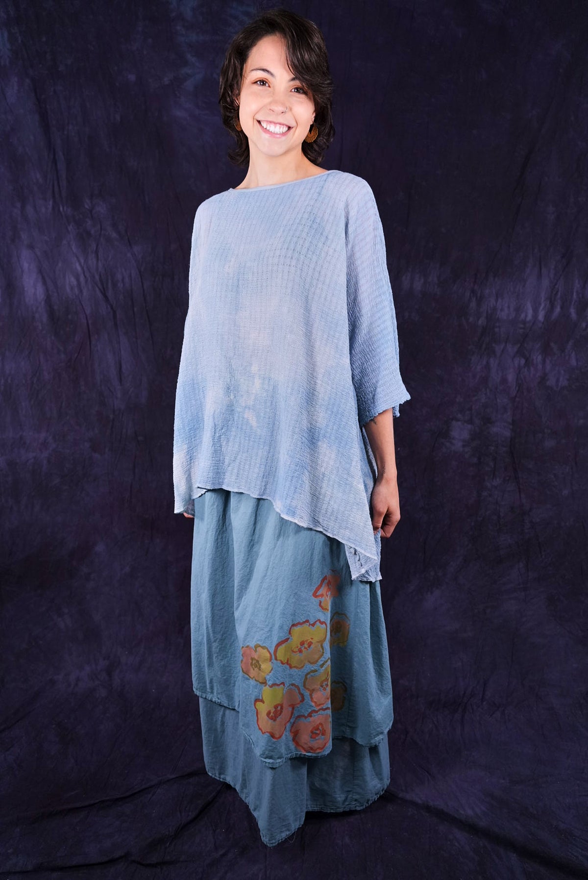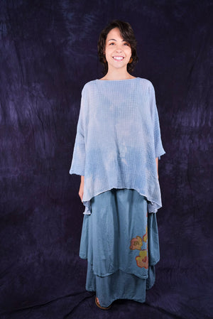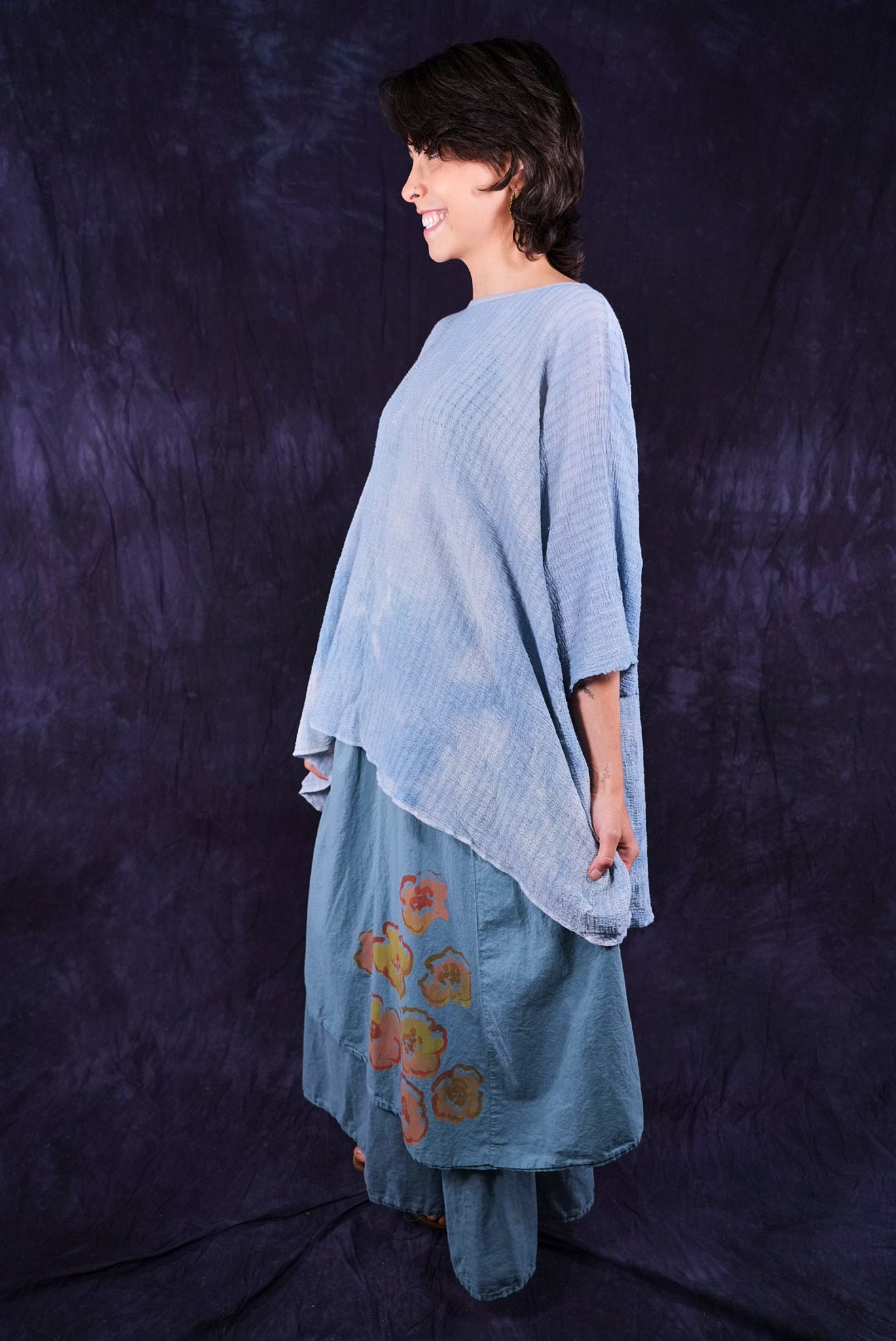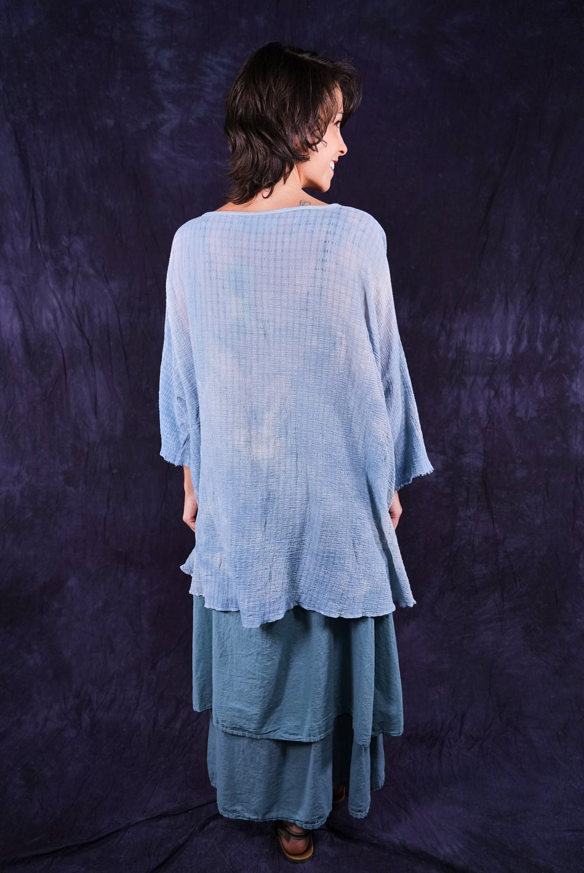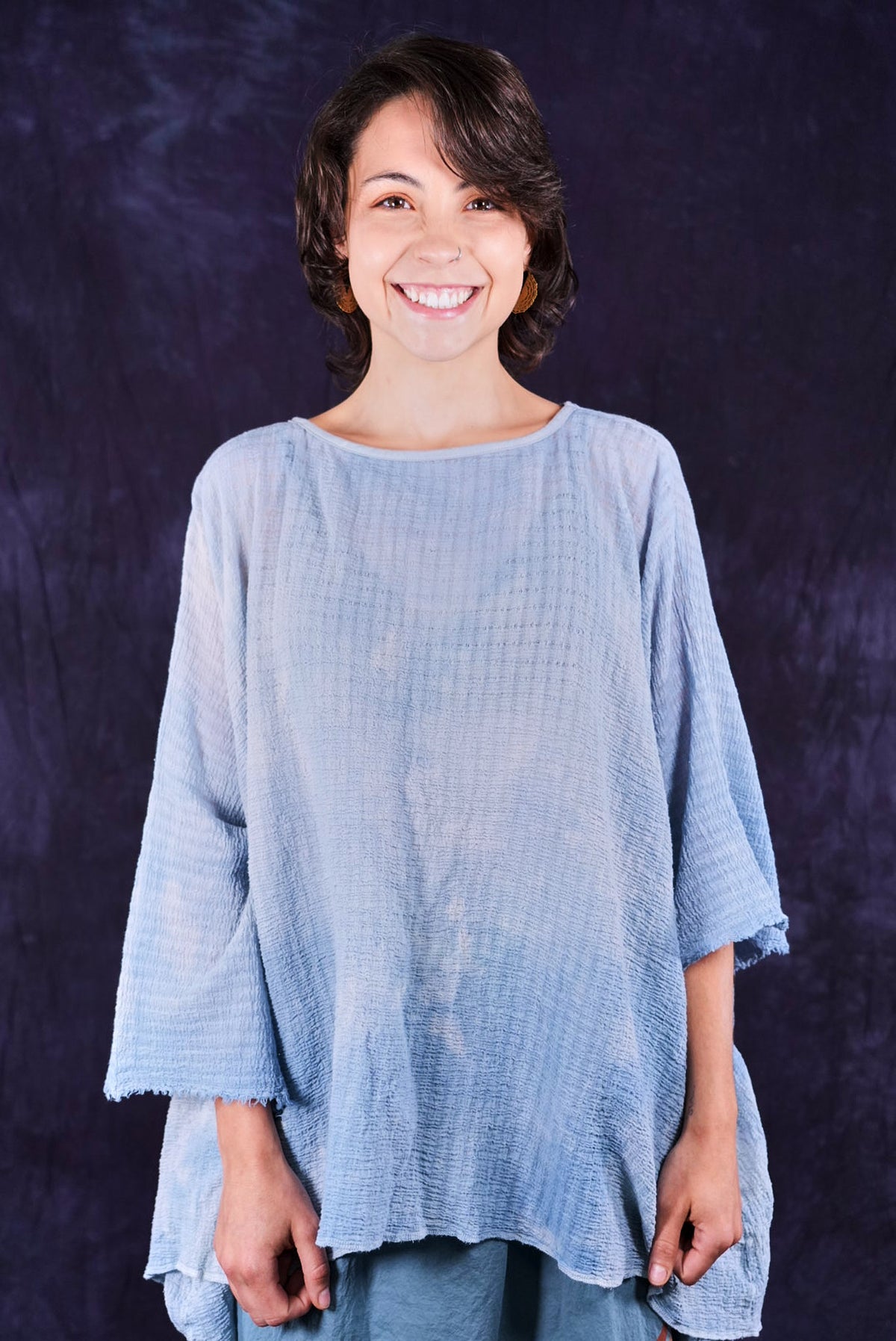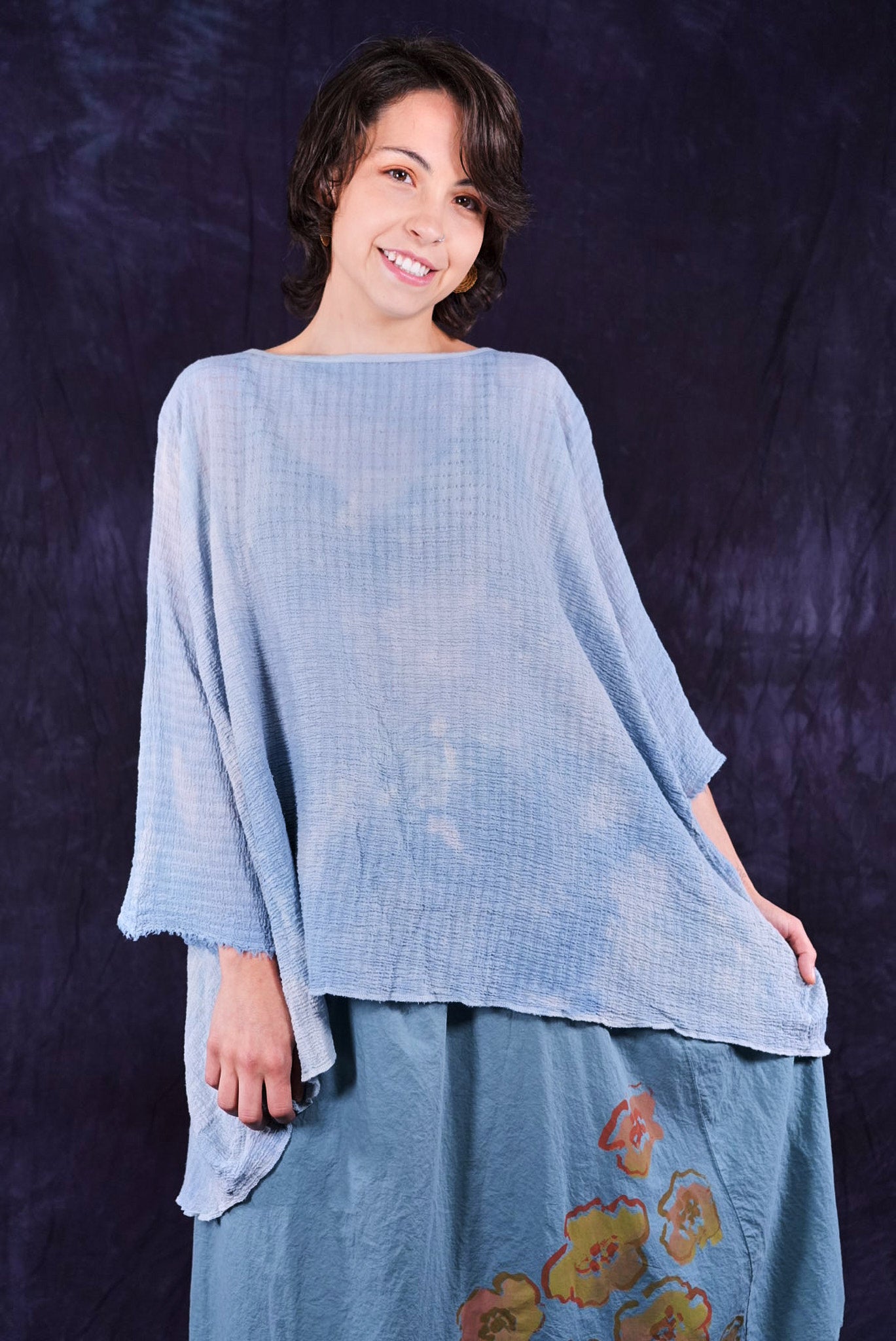 This hand dyed tunic has a thread of lycra which causes it to pucker when dyed, creating a wonderful textural appeal. Hand dyed, each piece will vary in tone and texture.
