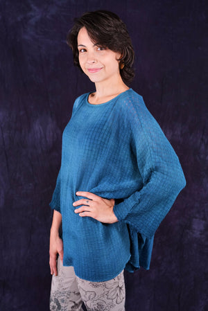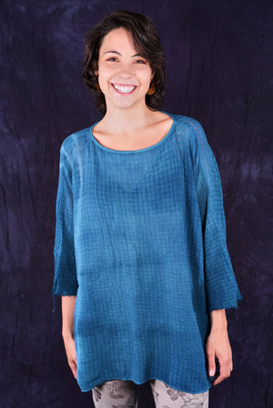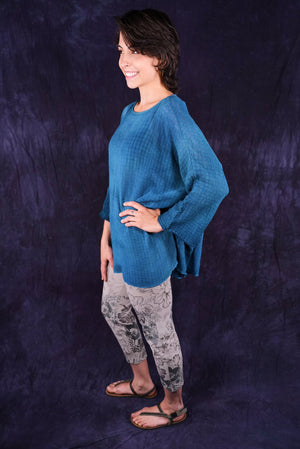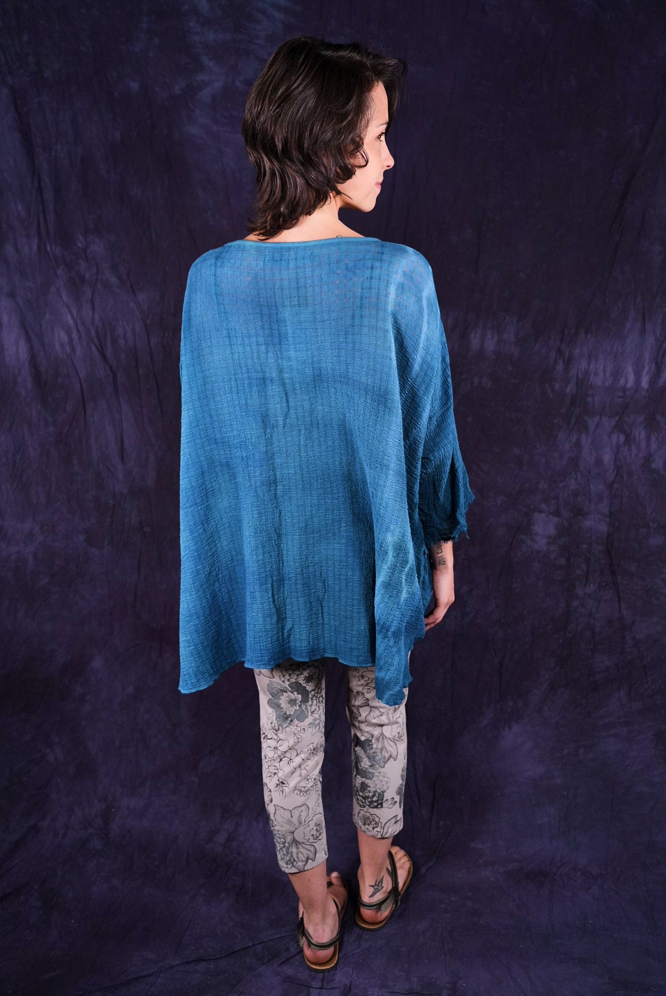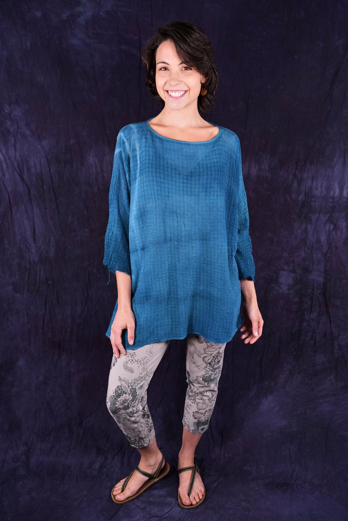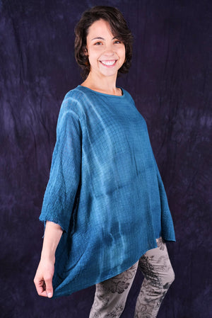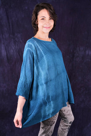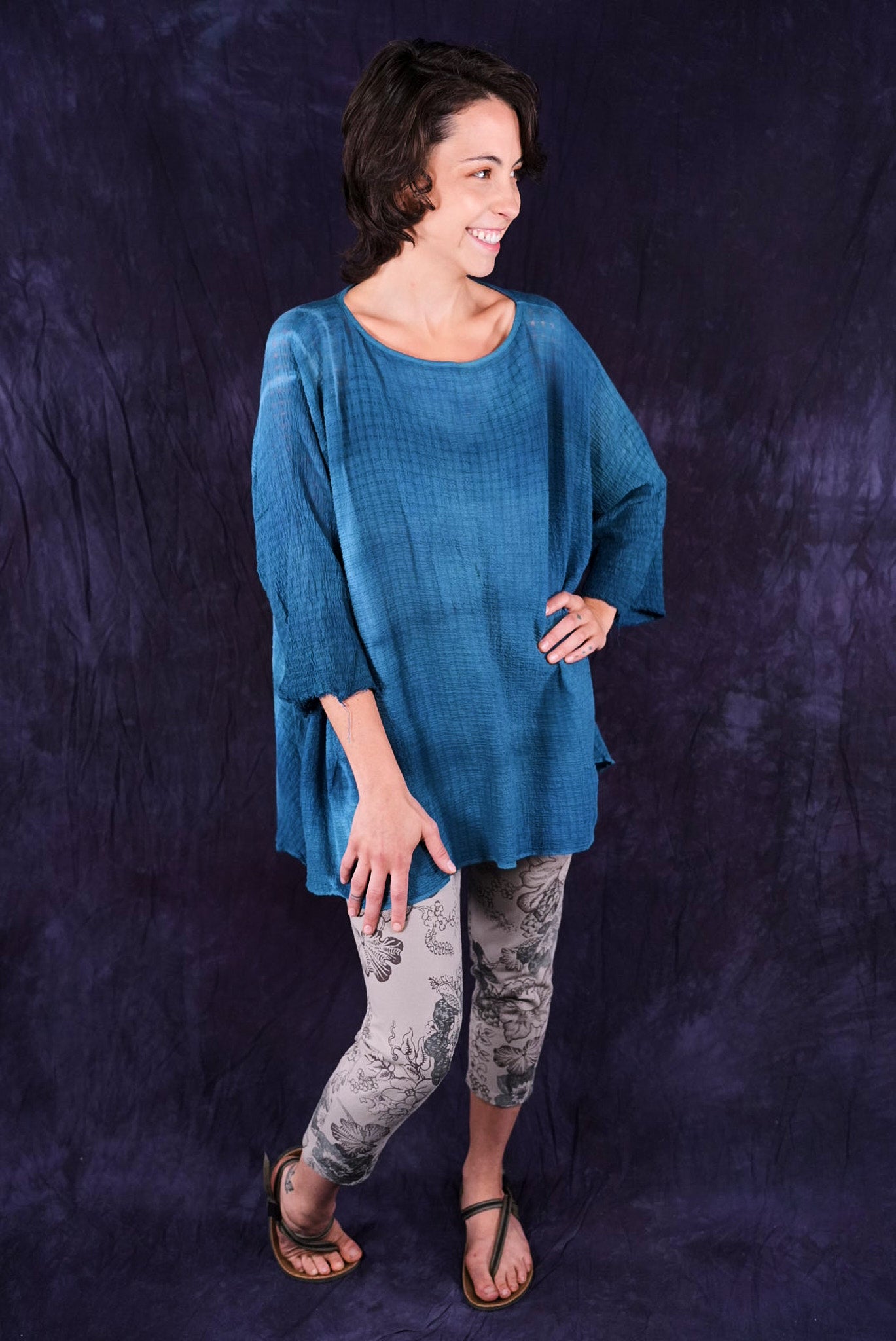 This hand dyed tunic has a thread of lycra which causes it to pucker when dyed, creating a wonderful textural appeal. Hand dyed, each piece will vary in tone and texture.