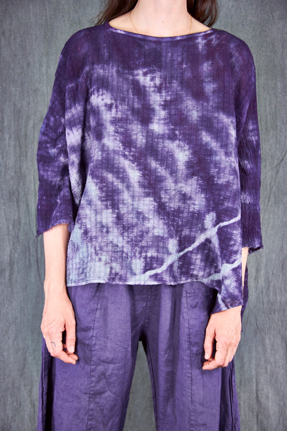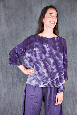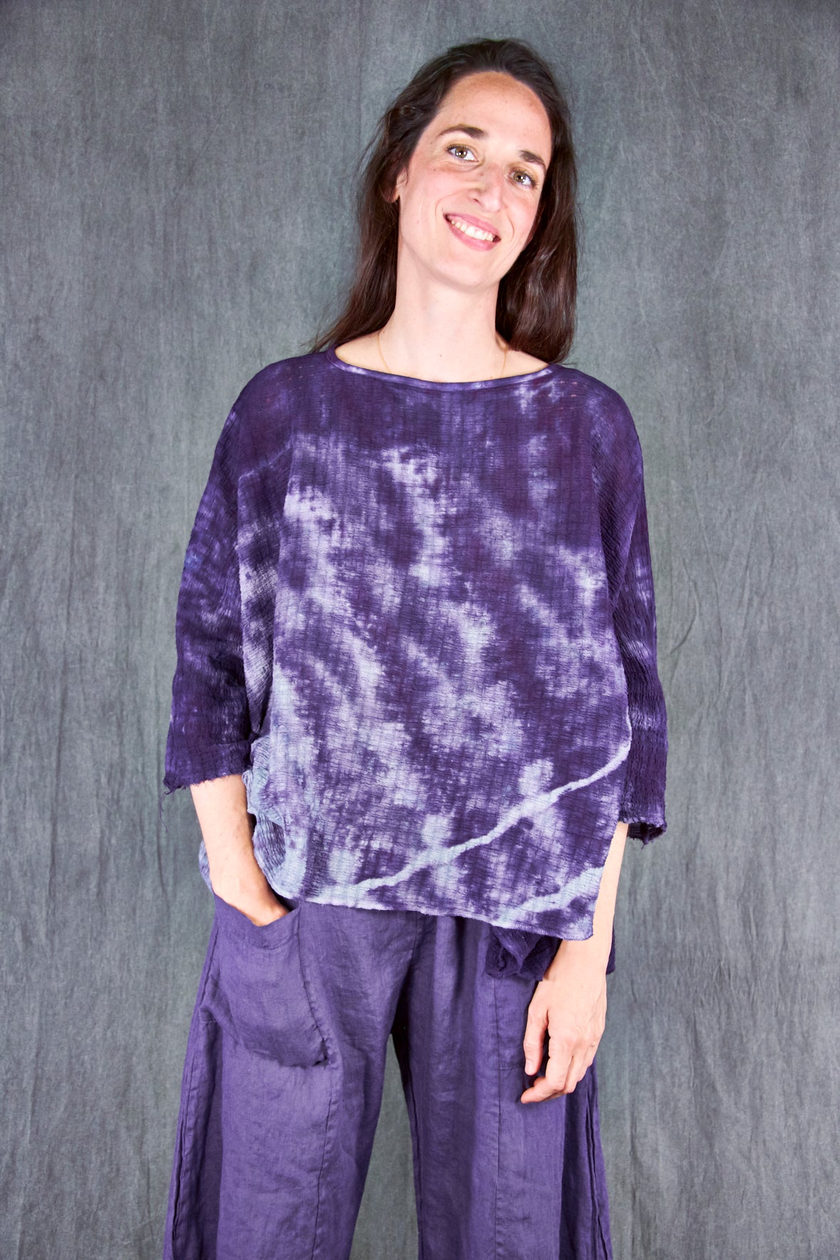 This hand dyed tunic has a thread of lycra which causes it to pucker when dyed, creating a wonderful textural appeal. Hand dyed, each piece will vary in tone and texture.