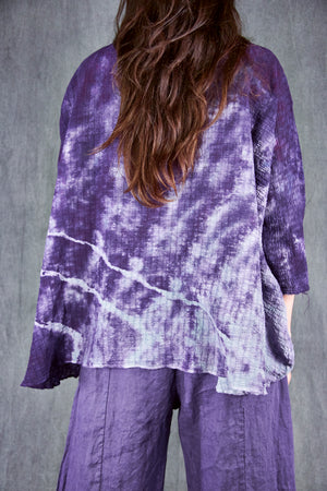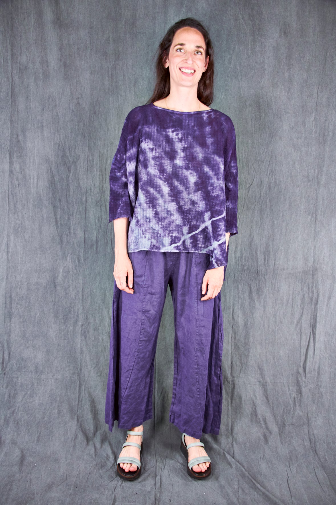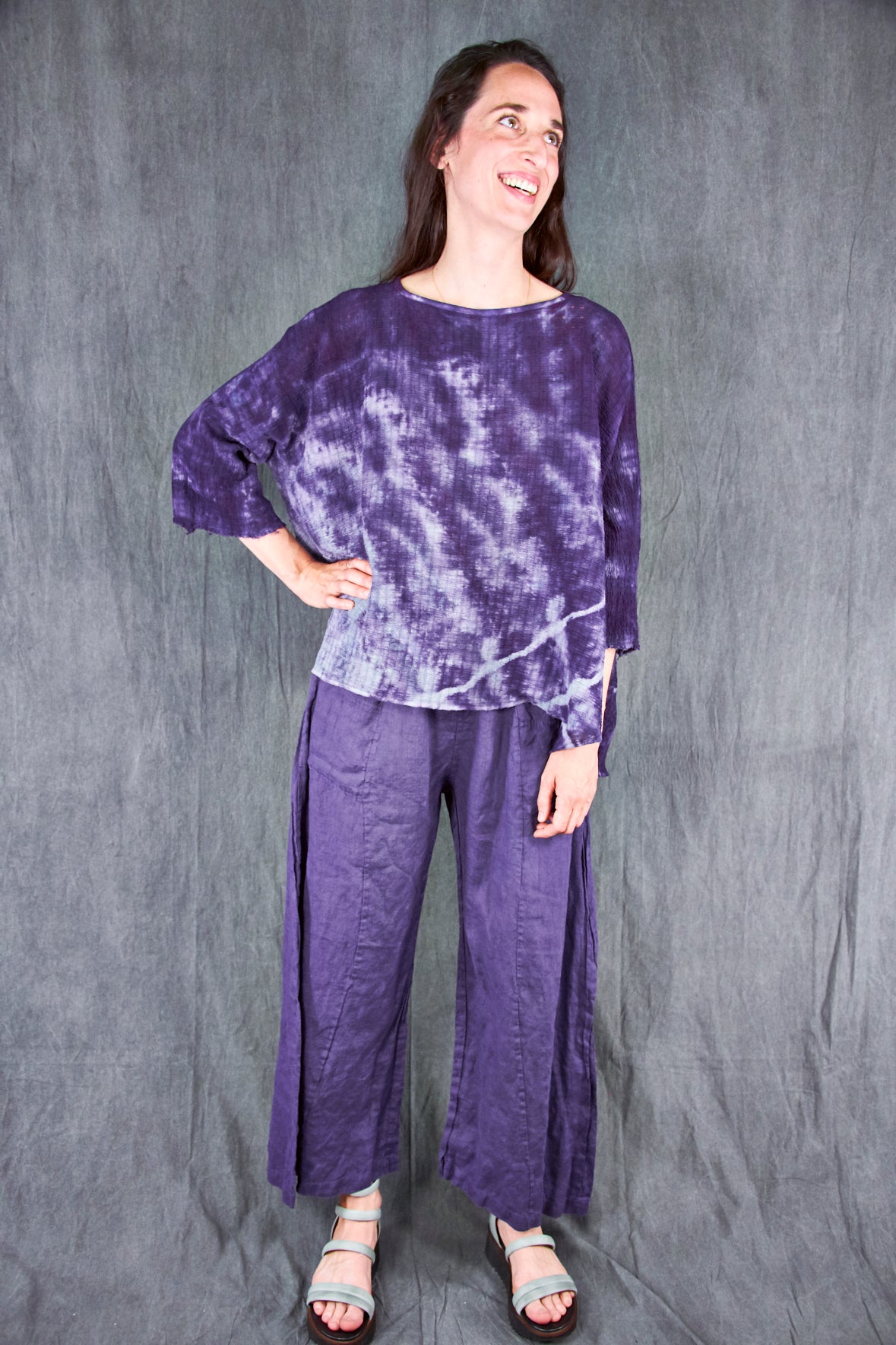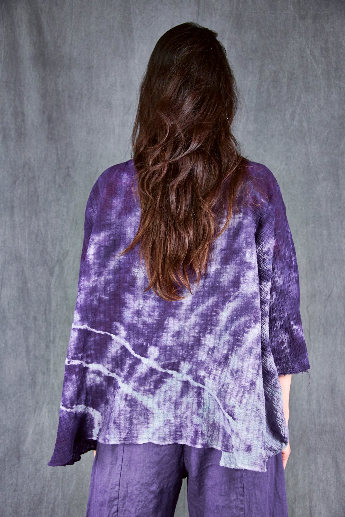 This hand dyed tunic has a thread of lycra which causes it to pucker when dyed, creating a wonderful textural appeal. Hand dyed, each piece will vary in tone and texture.