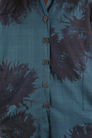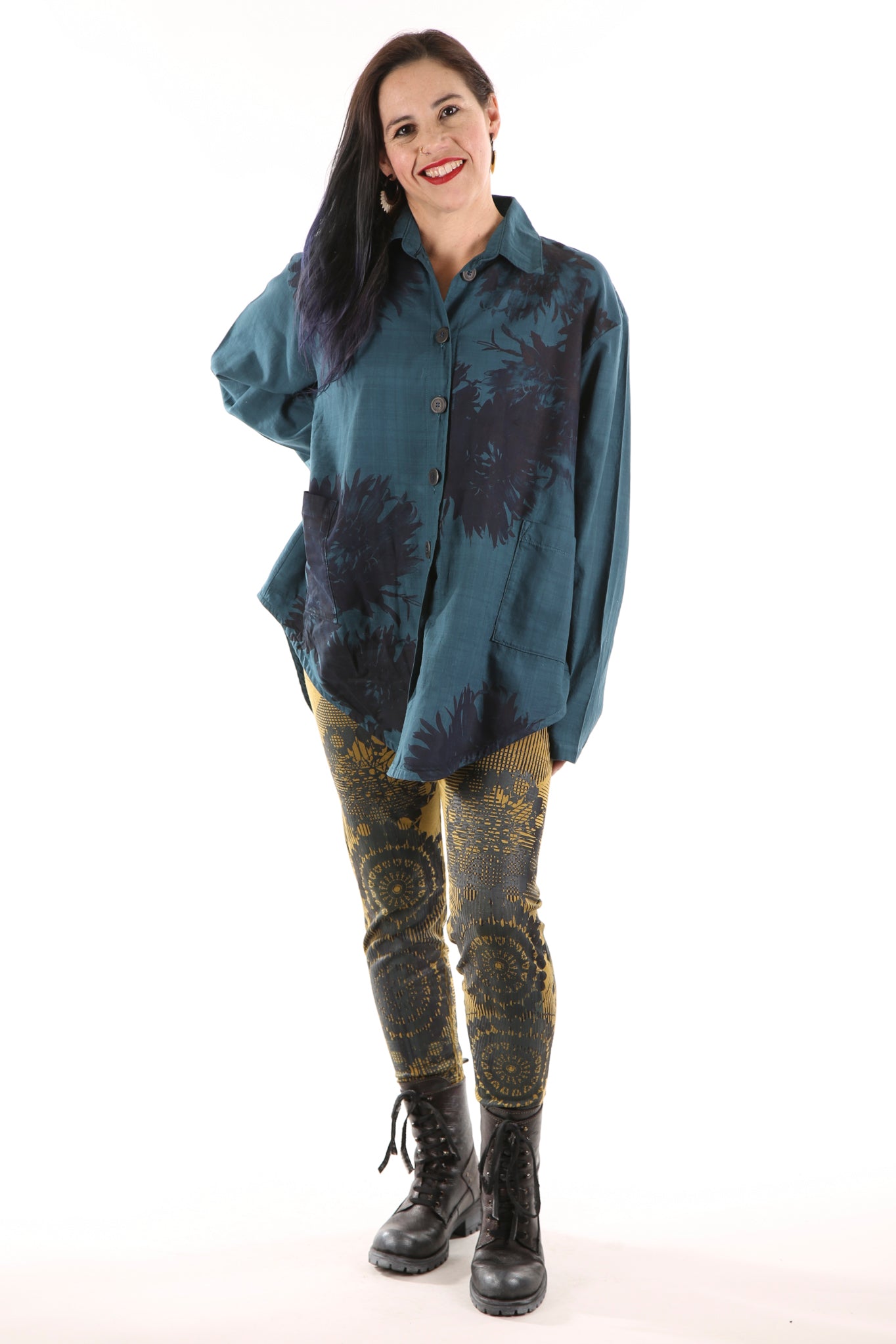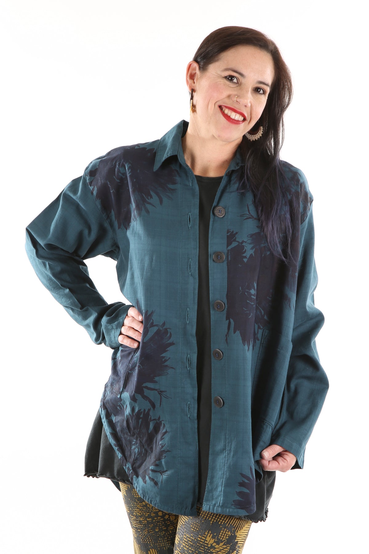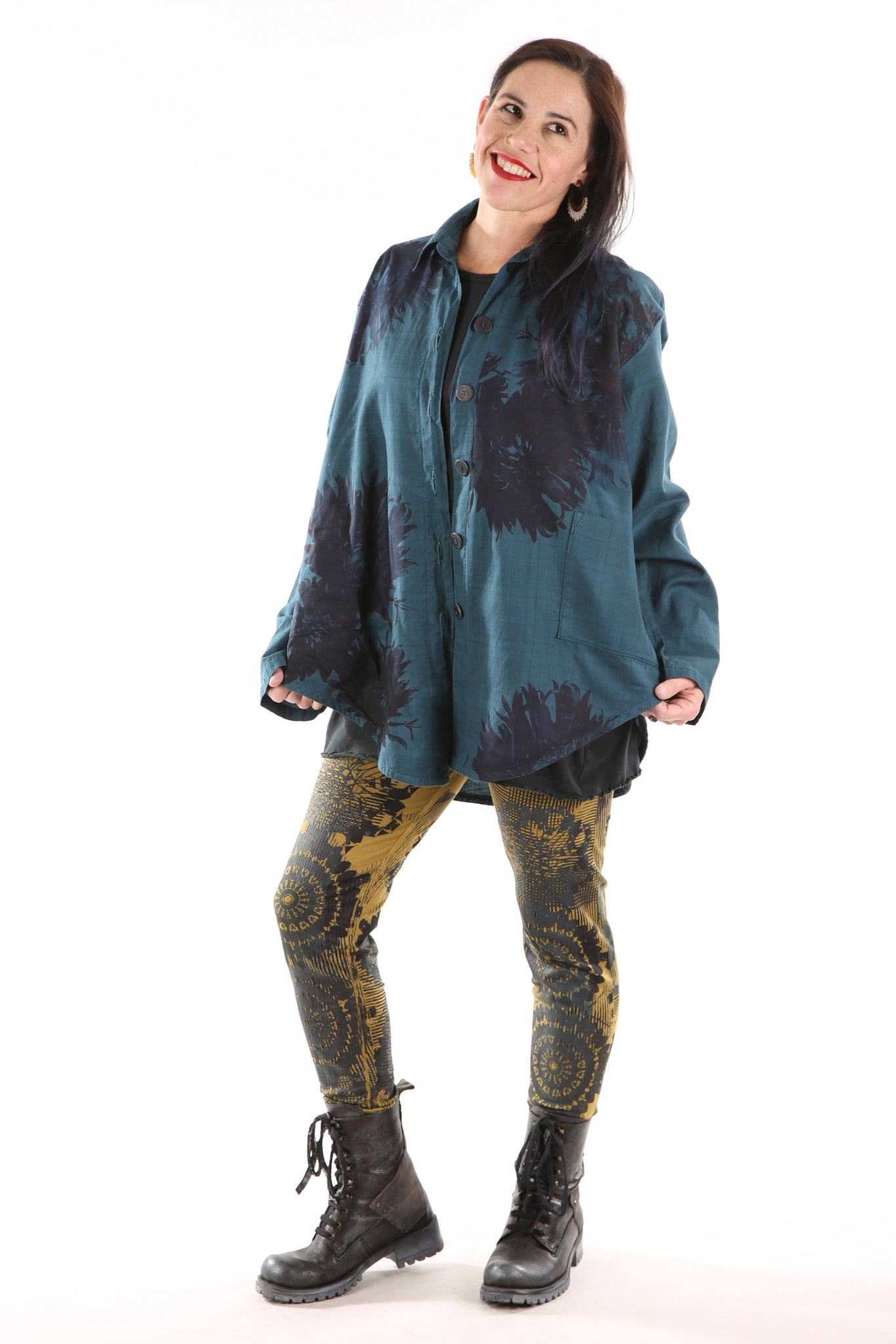 A new style you can wear as a shirt or a light shirt-jacket. Hand sewn buttons down the front, and has two large patch pockets. Printed beautifully, see close up of thumbnail photo by clicking on the small eye icon. The fabric is a very soft high quality brushed cotton, which we have over dyed and which still retains a very subtle tonal plaid. Printed with tonal textures.