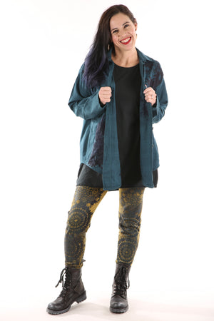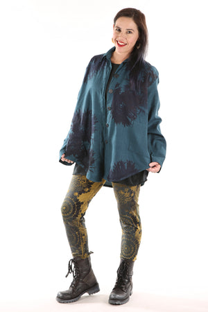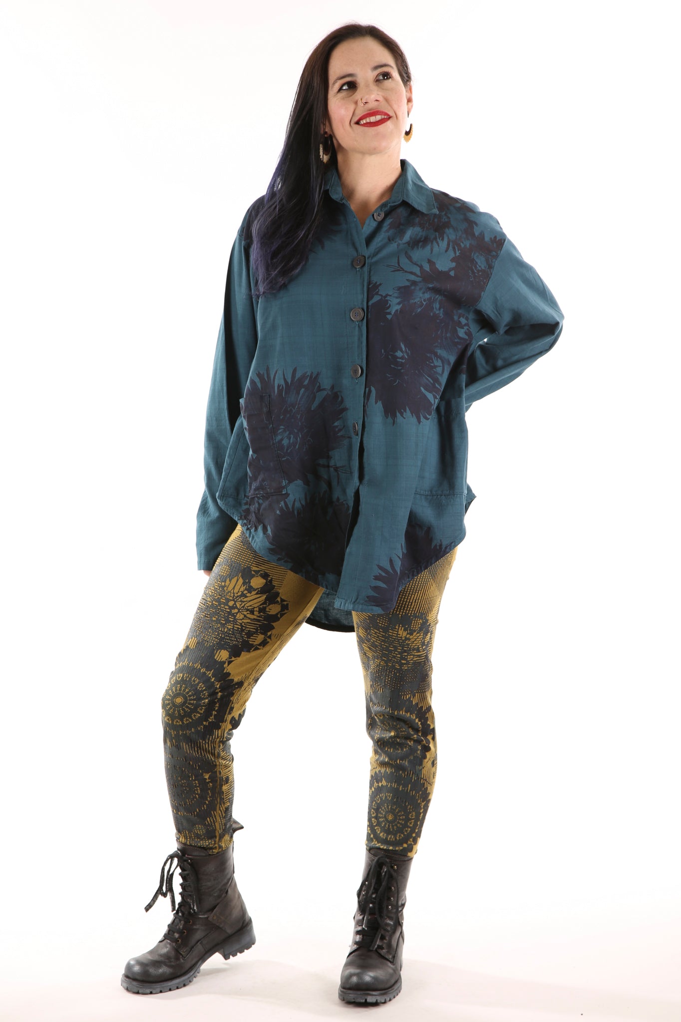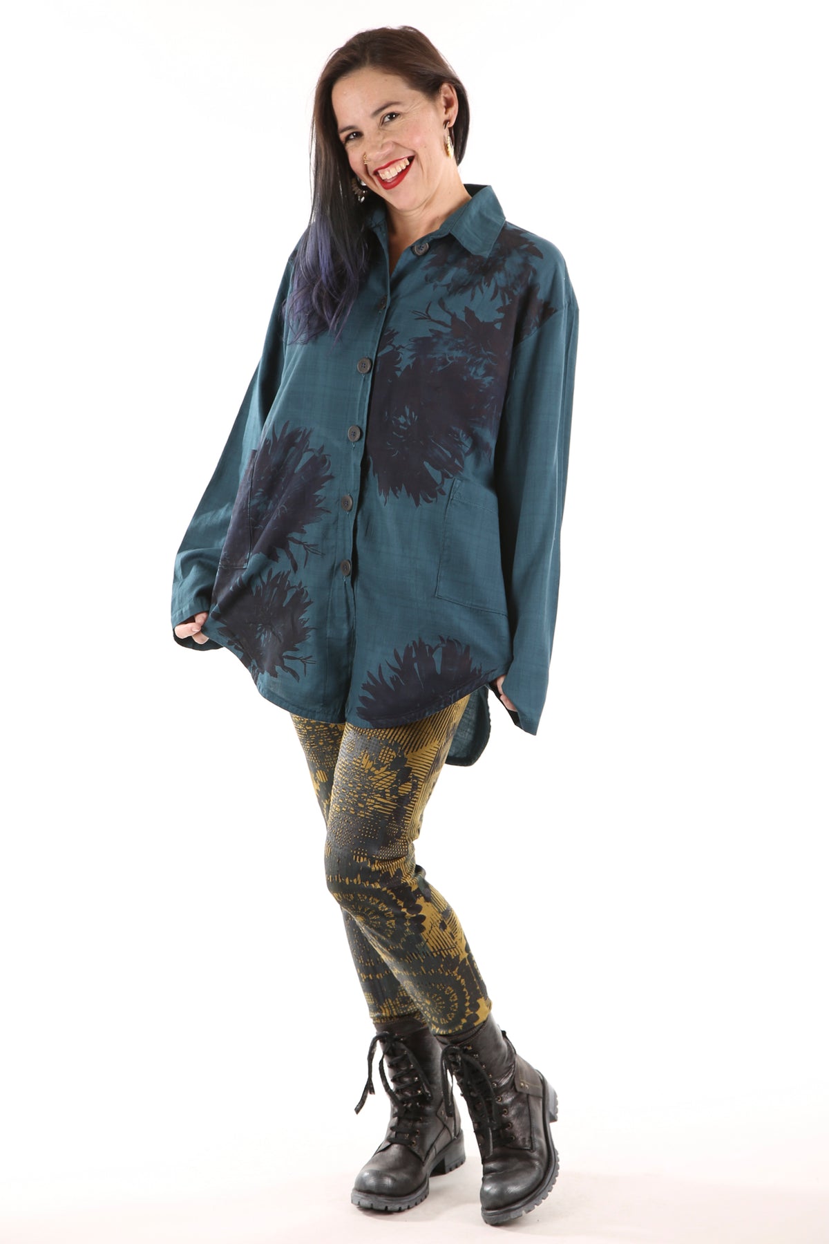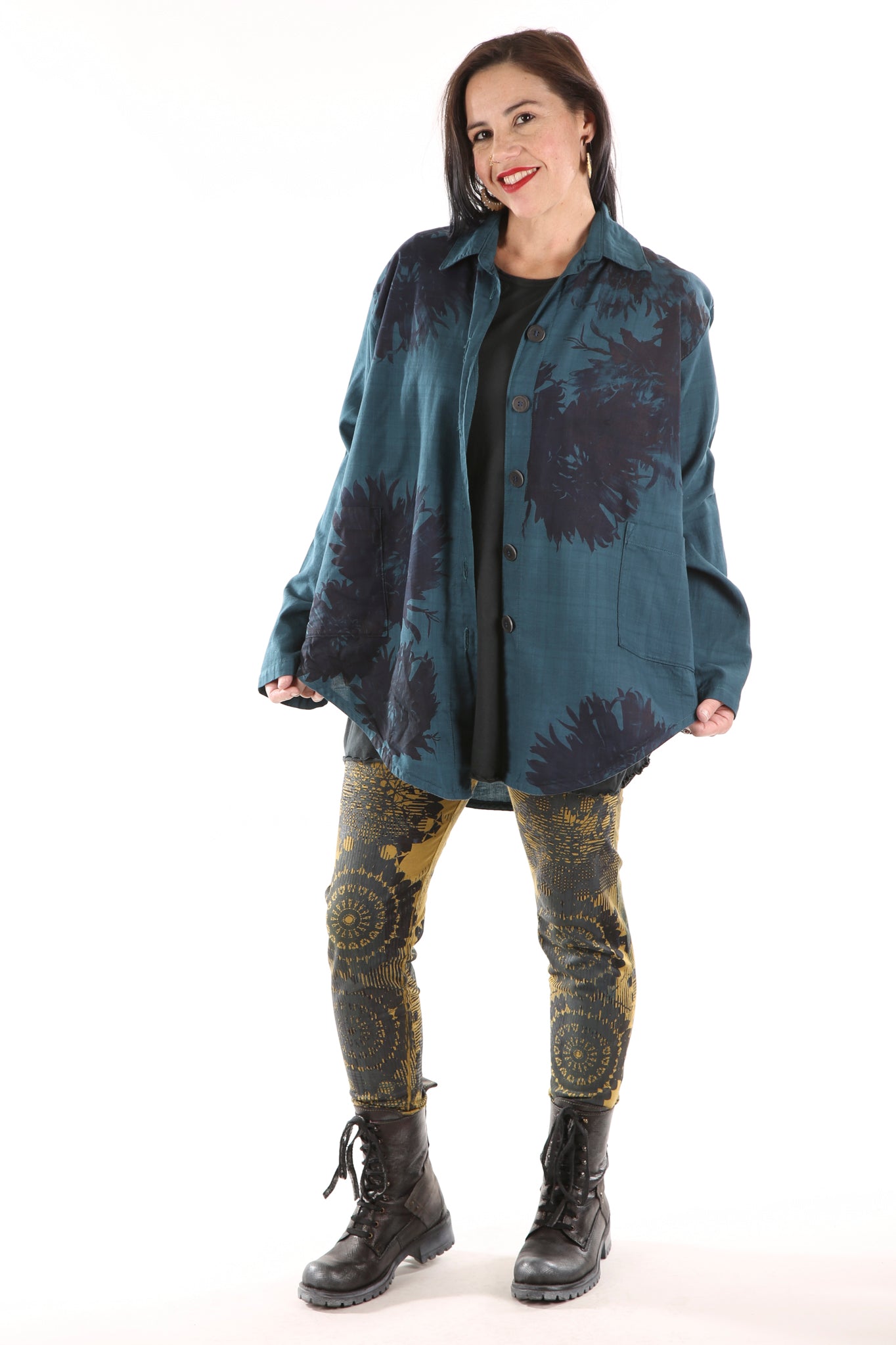 A new style you can wear as a shirt or a light shirt-jacket. Hand sewn buttons down the front, and has two large patch pockets. Printed beautifully, see close up of thumbnail photo by clicking on the small eye icon. The fabric is a very soft high quality brushed cotton, which we have over dyed and which still retains a very subtle tonal plaid. Printed with tonal textures.