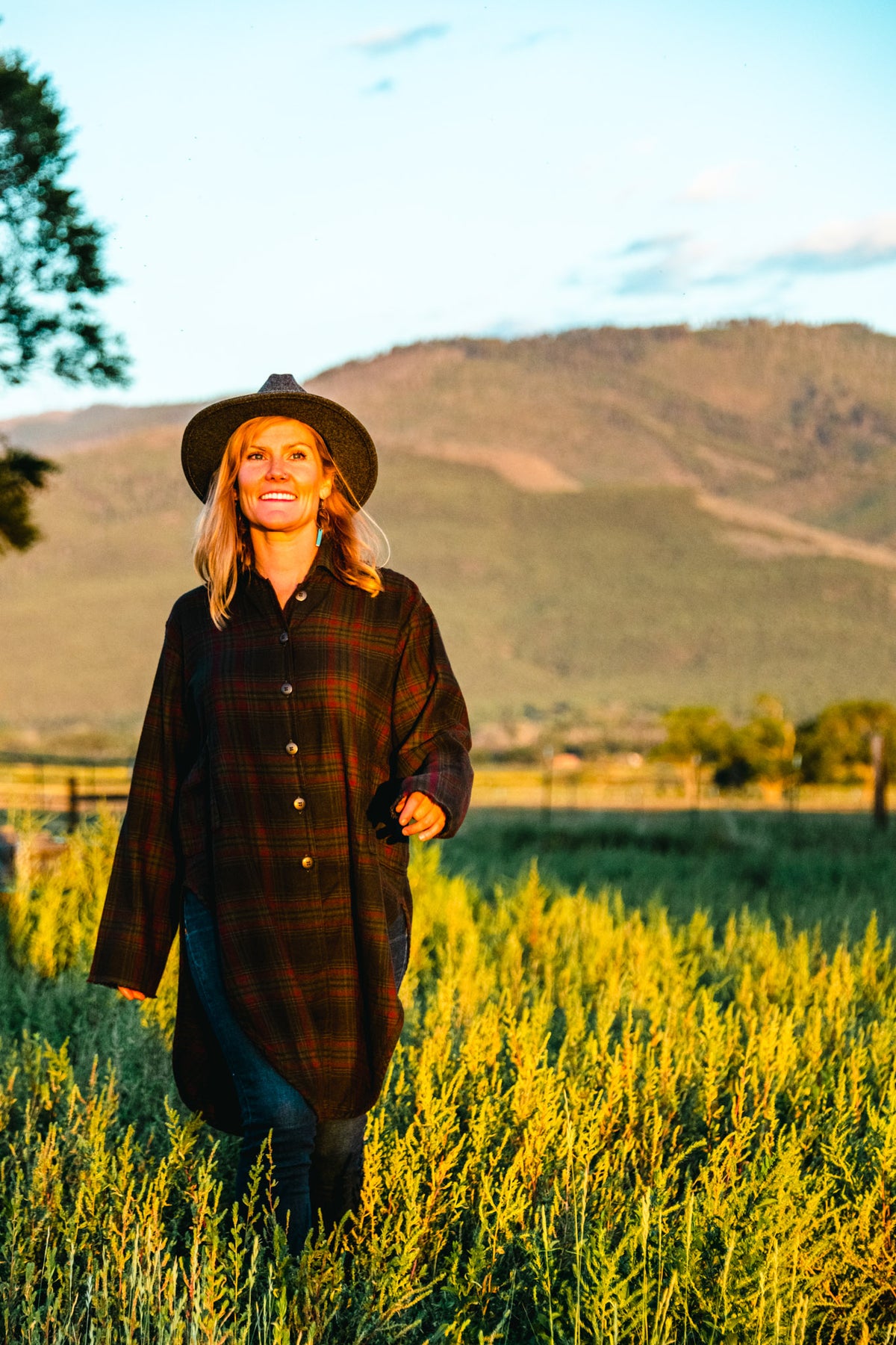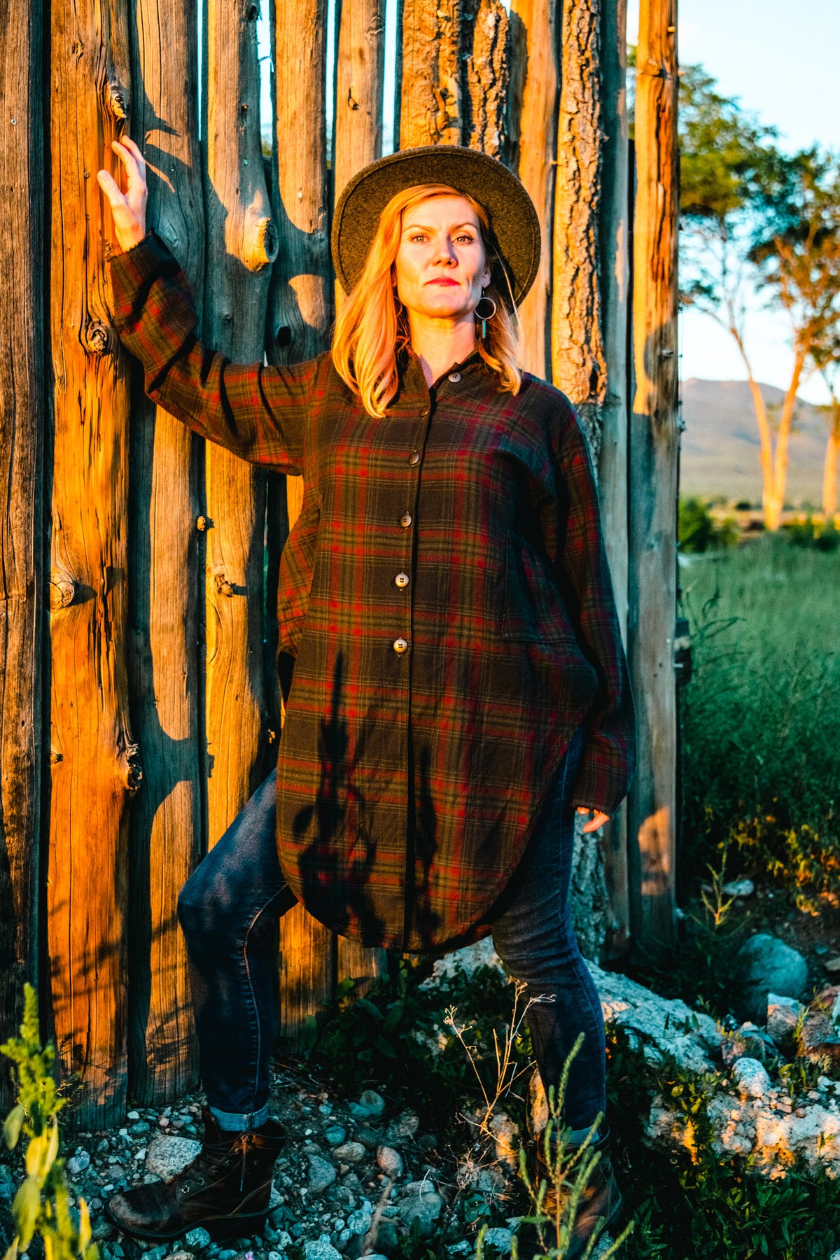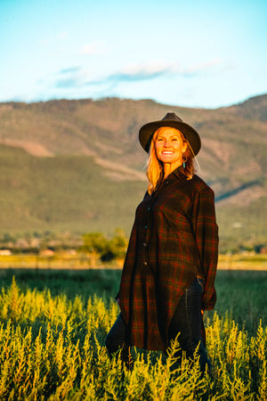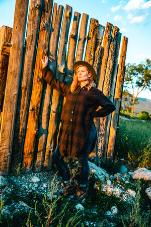 It will be your go-to on every chilly day. Substantial yet soft woven fabric in plaid, richly colored Peat by our overdye process. Wear open or closed, looks great both ways! High scoops in each side create visual interest & 2 high pockets add practicality.