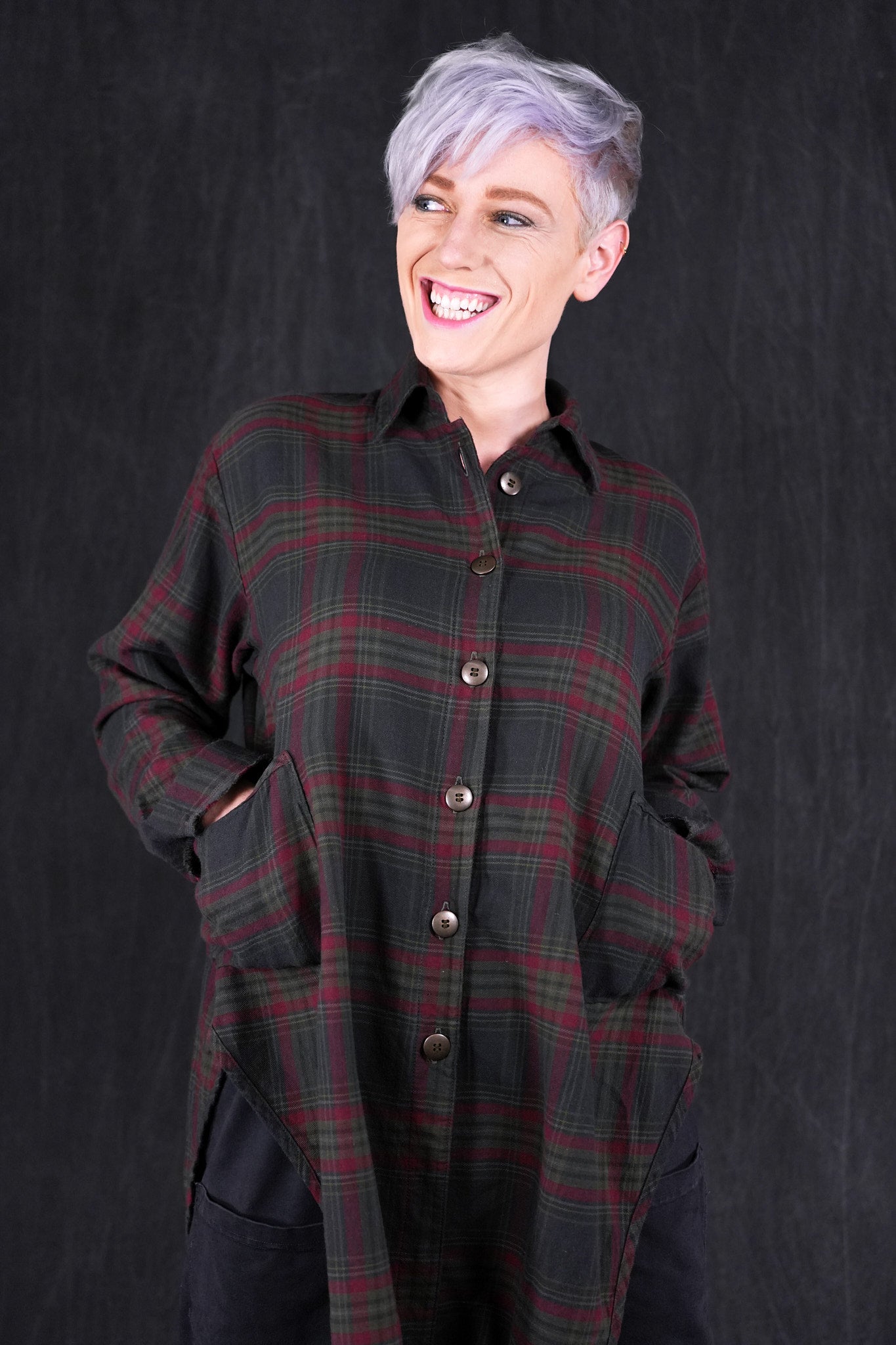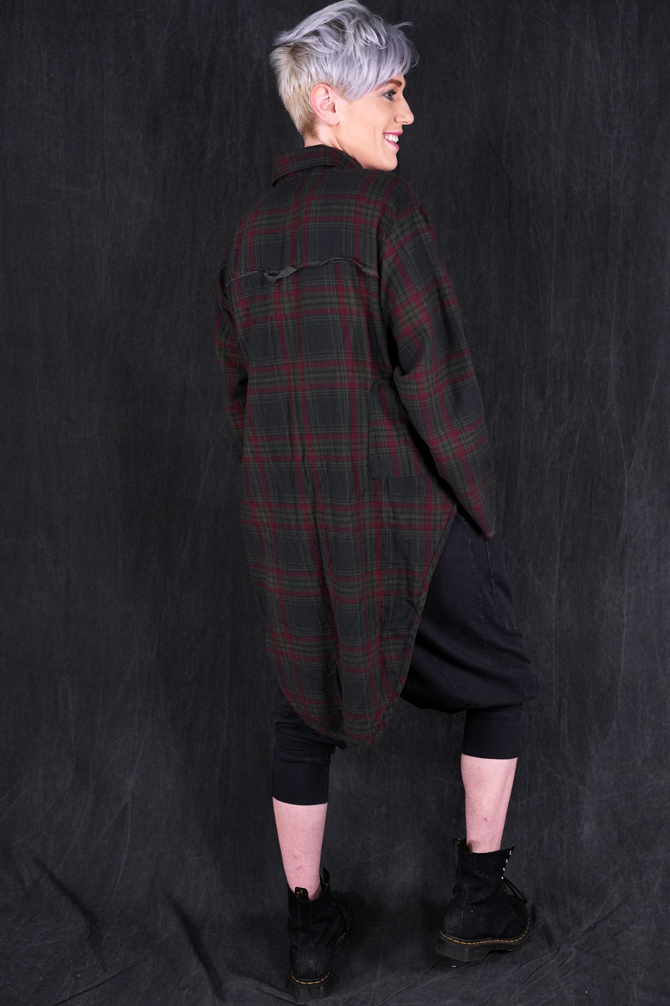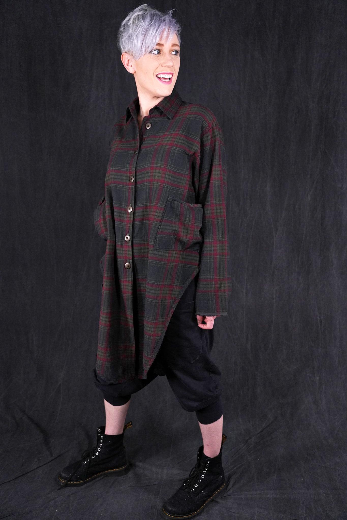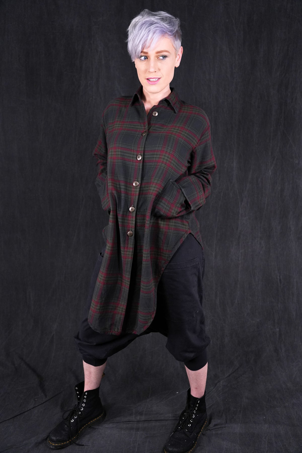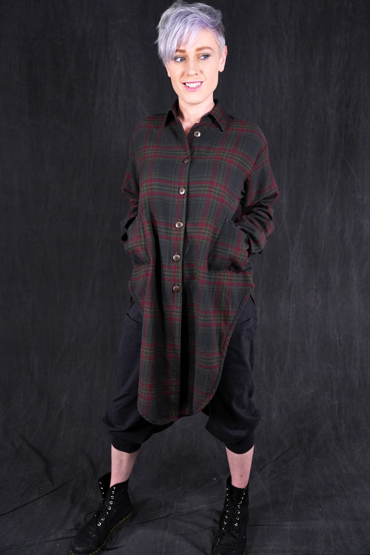 This heavy plaid shirt/ jacket has a unique shape with high cutaway sides, creating a flattering look layered over long tops/ tunics as a jacket, or simply worn with leggings or jeans.