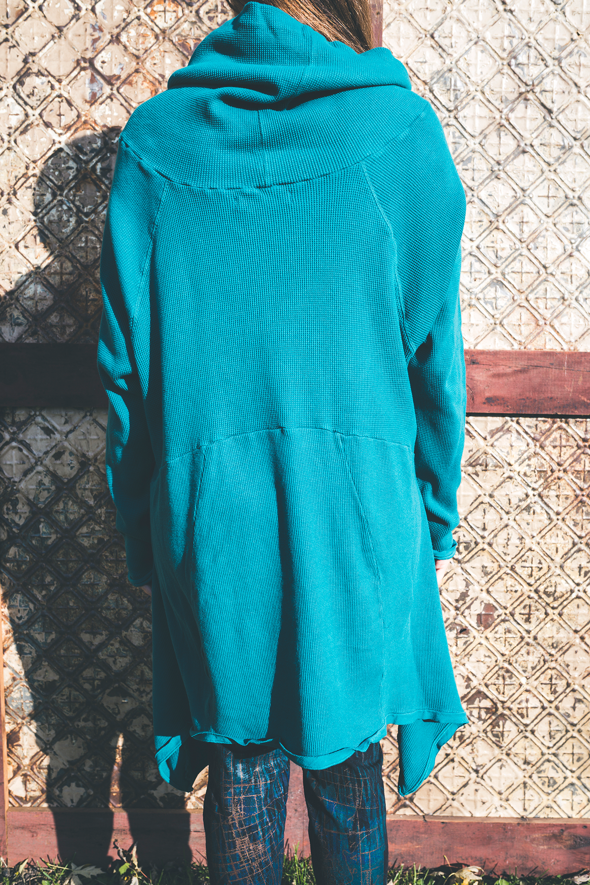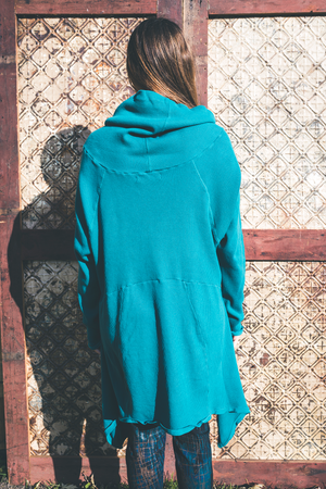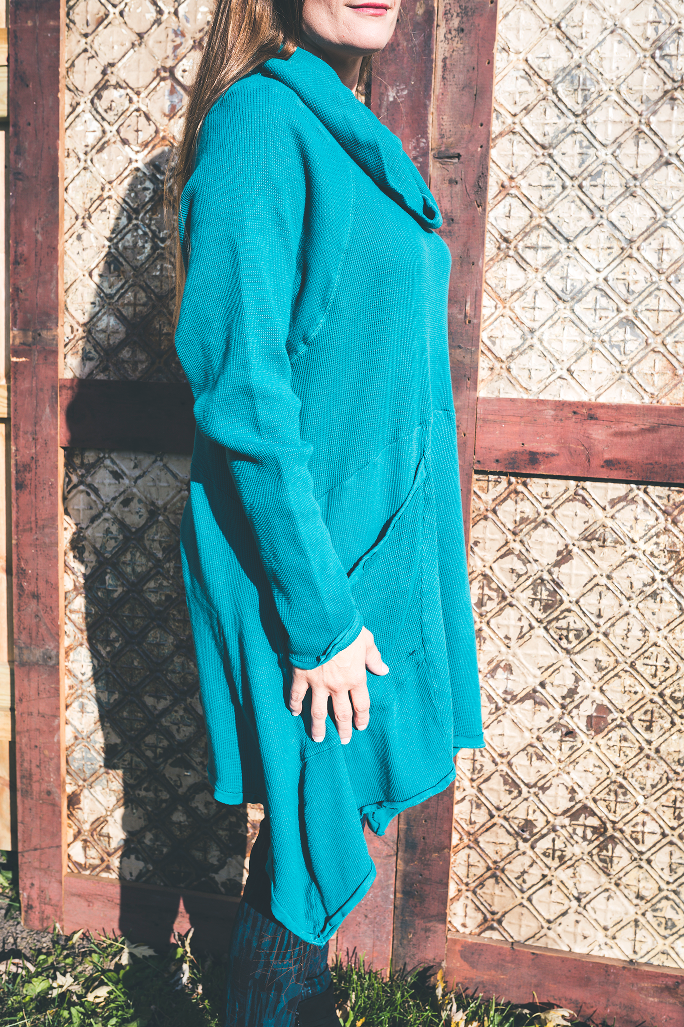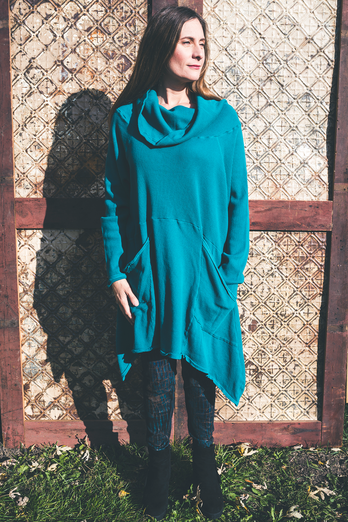 A tunic of a Thermal and cotton that is cut just right -great to wear. Flattering and easy shape in a rich thermal that is a quality, dense stretchy & weighty knit.