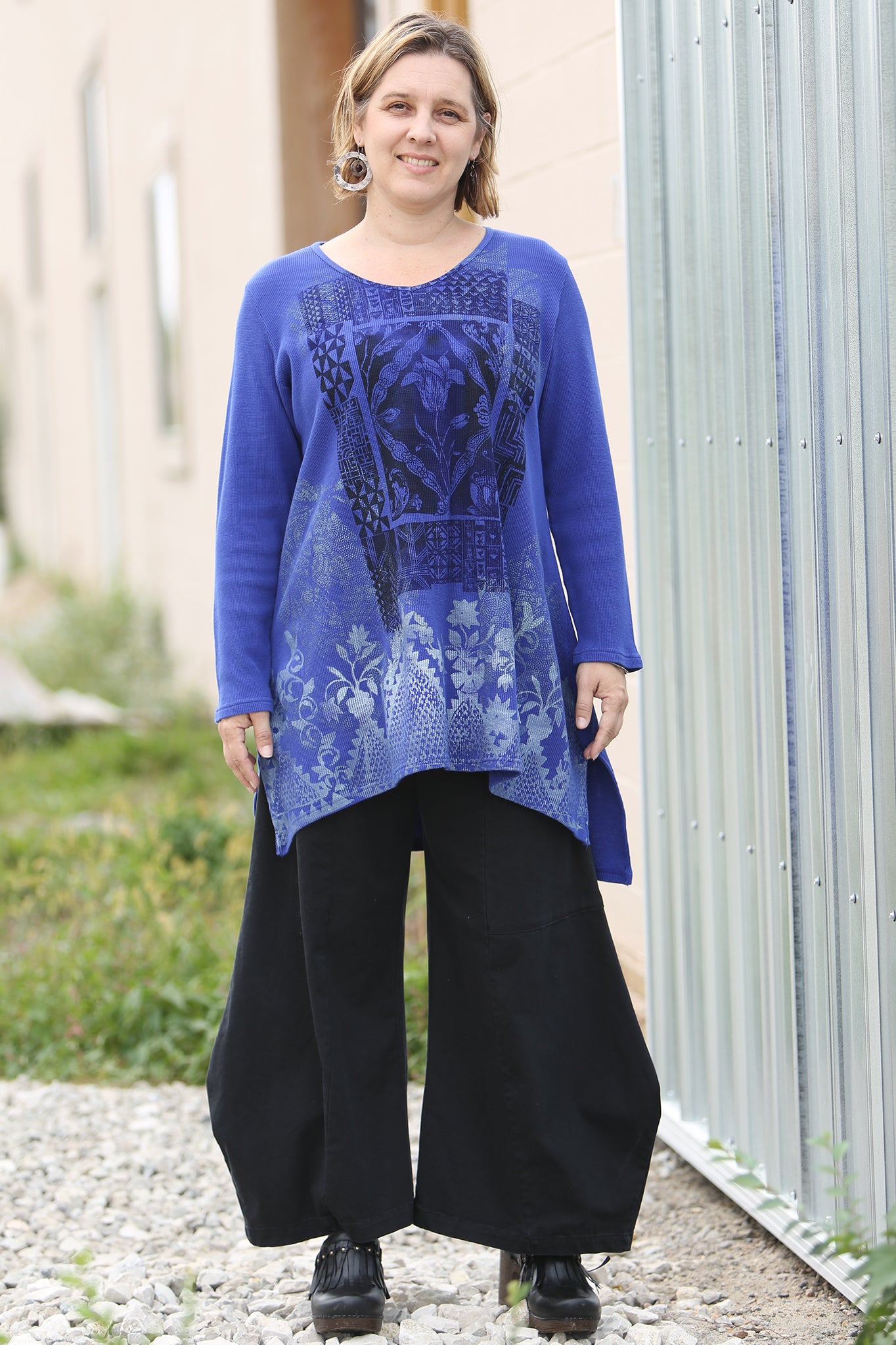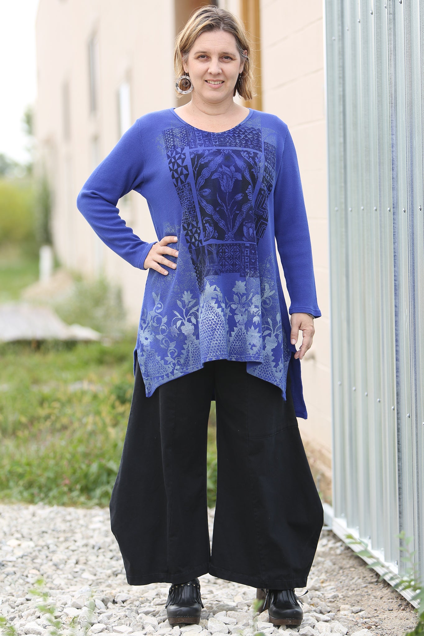 A tunic of heavier weight thermal that is cut just right, slight A-line, not too much fabric. Slightly longer in the back. Flattering and easy shape in a really nice thermal that is a great quality, dense & weighty knit.