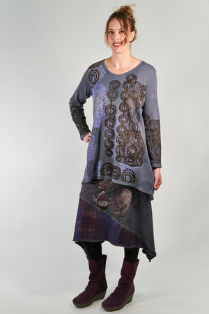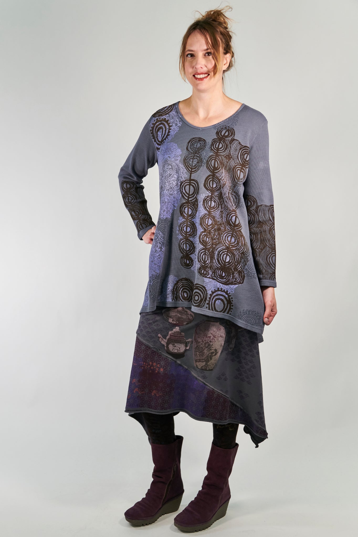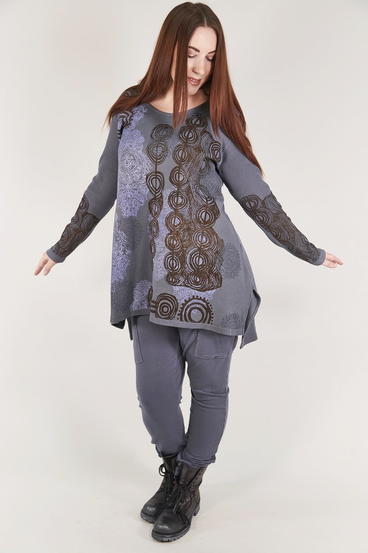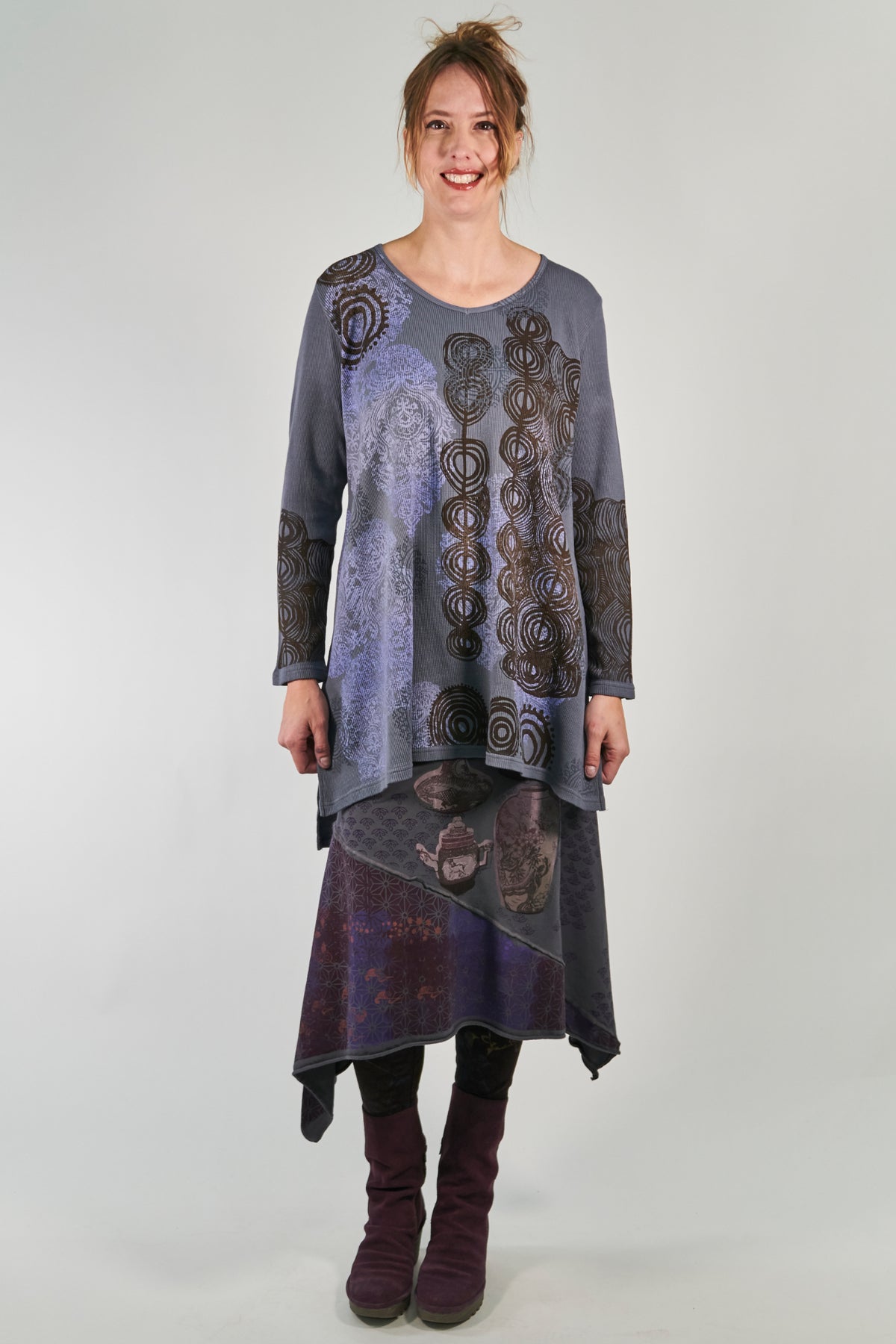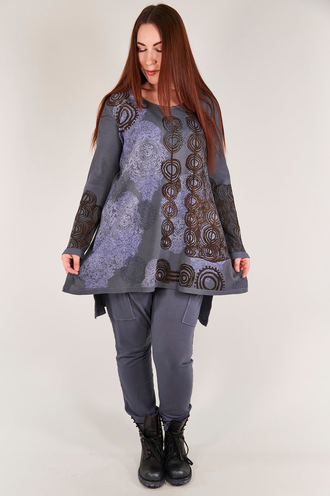 A tunic of heavier weight thermal that is cut just right, slight A-line, not too much fabric. Slightly longer in the back. Flattering and easy shape in a really nice thermal that is a great quality, dense & weighty knit.