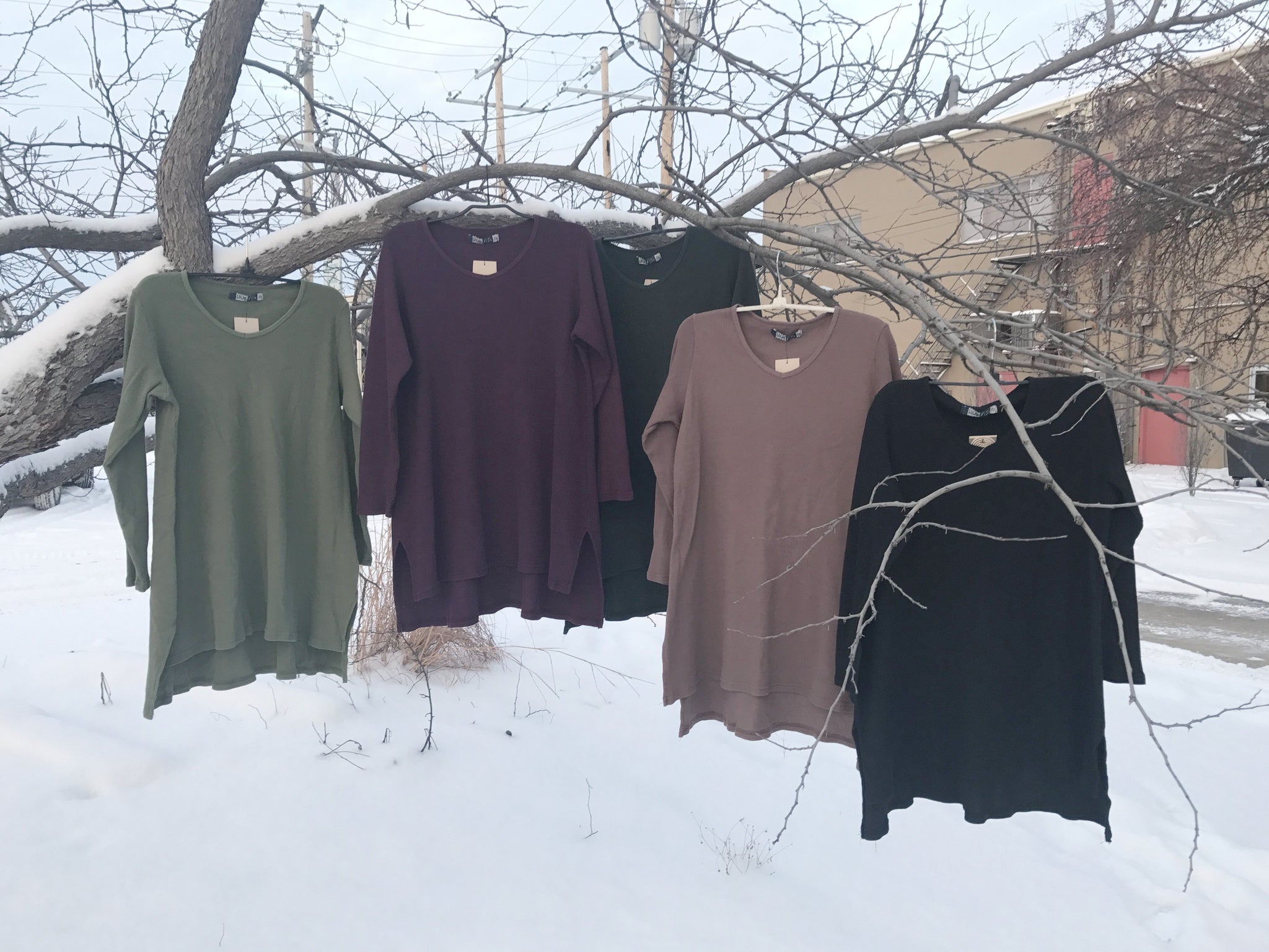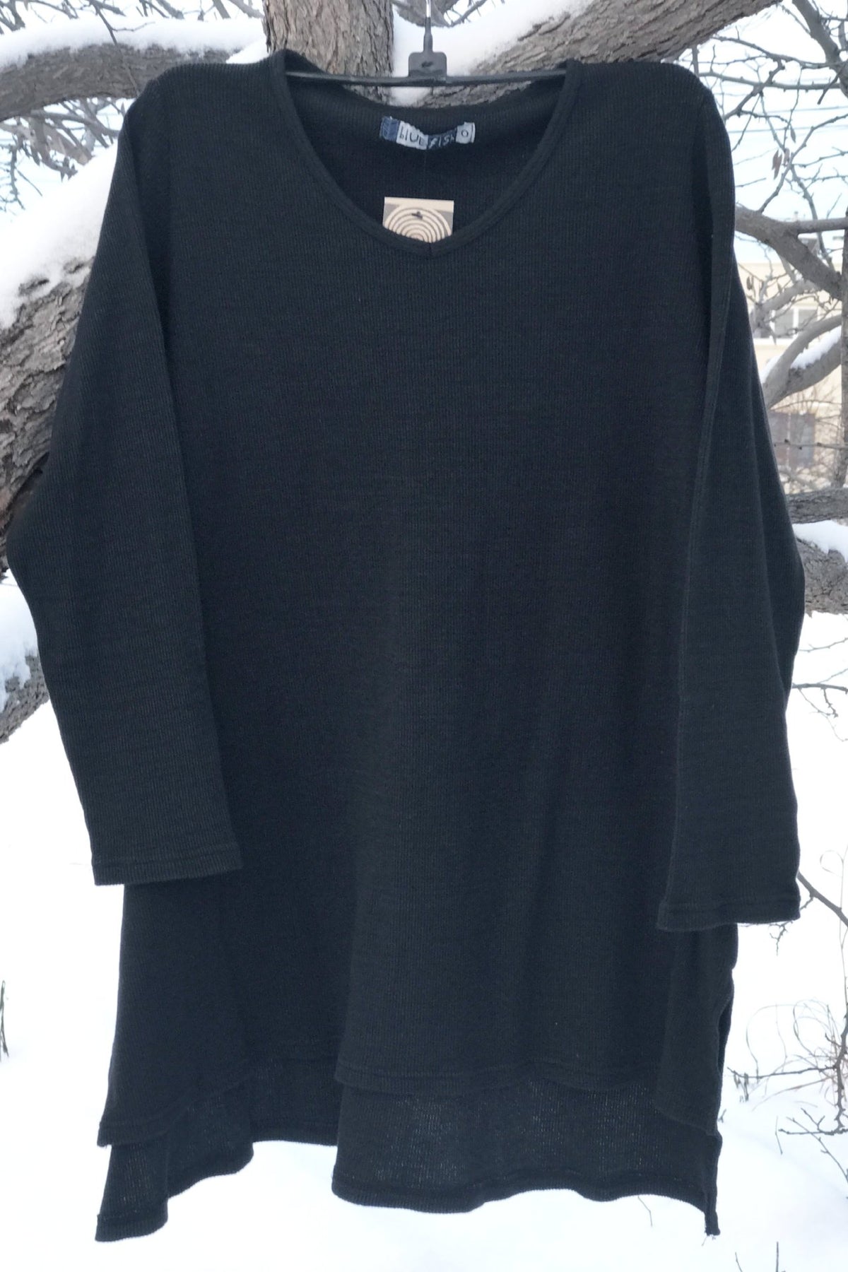 A tunic of heavier weight thermal that is cut just right, slight A-line, not too much fabric, great to wear with the printed Thermal Cartographer's Pant. Slightly longer in the back. Flattering and easy shape in a really nice thermal that is a great quality, dense & weighty knit.
