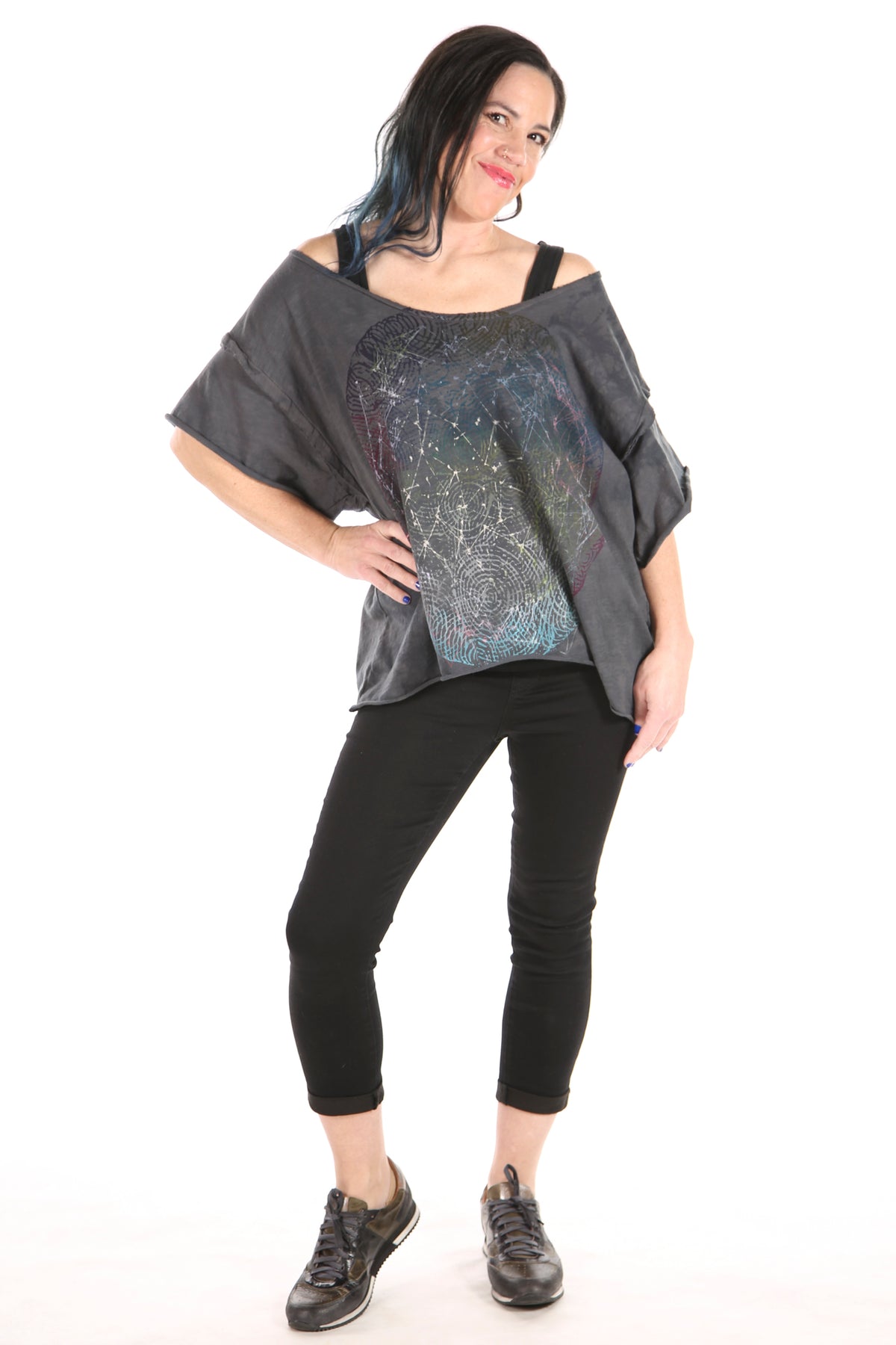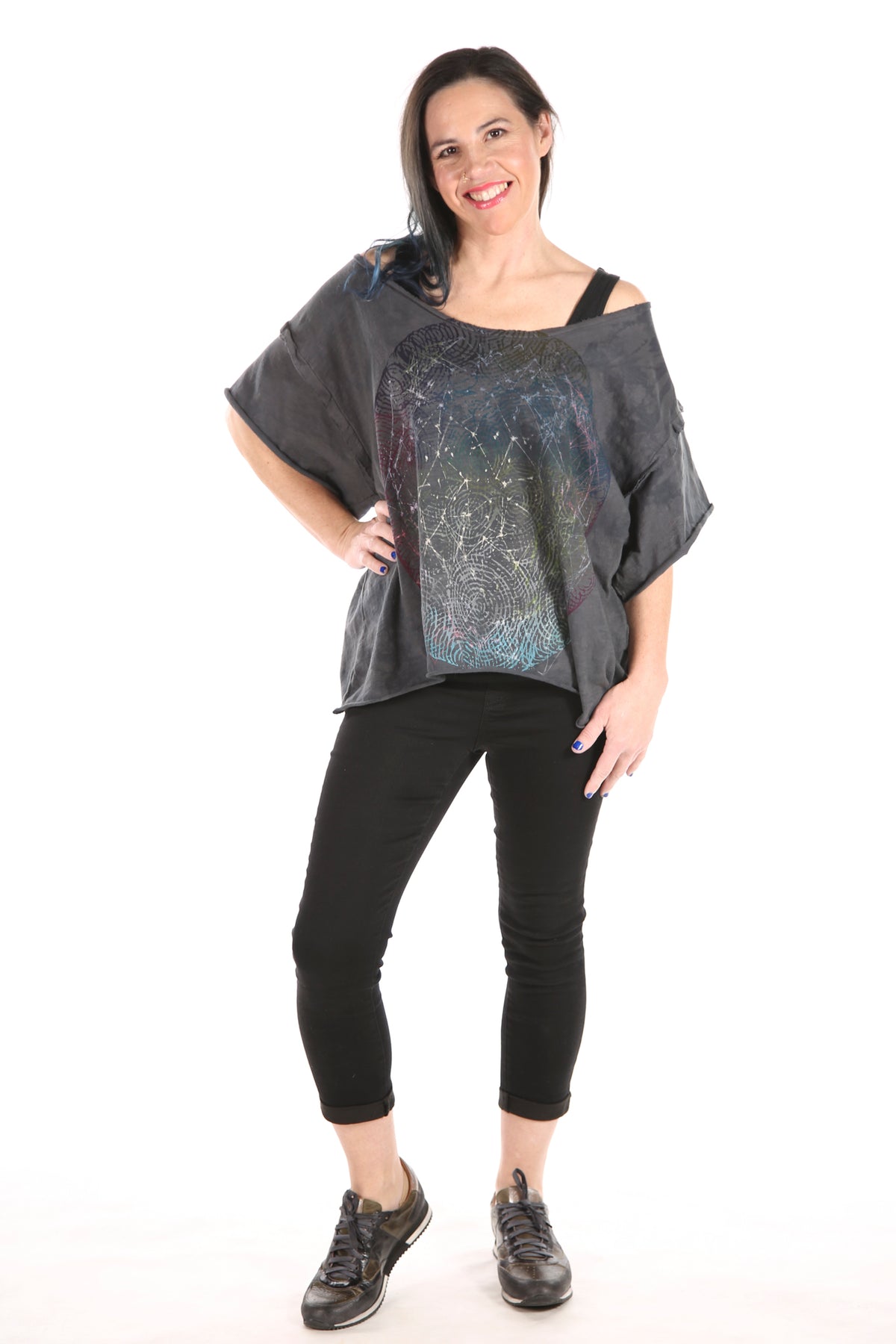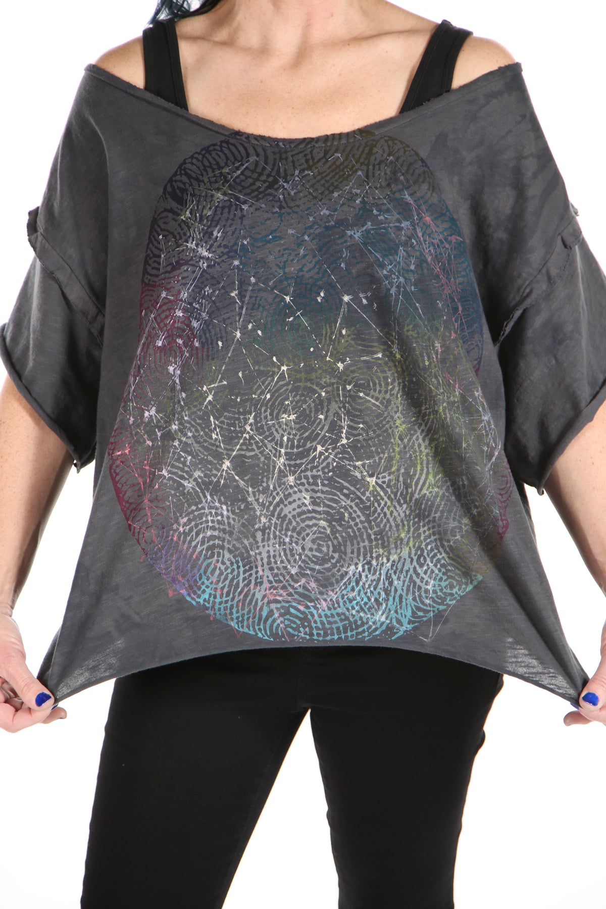 Modern, deconstructed slouchy tee with raw edges, amazing prints
