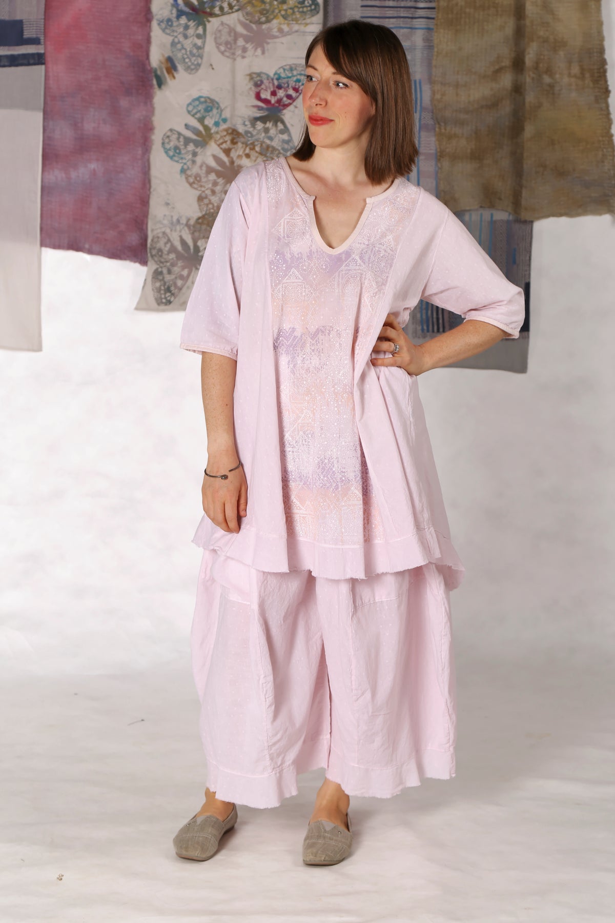 Raw curved flounced hem and cut out neckline finished with soft organic jersey.