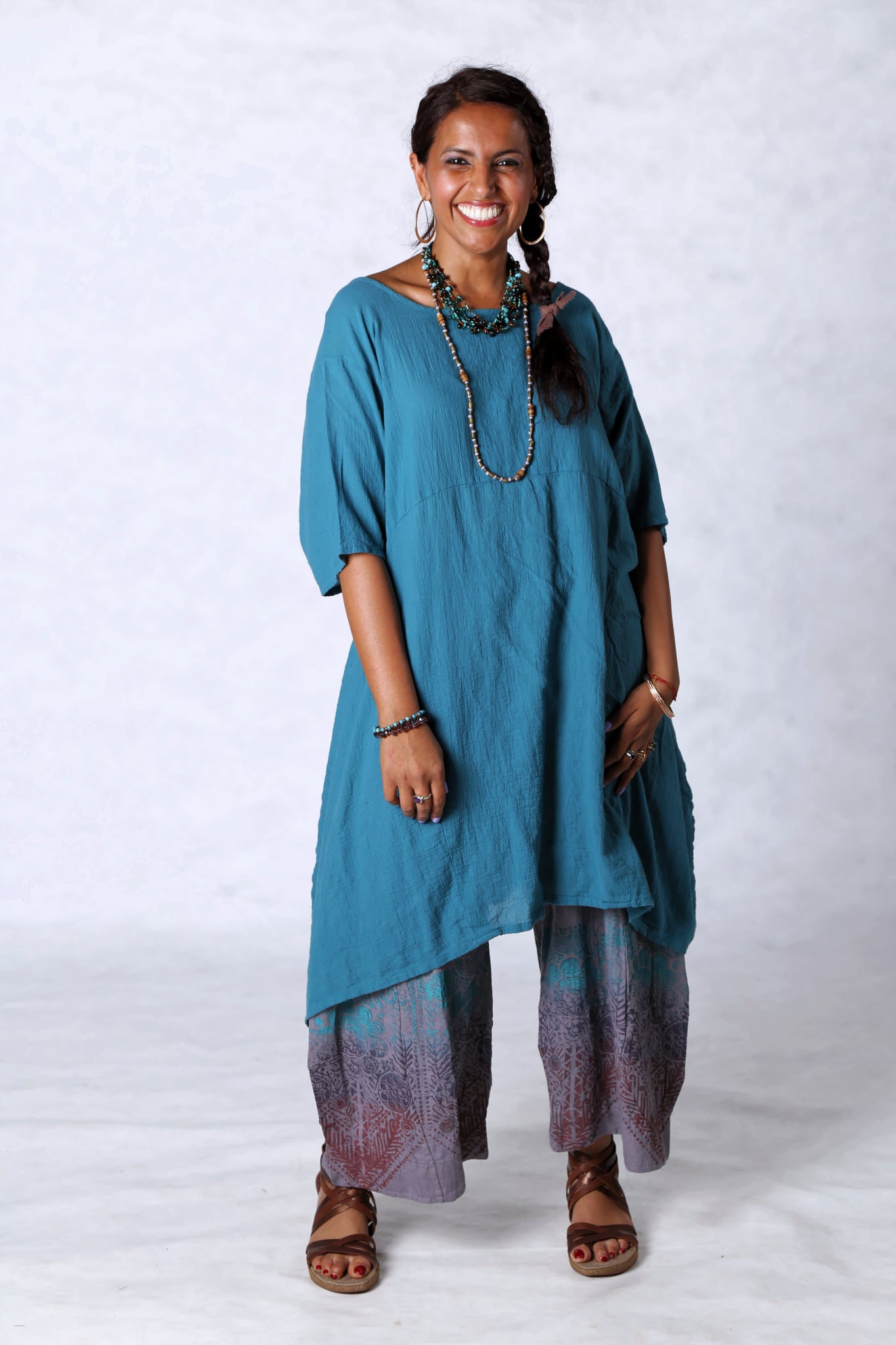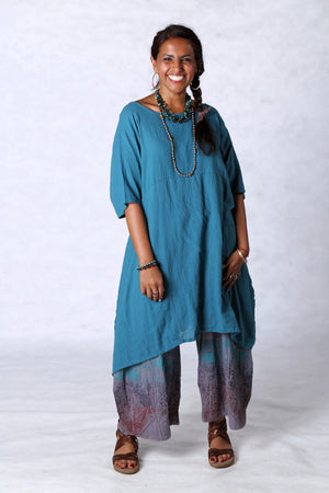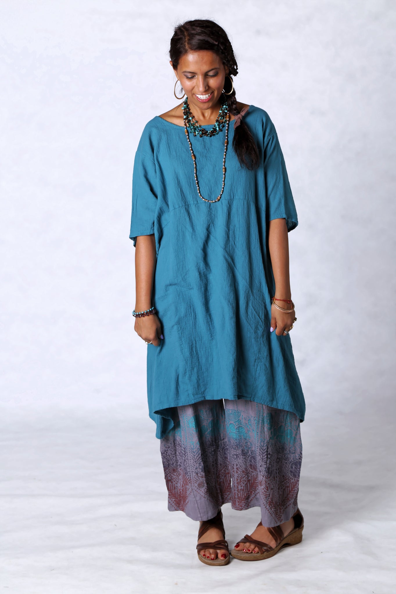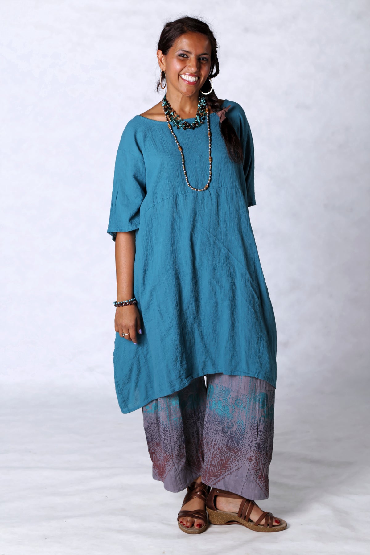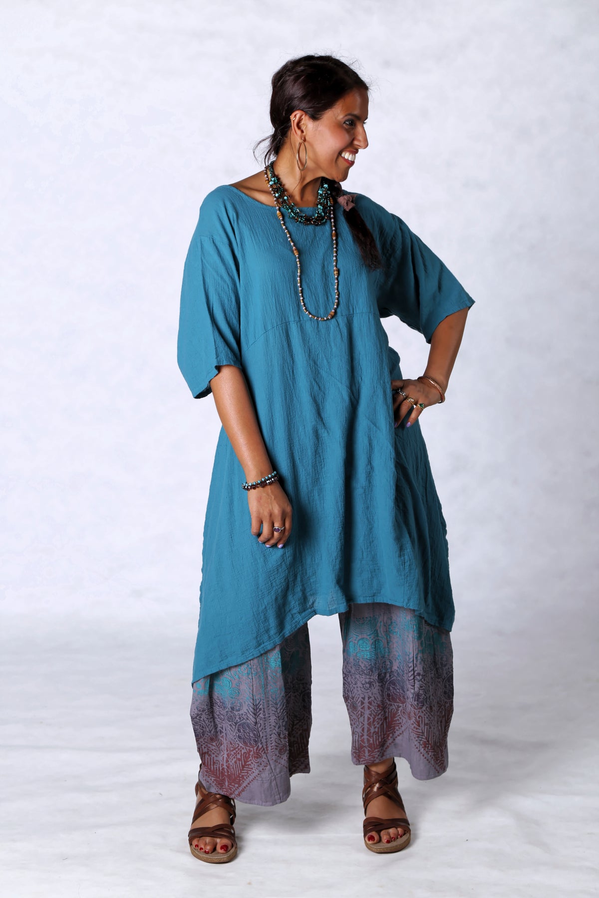 Lightest weight pure cotton gauze in a light & airy open weavelets you look great and beat the heat. This piece packs easily and weighs next to nothing- great for traveling. Featured in our flattering Urchin shape, you can wear this dress in many ways- alone or over # 3136 organic leggings, #3239 tiered petaloons, or #3242 Cropped Gauze Pocket Pant. Shown here with the Elegant Linen Pant in Smoky Amethyst.