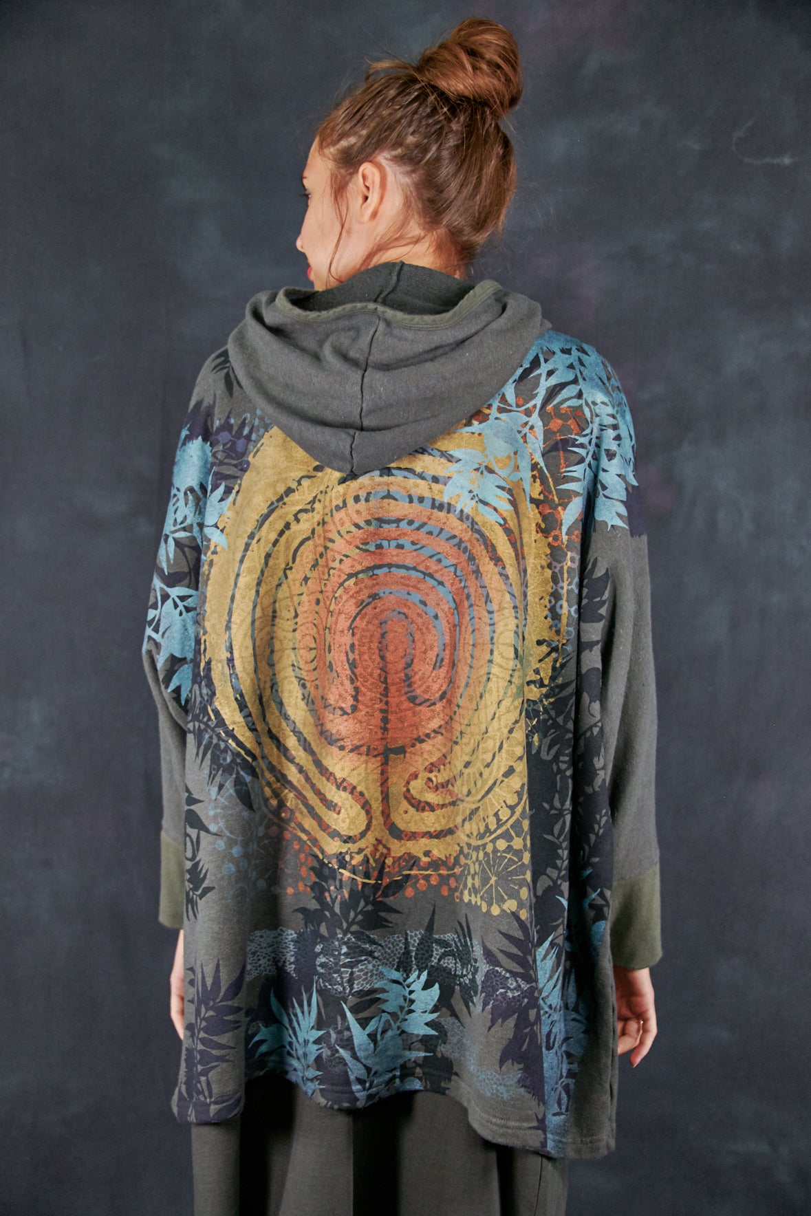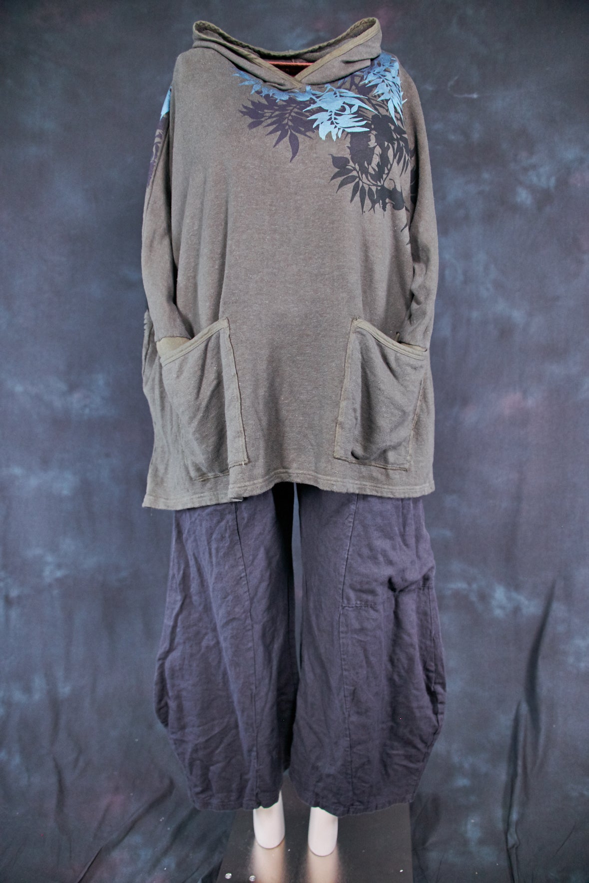 Art Sweatshirt. Square cut with a hood and pockets. Loose-fitting body. Fitted rib accent at the wrist  so you can push up the sleeves. Two large front patch pockets to keep your hands warm.