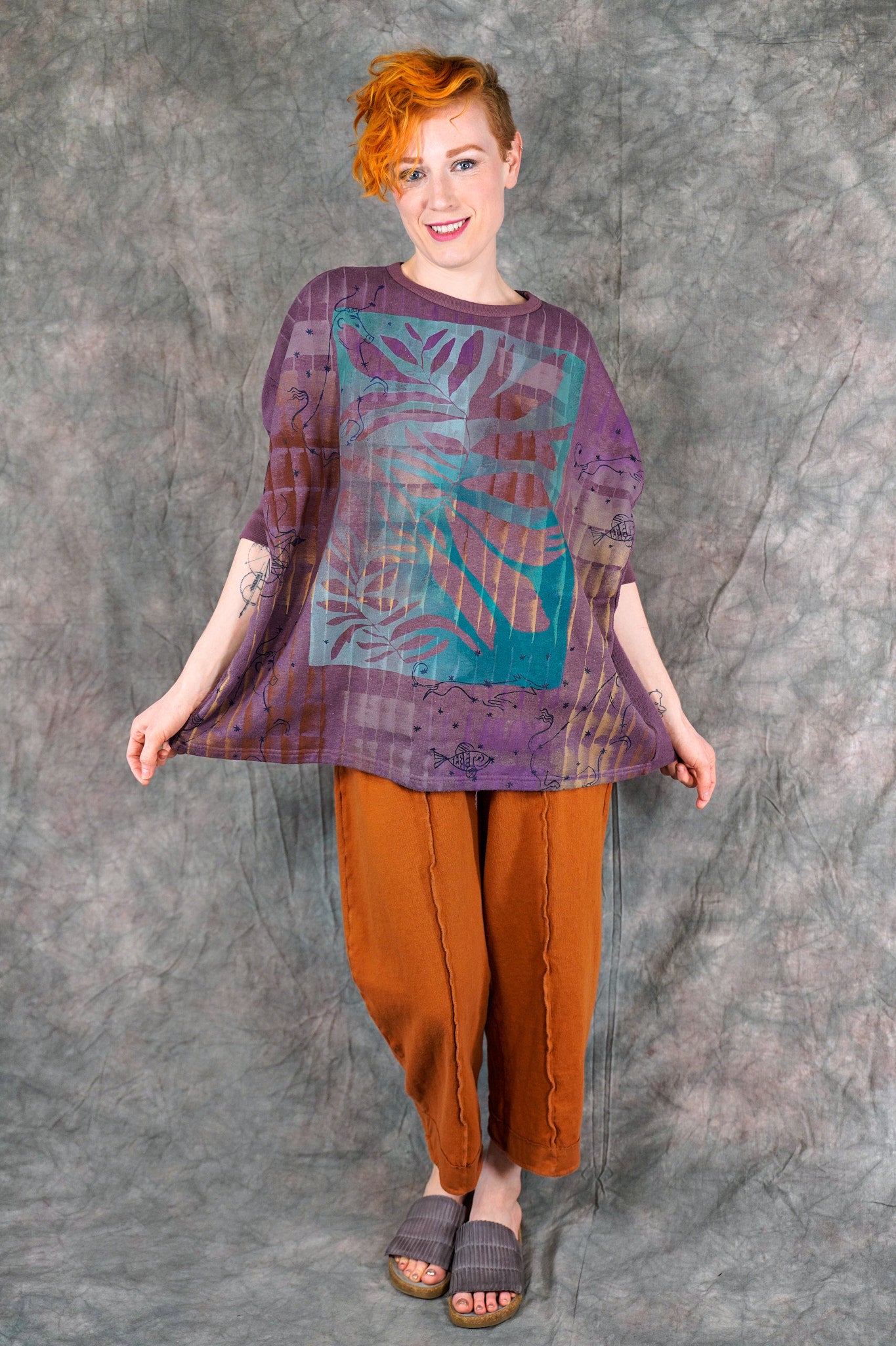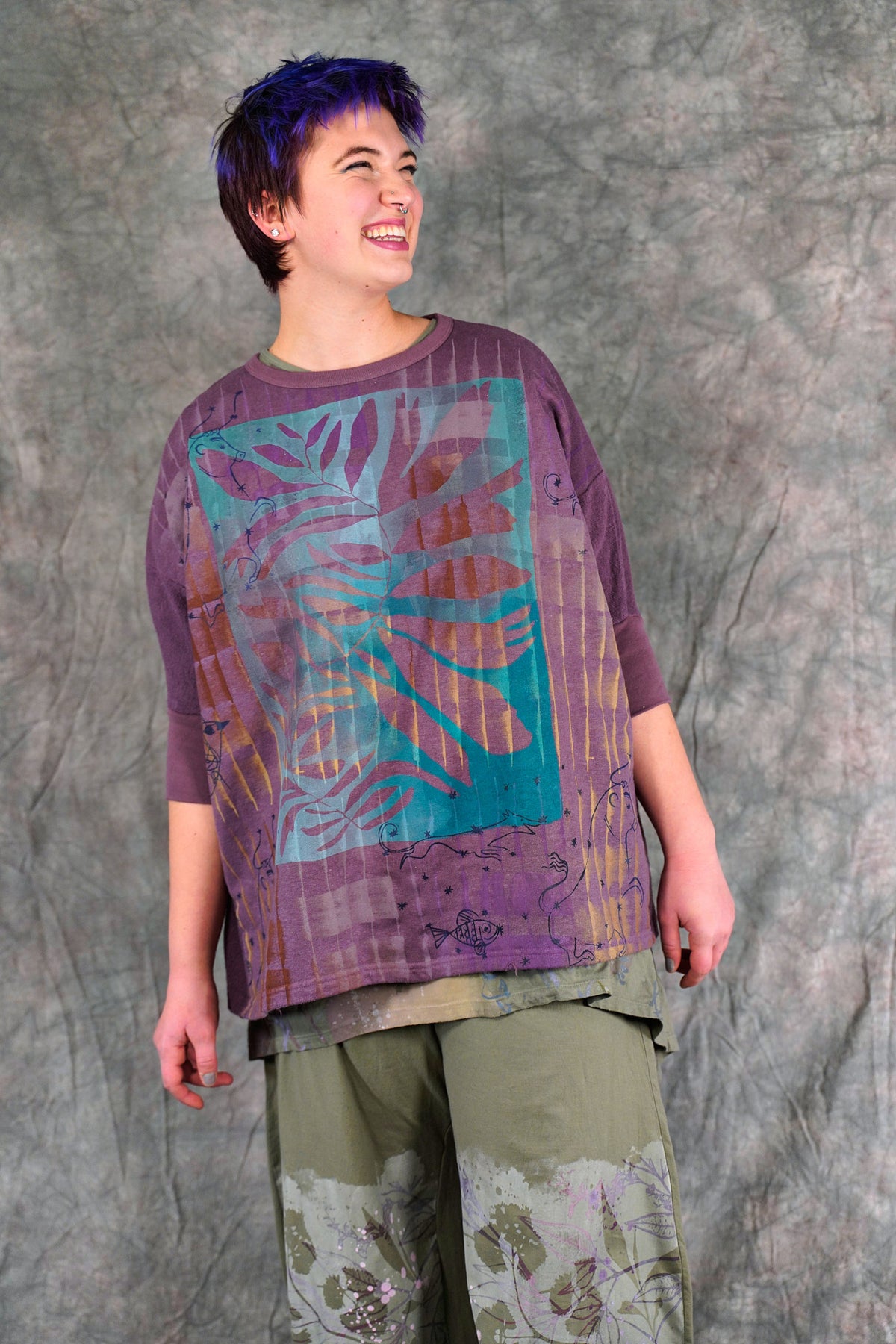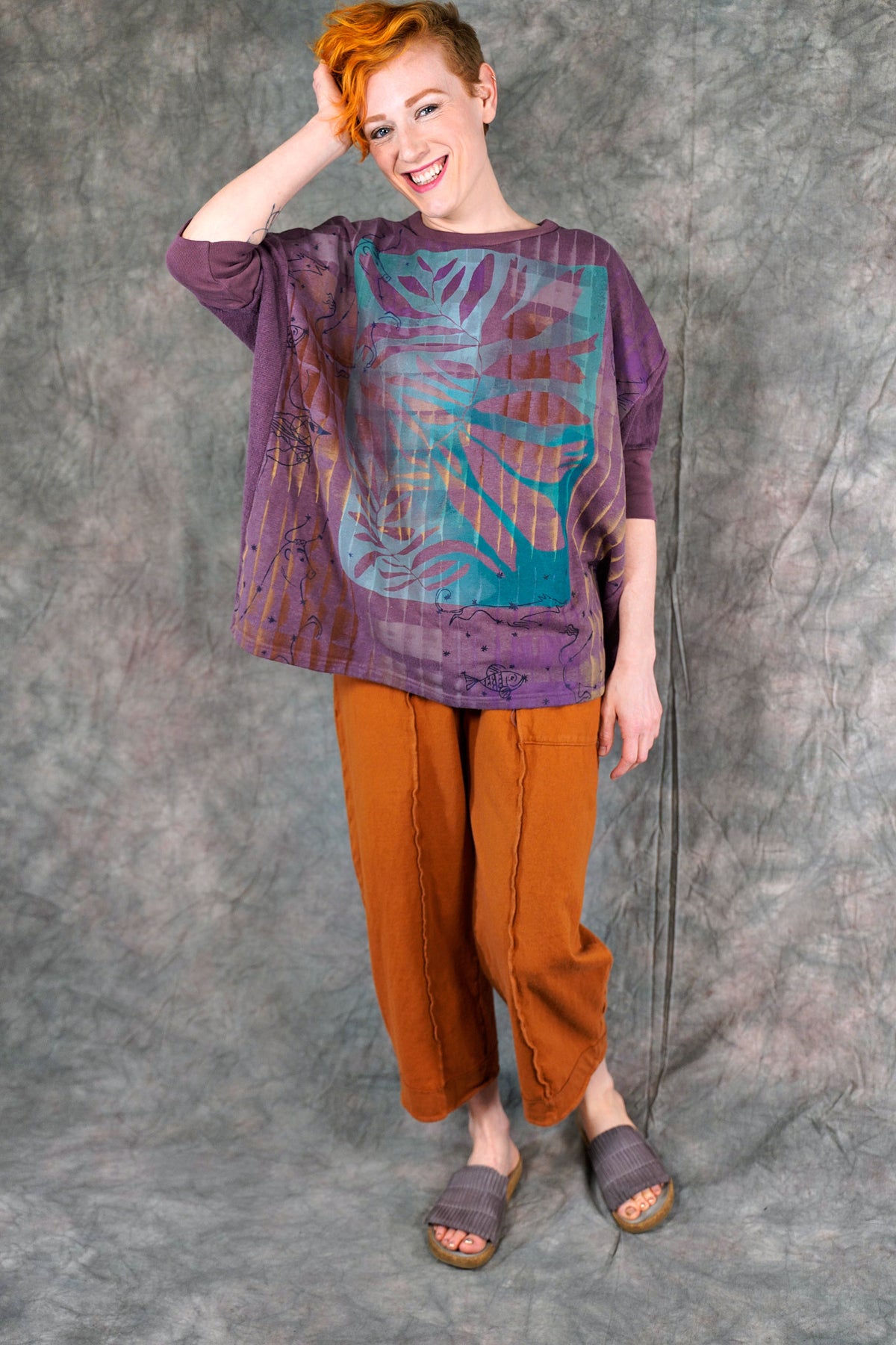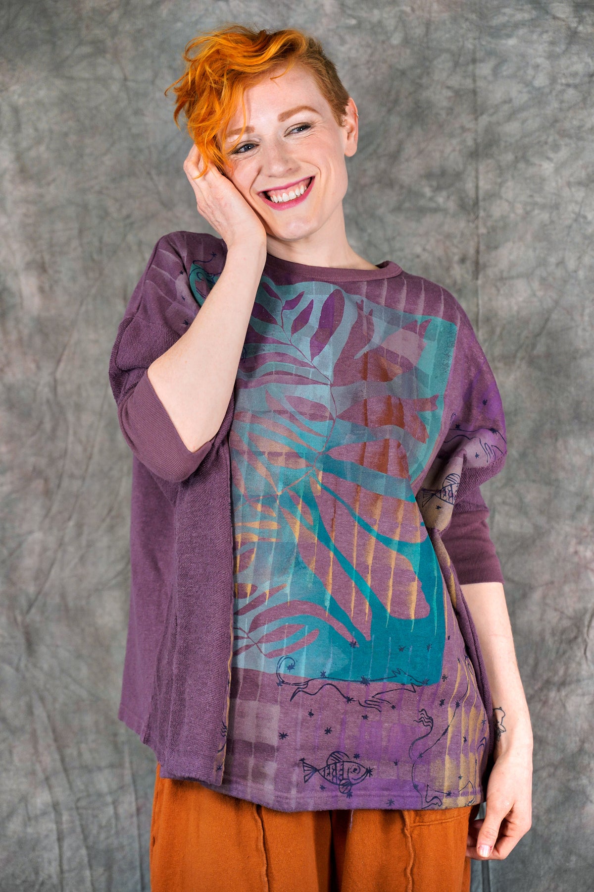 This organic hemp/cotton pullover sweatshirt is a new style to love--snuggly soft cozy fabric meets art from our studio to create a piece you'll reach for again & again! Contrasting panels of fabric around the arms & on the sides add visual interest. This is a more tailored version of the favorite square Blue Fish sweatshirt. Please note that fitted arms & neck make this style most suited to sizes 0 and 1.