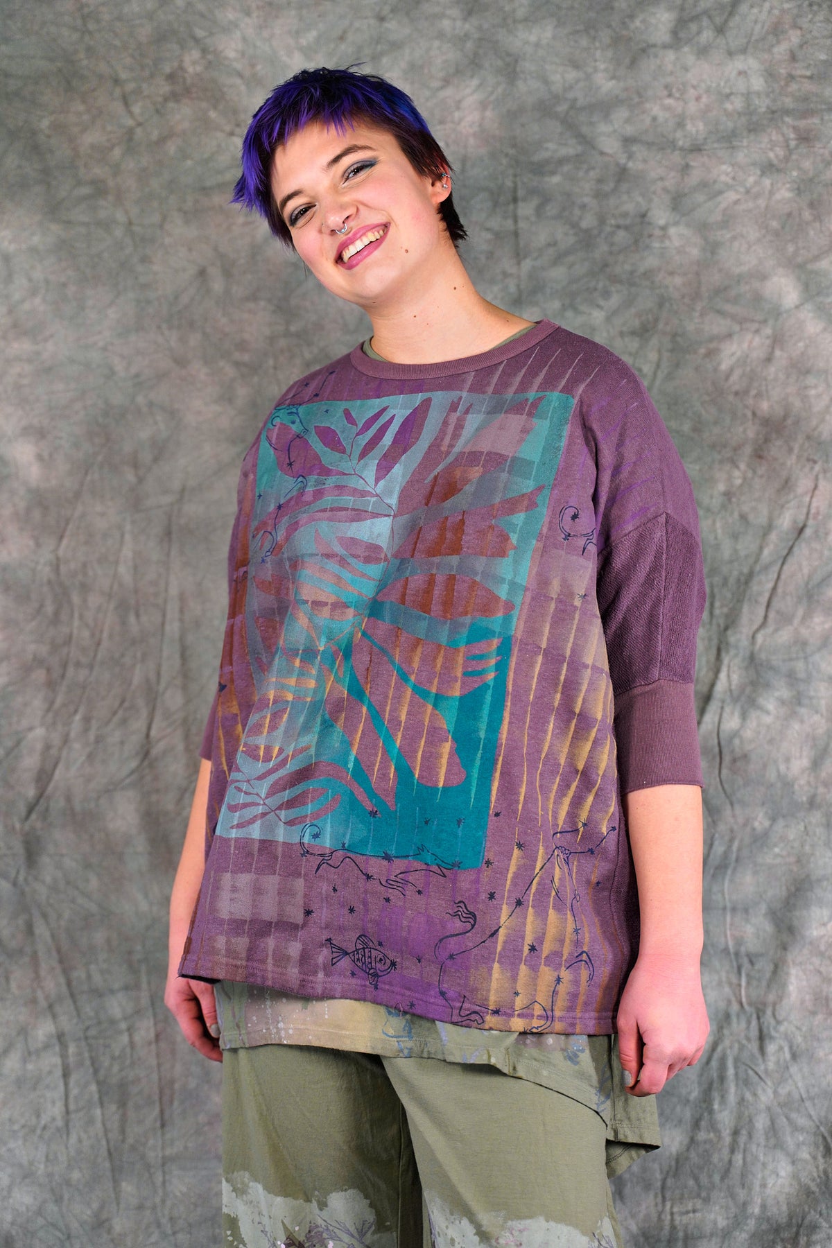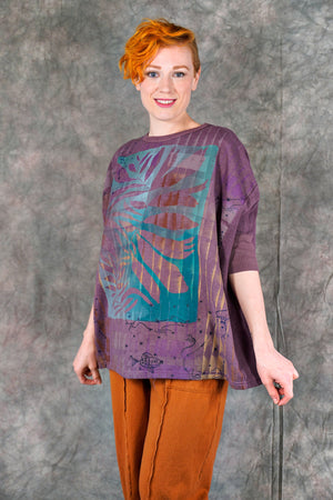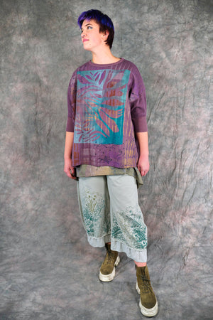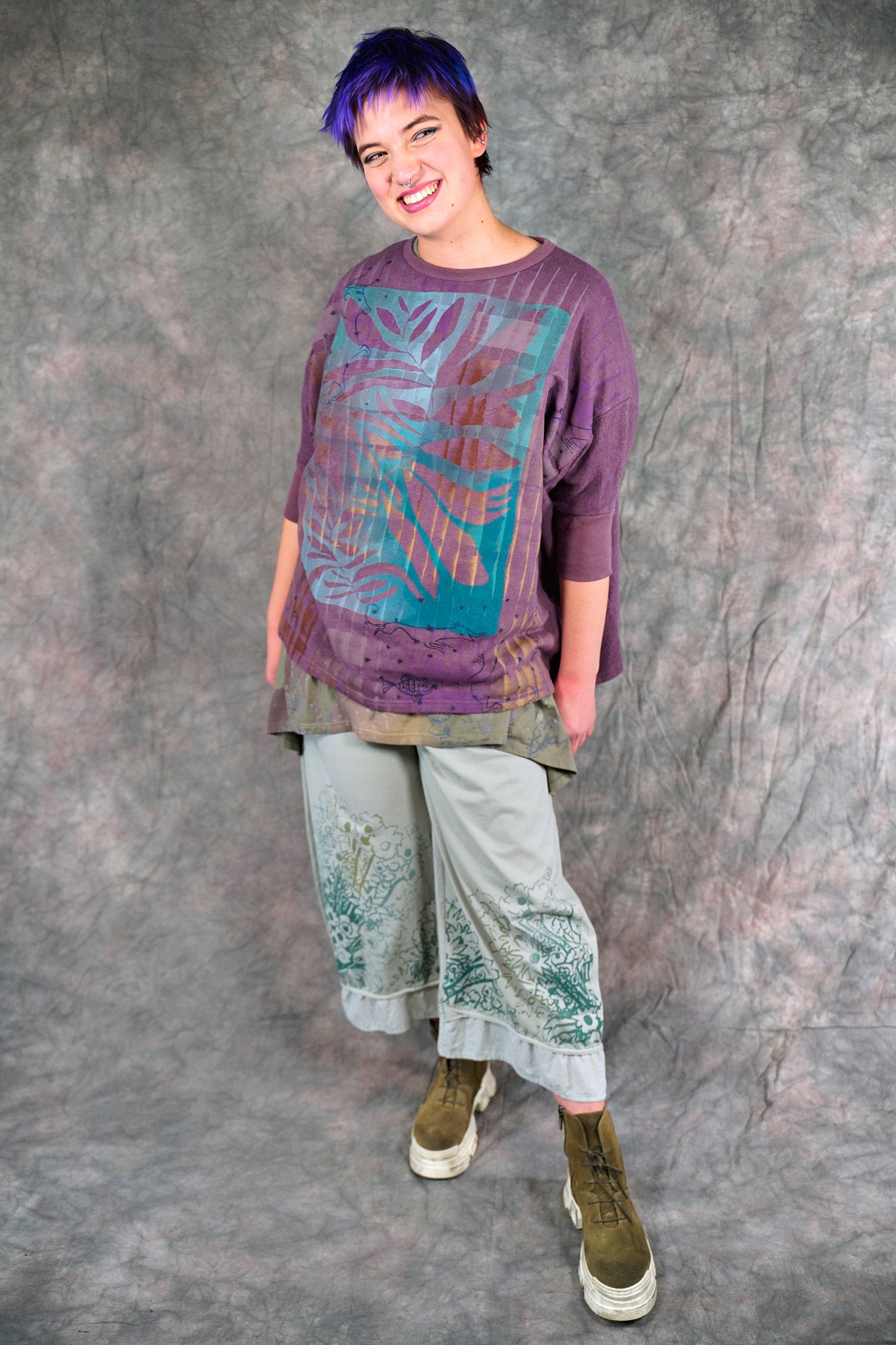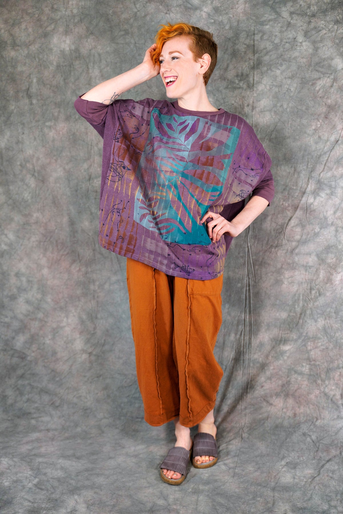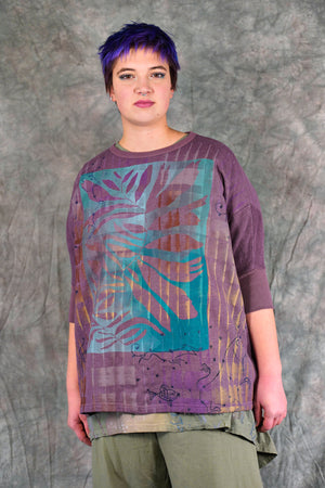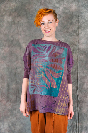 This organic hemp/cotton pullover sweatshirt is a new style to love--snuggly soft cozy fabric meets art from our studio to create a piece you'll reach for again & again! Contrasting panels of fabric around the arms & on the sides add visual interest. This is a more tailored version of the favorite square Blue Fish sweatshirt. Please note that fitted arms & neck make this style most suited to sizes 0 and 1.