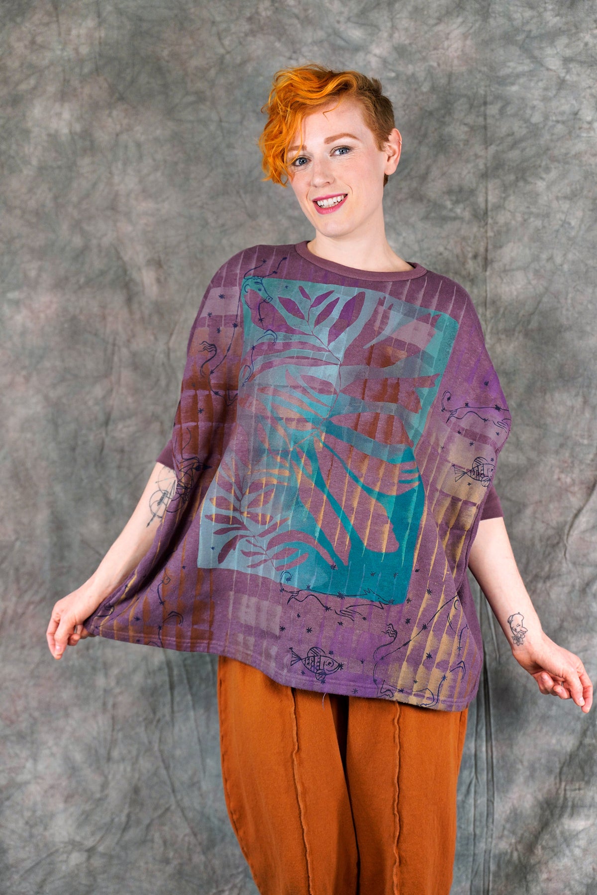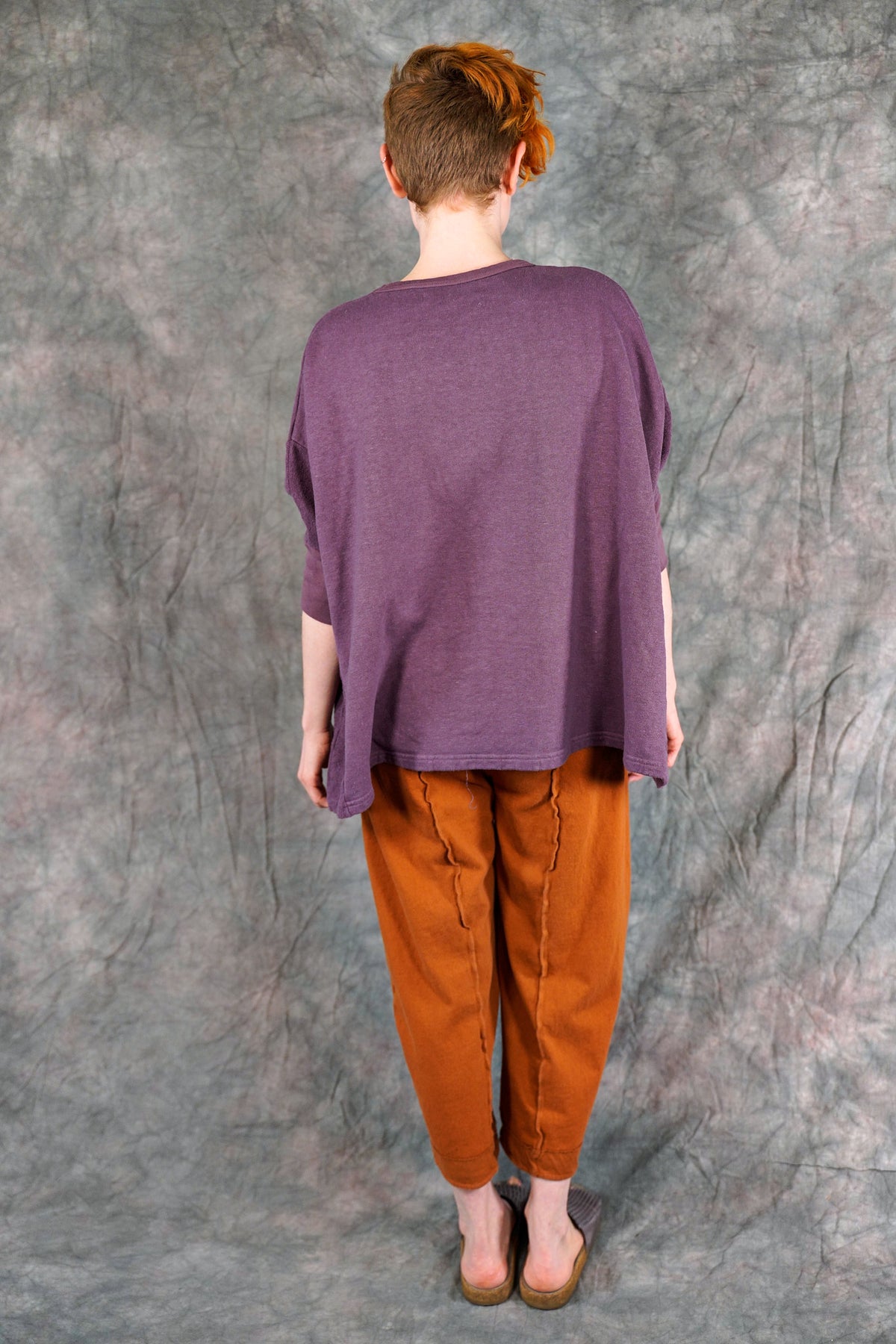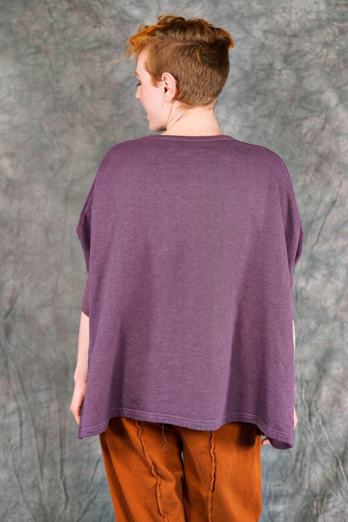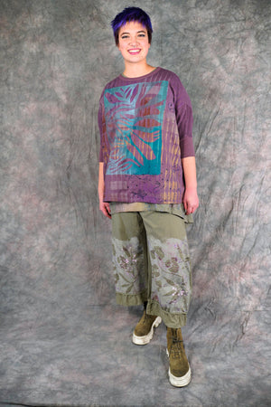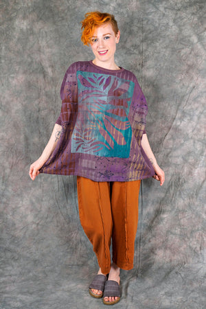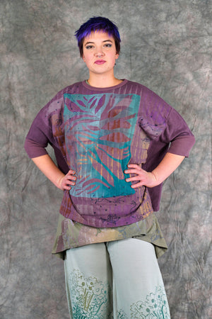 This organic hemp/cotton pullover sweatshirt is a new style to love--snuggly soft cozy fabric meets art from our studio to create a piece you'll reach for again & again! Contrasting panels of fabric around the arms & on the sides add visual interest. This is a more tailored version of the favorite square Blue Fish sweatshirt. Please note that fitted arms & neck make this style most suited to sizes 0 and 1.