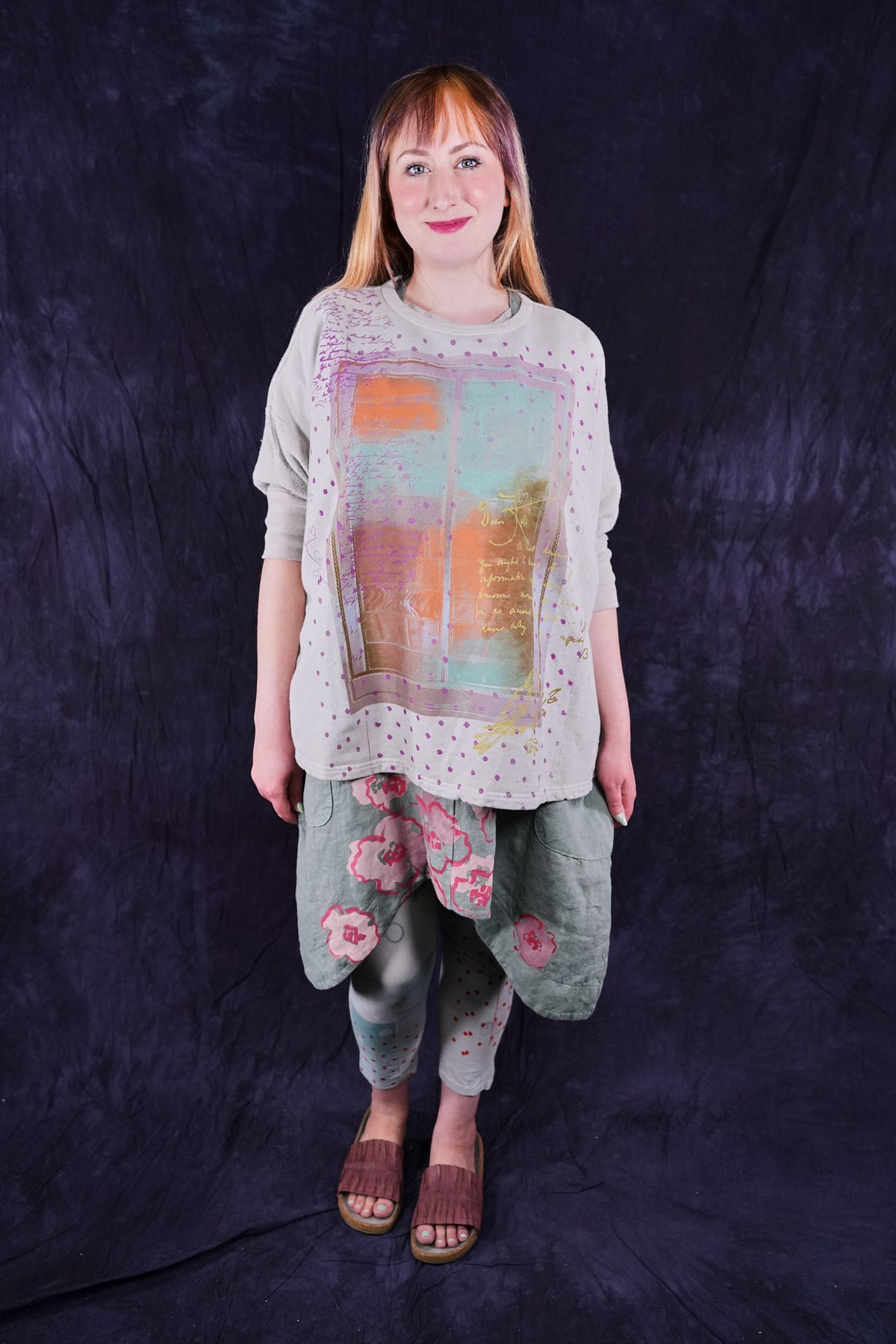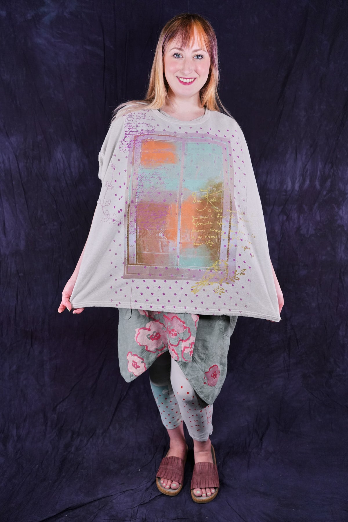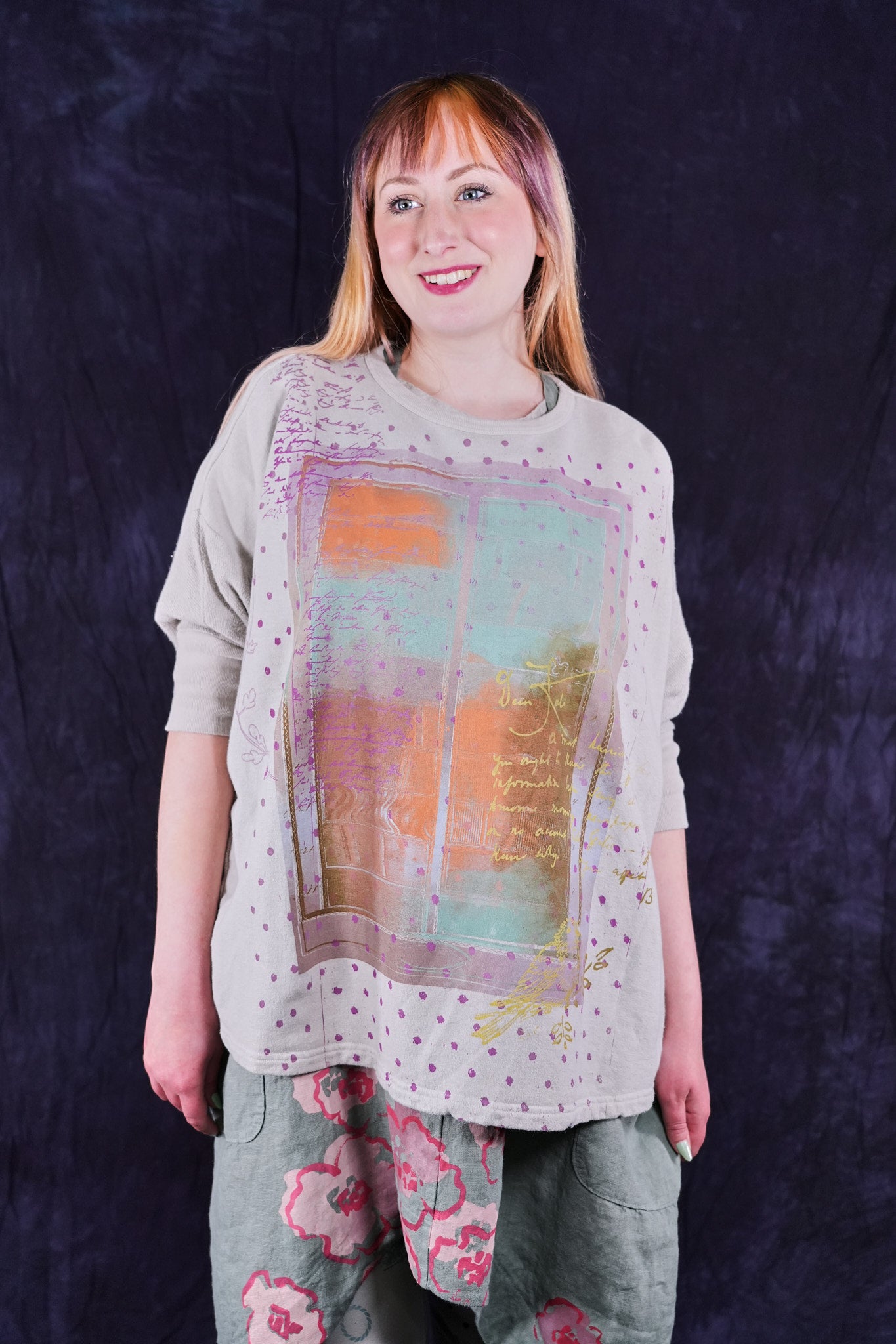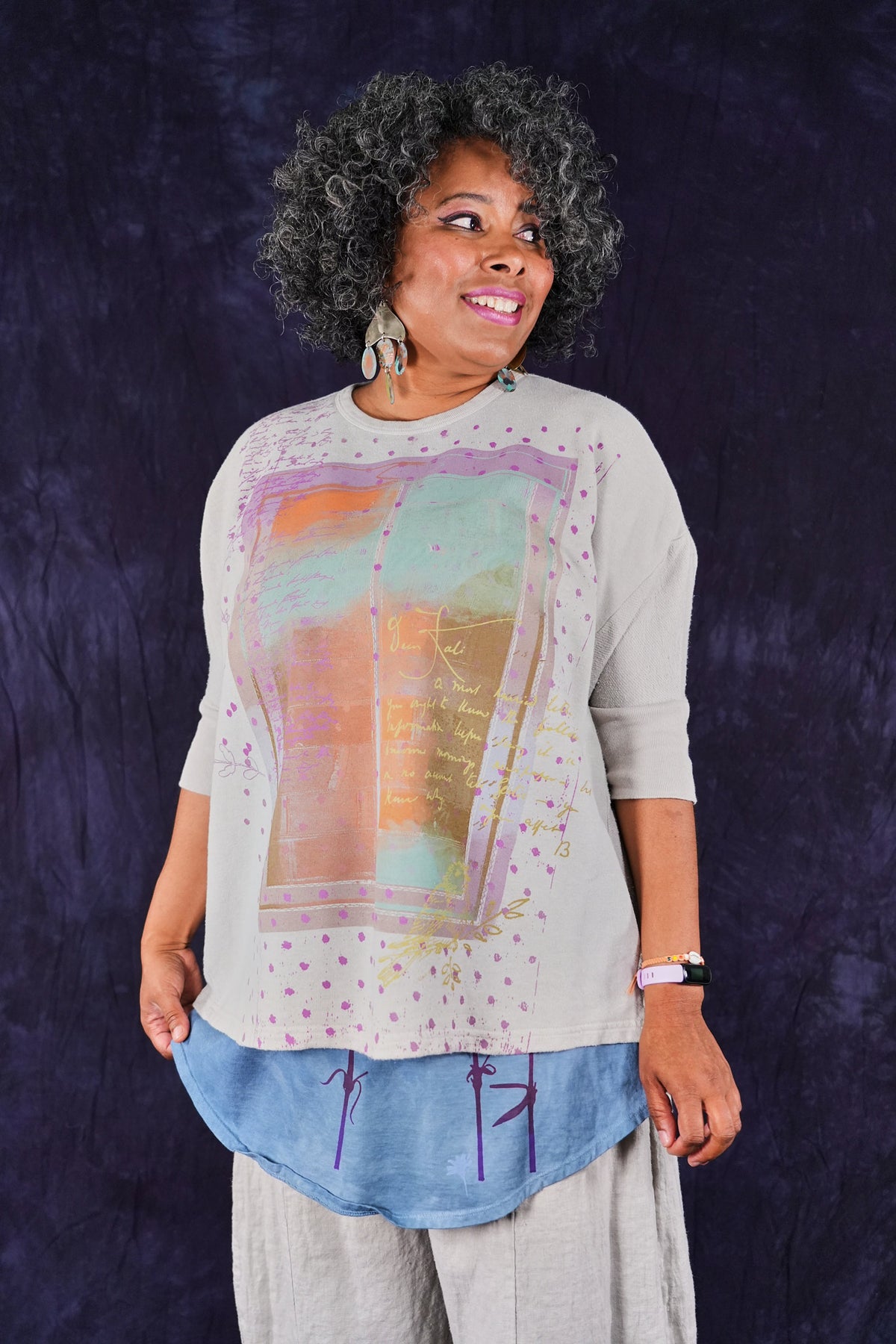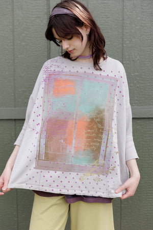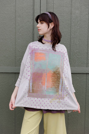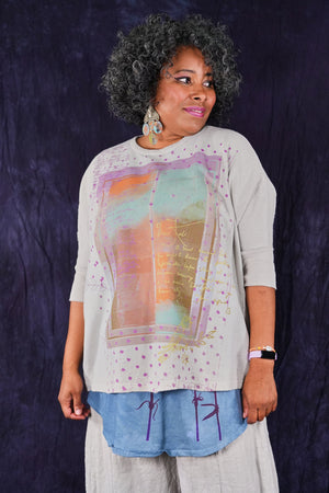 Soft light weight layer with incredible prints. This style will keep you warm on cooler summer evenings and it makes a statement! Square shape with 3/4 length sleeves, perfect for travel. Layer a tee or tank or chambray midlayer underneath to peek out a bit of color from the hem of this light sweatshirt/top.