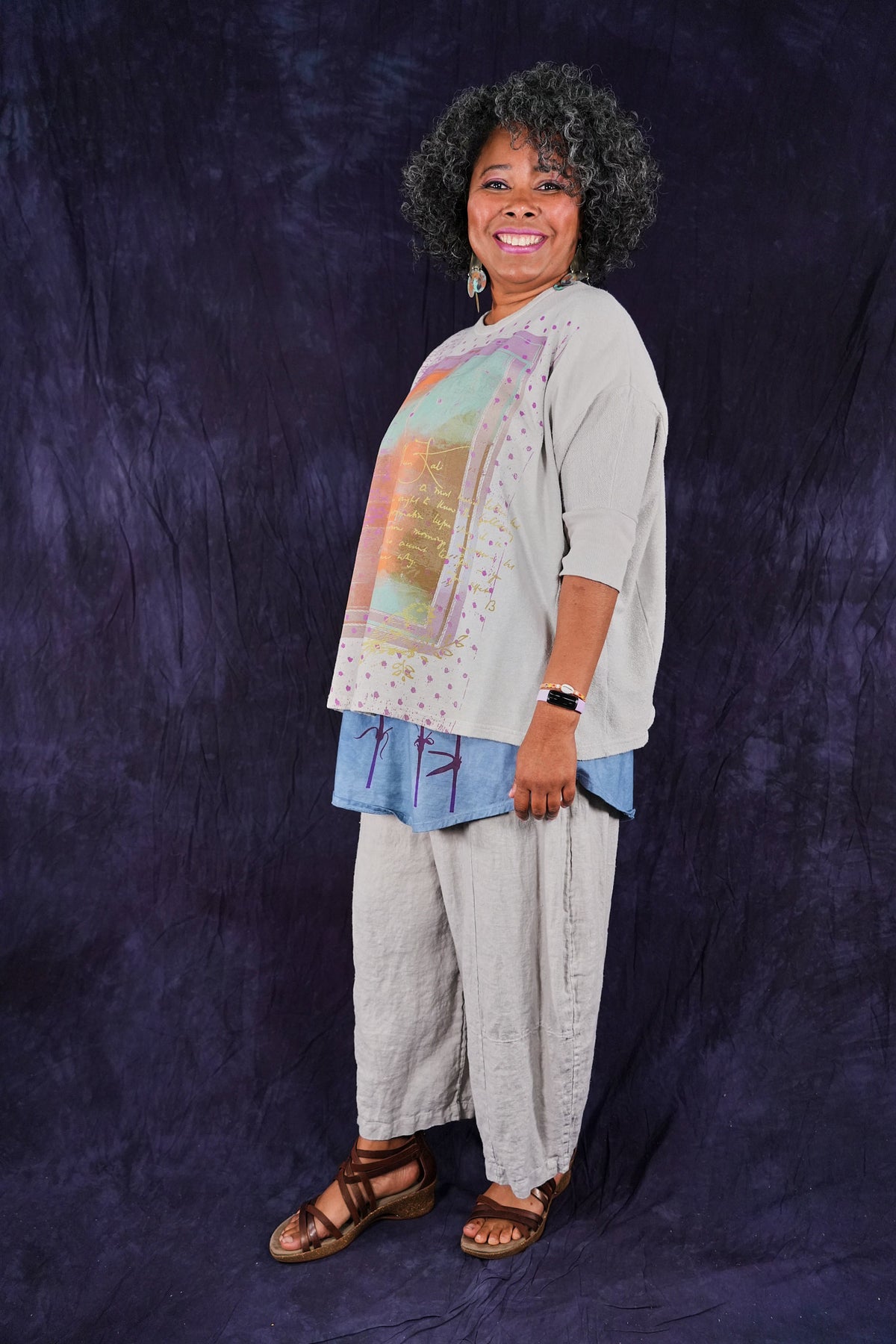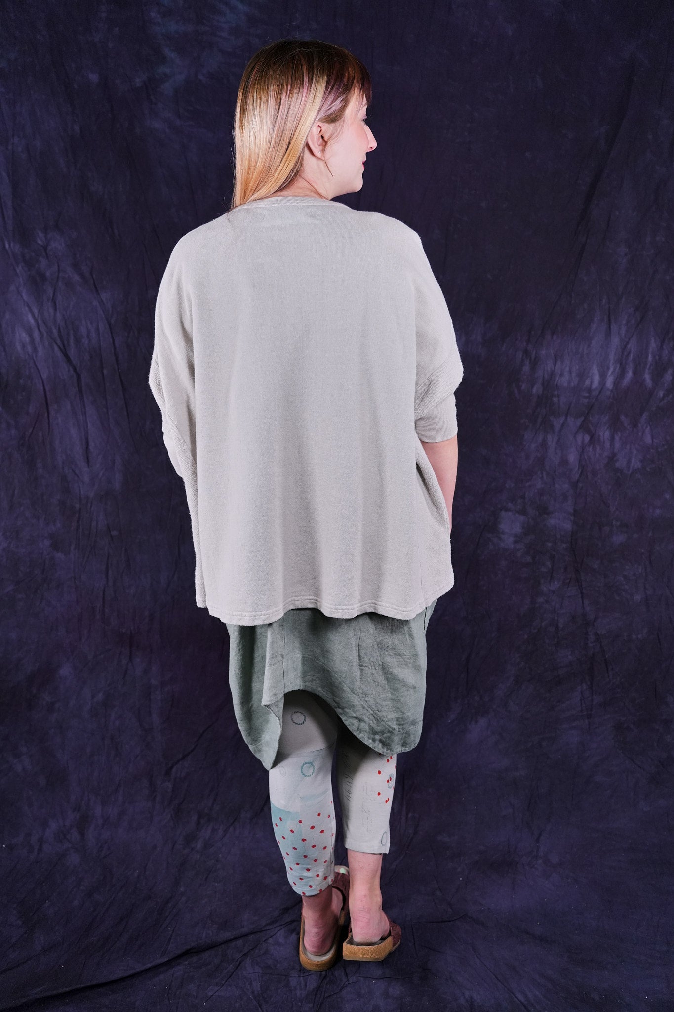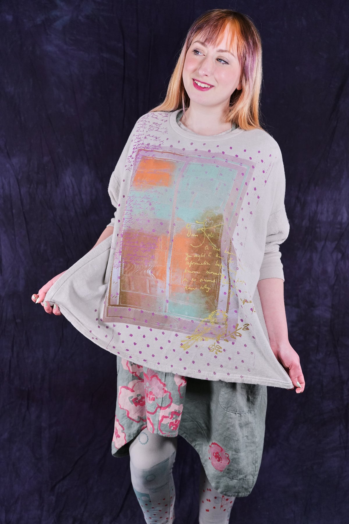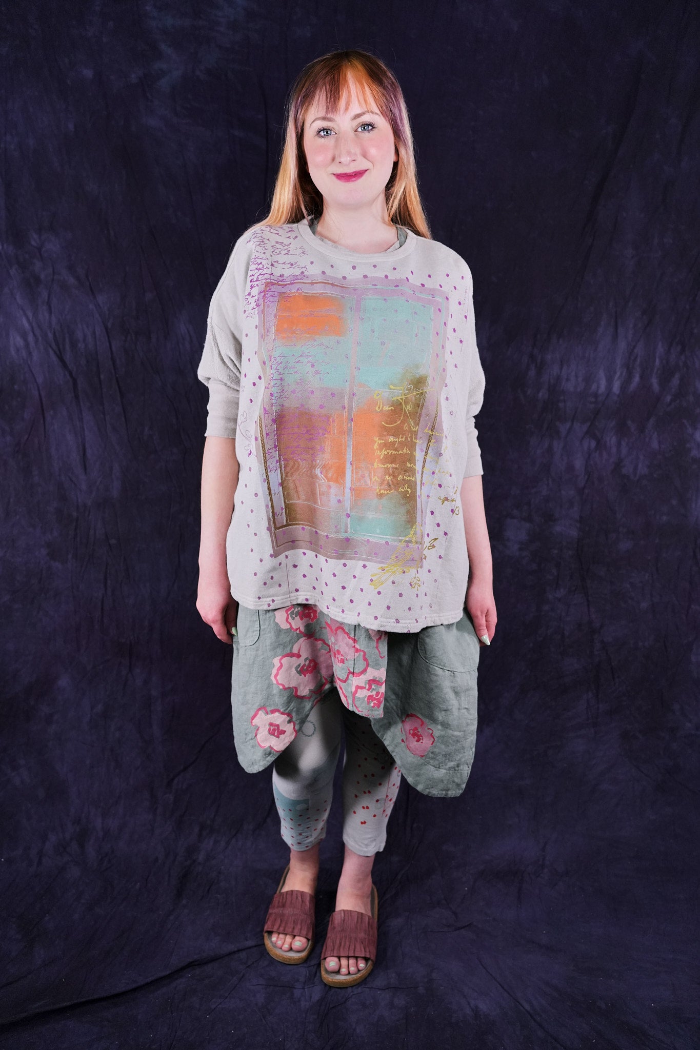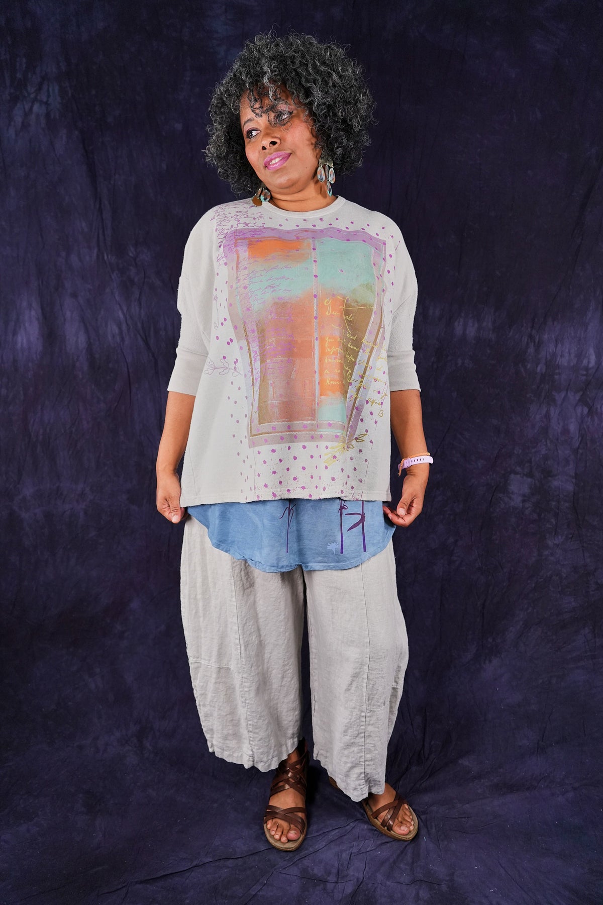 Soft light weight layer with incredible prints. This style will keep you warm on cooler summer evenings and it makes a statement! Square shape with 3/4 length sleeves, perfect for travel. Layer a tee or tank or chambray midlayer underneath to peek out a bit of color from the hem of this light sweatshirt/top.
