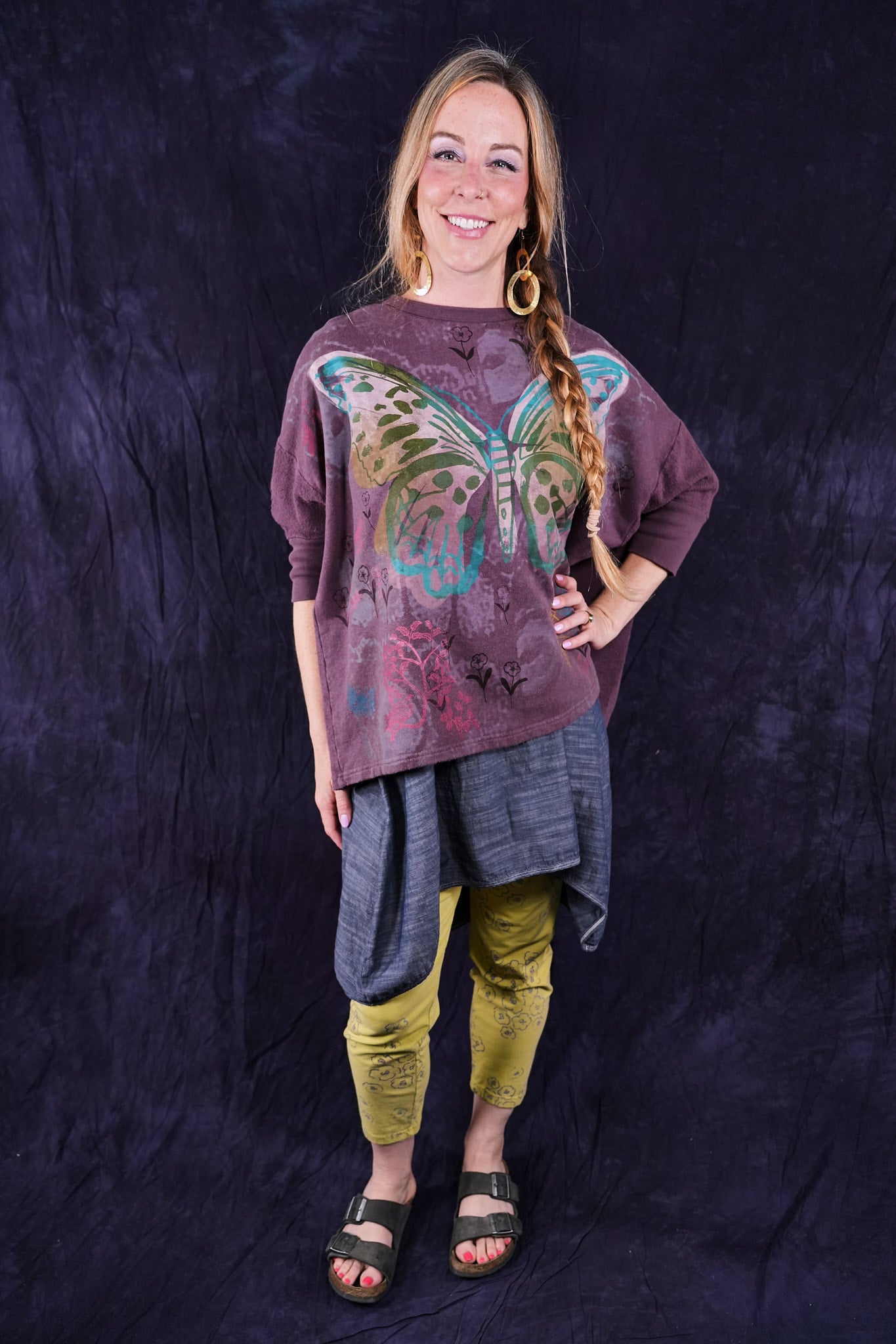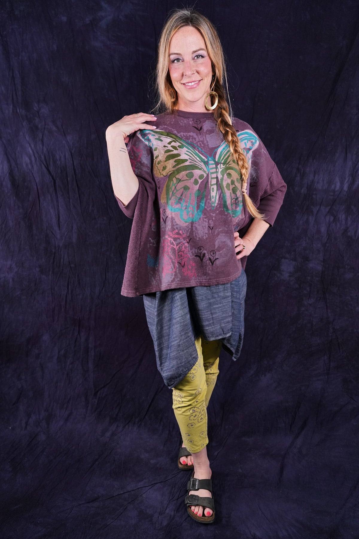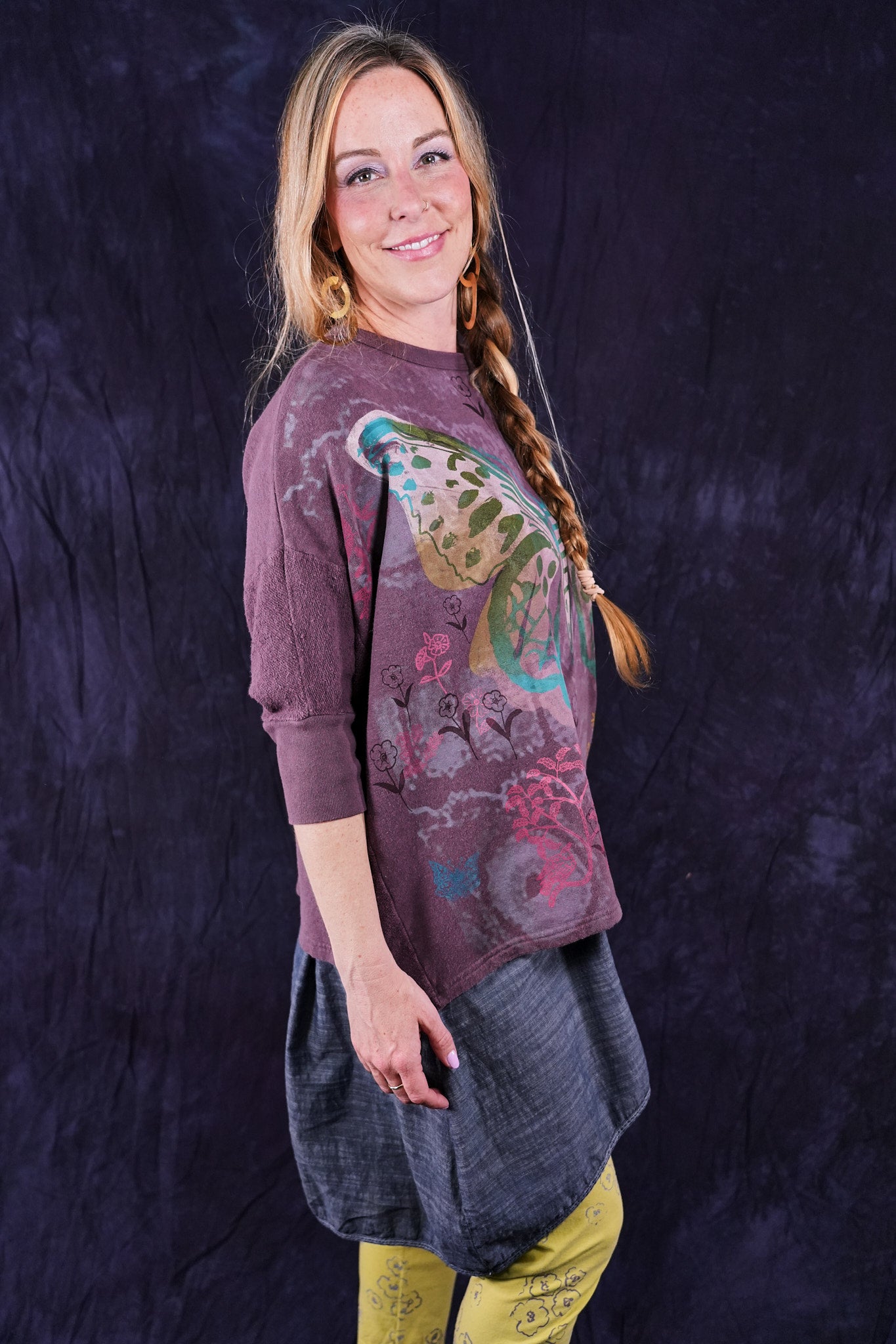 Soft light weight layer with incredible prints.  This style will keep you warm on cooler summer evenings and it makes a statement!  Square shape with 3/4 length sleeves, perfect for travel. Layer a tee or tank or chambray midlayer underneath to peek out a bit of color from the hem of this light sweatshirt/top.