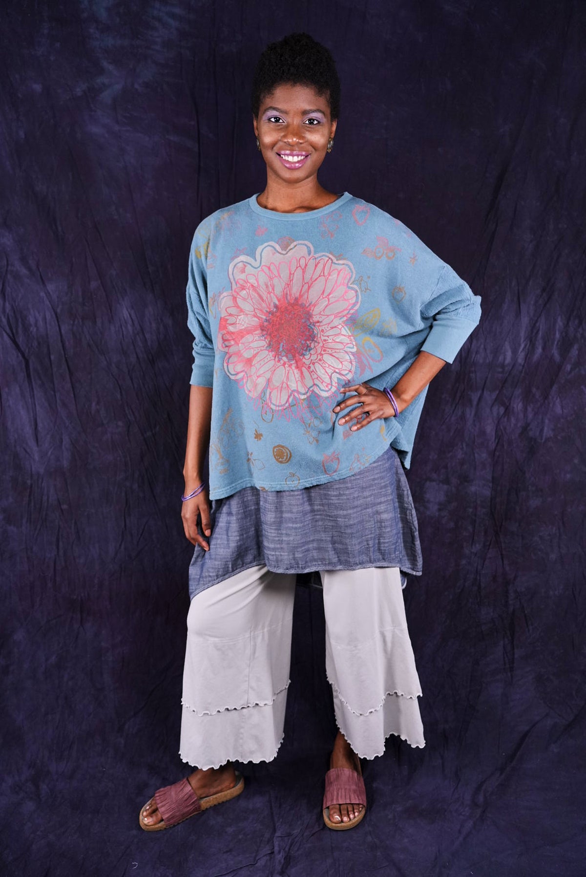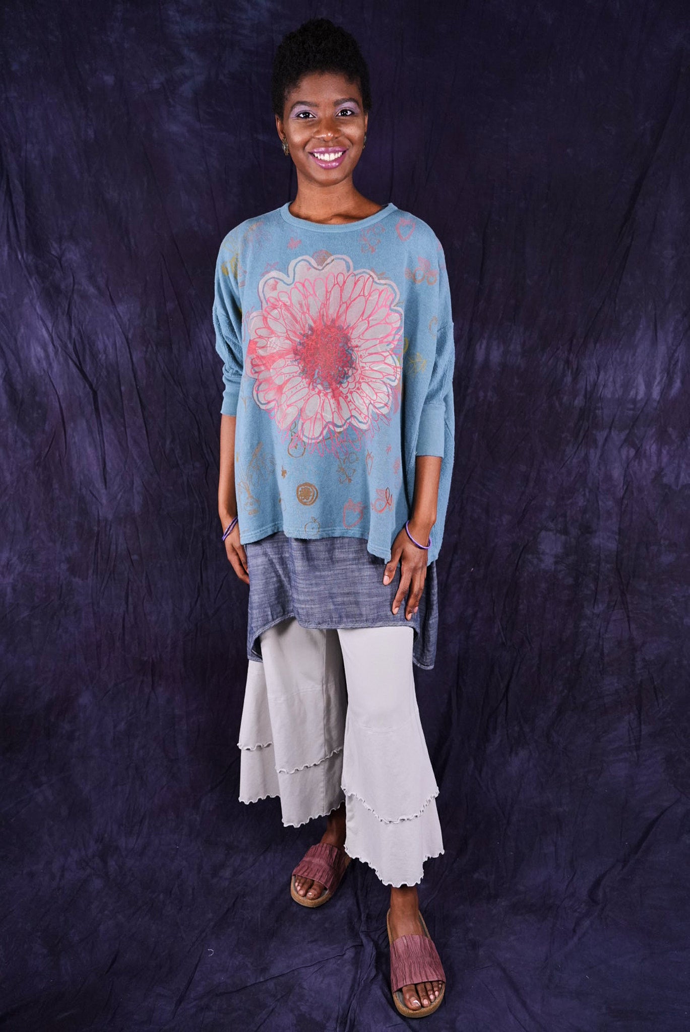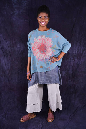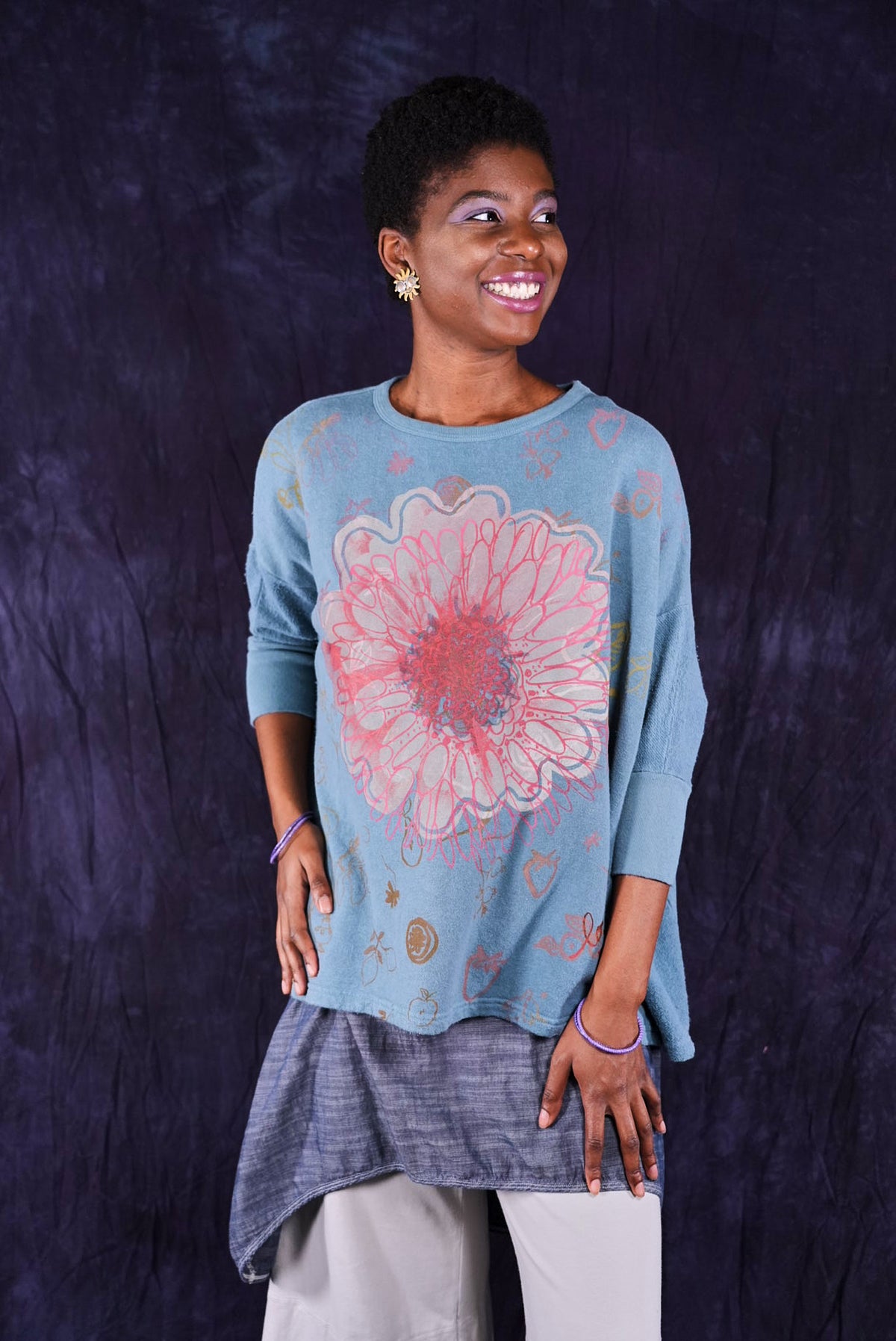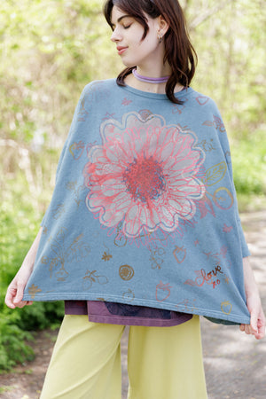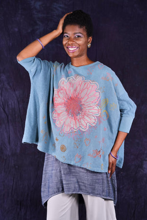 Soft light weight layer with incredible prints. This style will keep you warm on cooler summer evenings and it makes a statement! Square shape with 3/4 length sleeves, perfect for travel. Layer a tee or tank or chambray midlayer underneath to peek out a bit of color from the hem of this light sweatshirt/top.