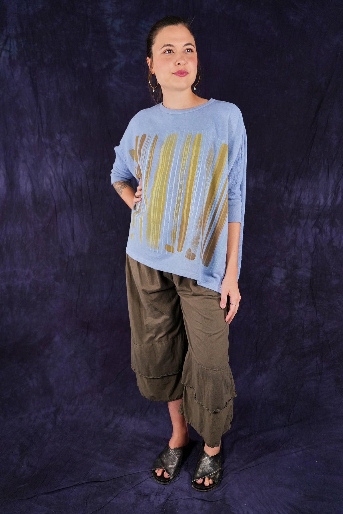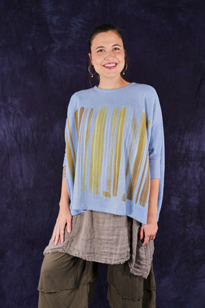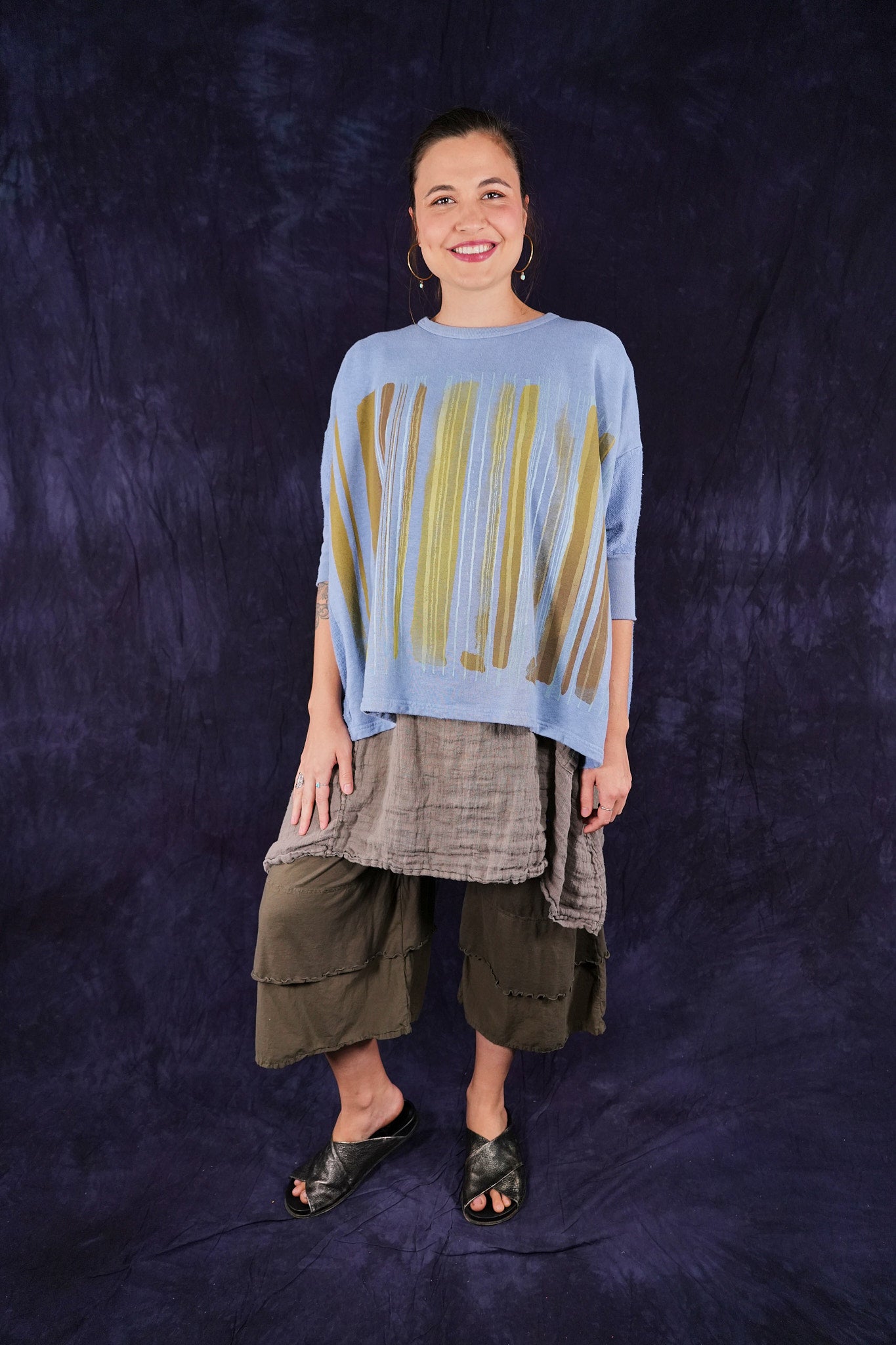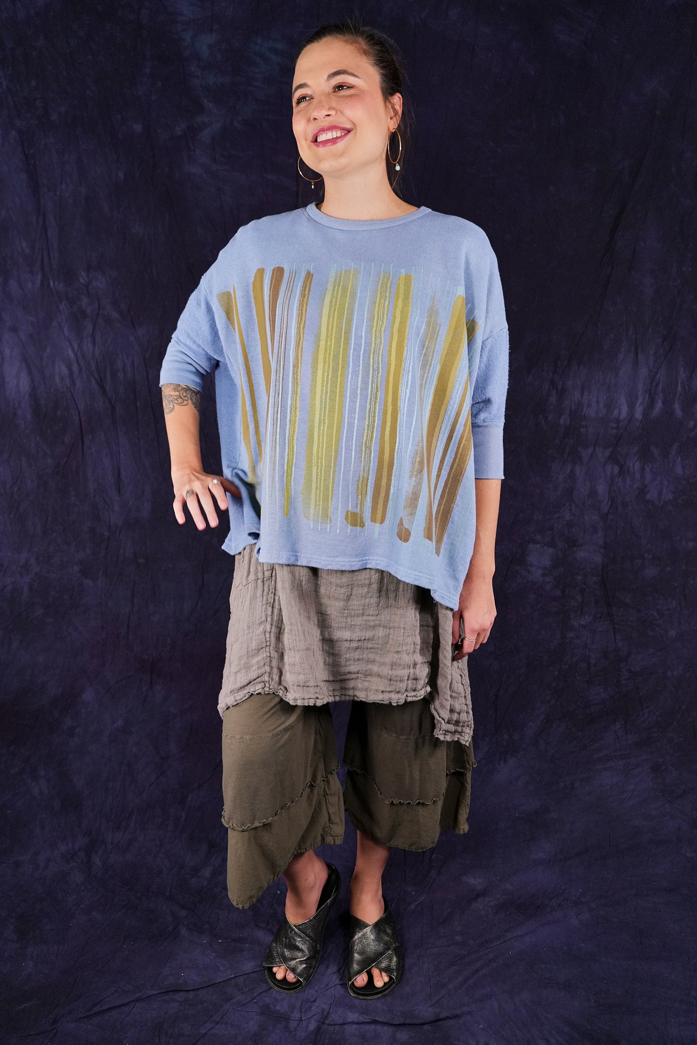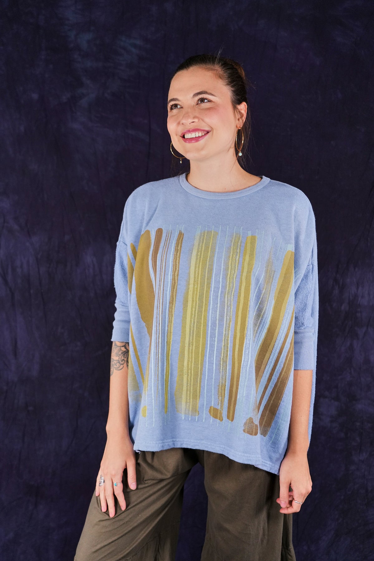Soft light weight layer with incredible prints. This style will keep you warm on cooler summer evenings and it makes a statement! Square shape with 3/4 length sleeves, perfect for travel. Layer a tee or tank or chambray midlayer underneath to peek out a bit of color from the hem of this light sweatshirt/top.