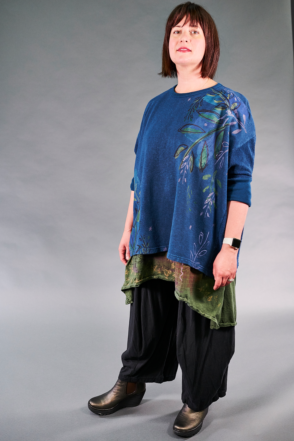 • This organic hemp/cotton pullover sweatshirt is a new style to love--snuggly soft cozy fabric meets art from our studio to create a piece you'll reach for again & again! Contrasting panels of fabric around the arms & on the sides add visual interest. This is a more tailored version of the favorite square Blue Fish sweatshirt. Please note that fitted arms & neck make this style most suited to sizes 0 and 1.