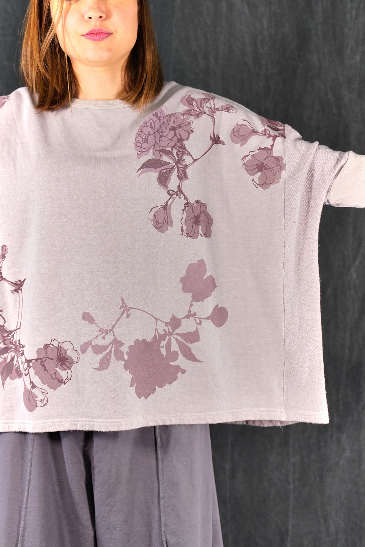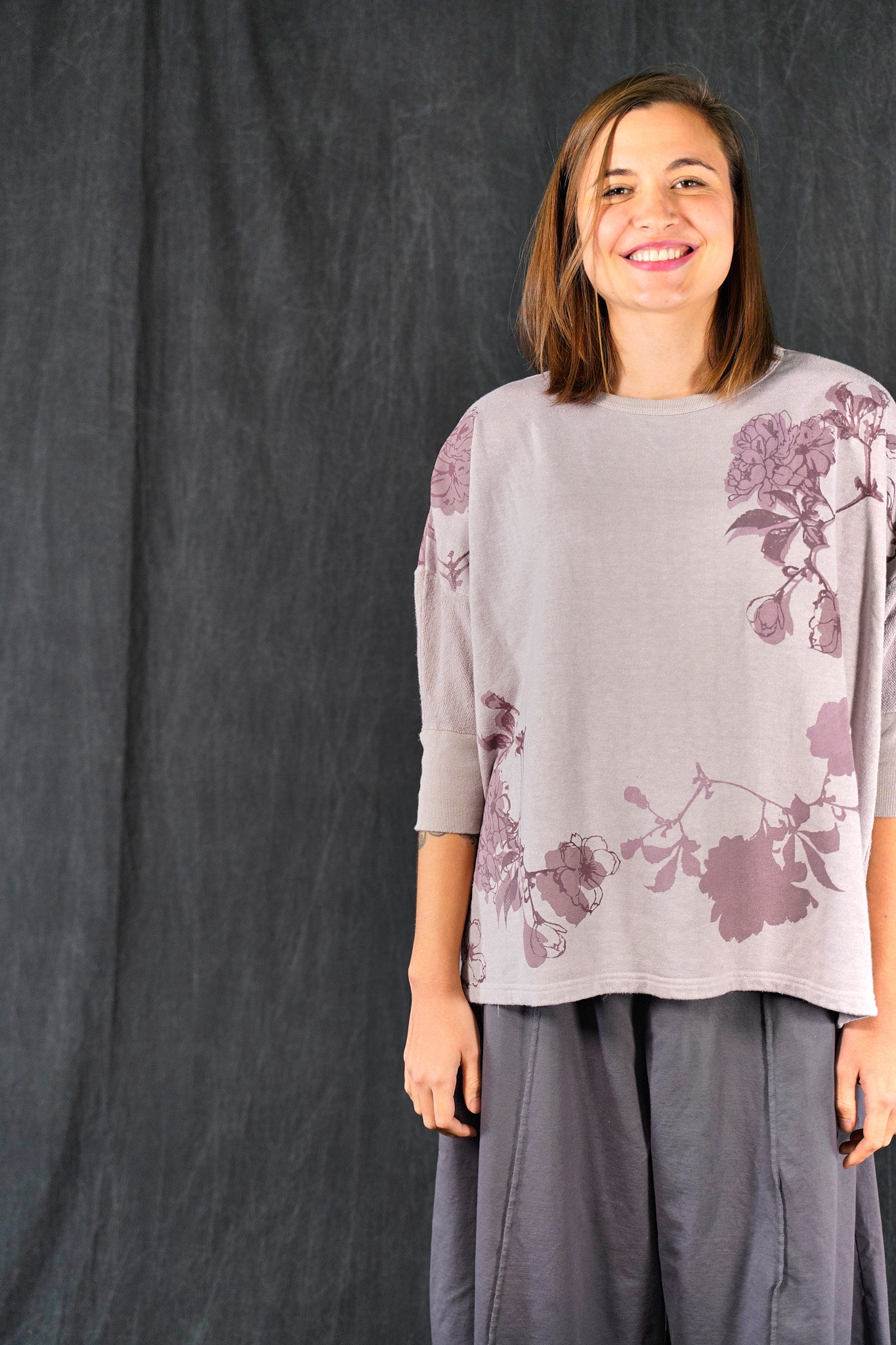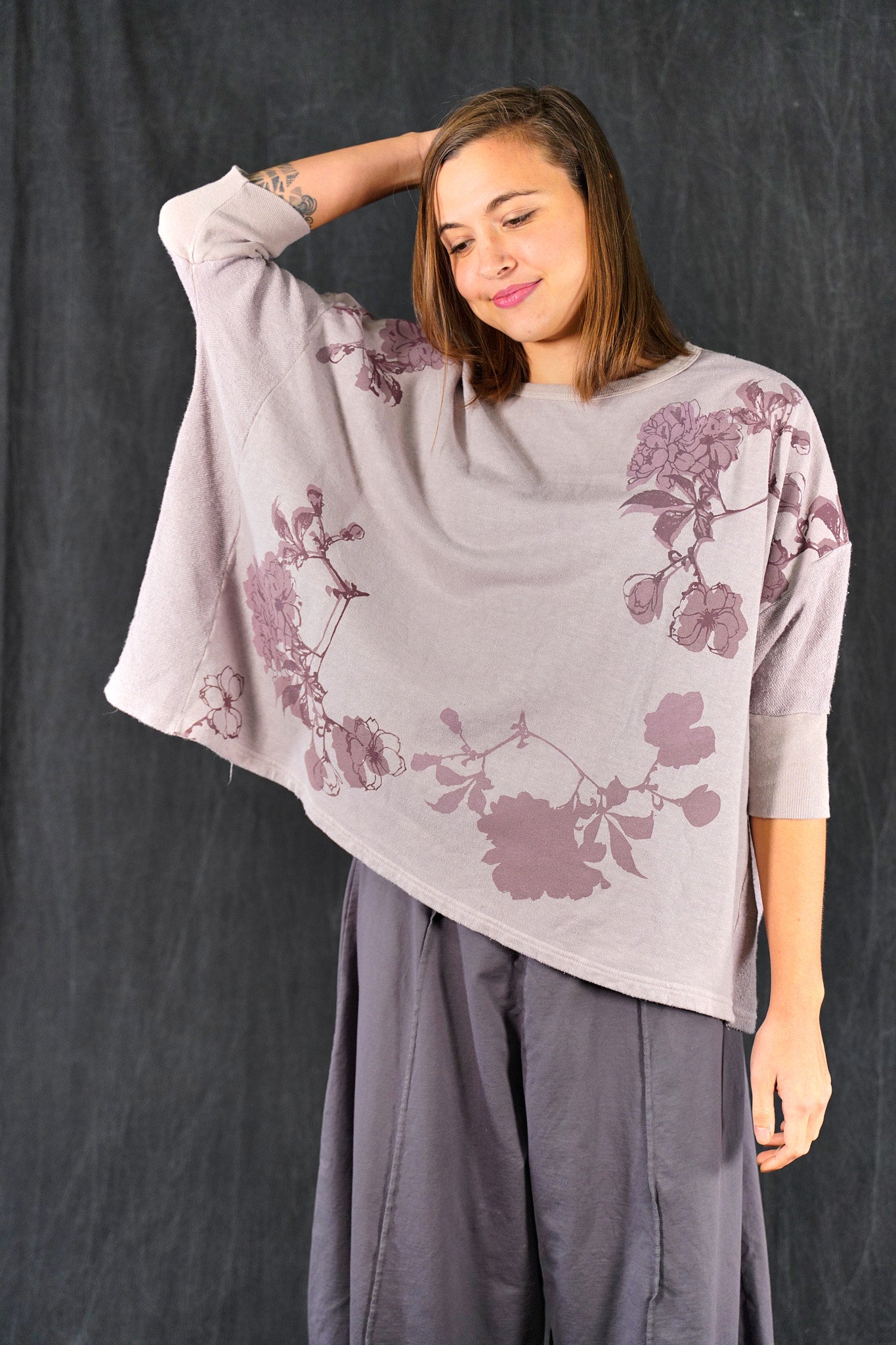 Printed on front and back! A beautiful soft neutral hint of pink color. Hand printed with a lovely floral design. This organic hemp/cotton pullover sweatshirt is a new style to love-- soft cozy fabric meets art from our studio to create a piece you'll reach for again & again! Contrasting panels of fabric around the arms & on the sides add visual interest. This is a more tailored version of the favorite square Blue Fish sweatshirt. Please note that fitted arms & neck make this style most suited to sizes 0 and 1.