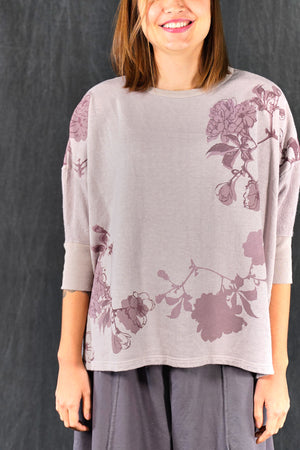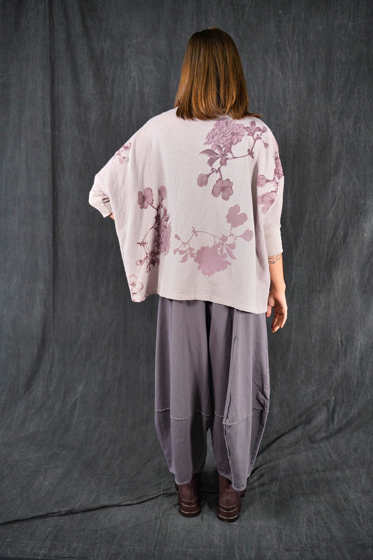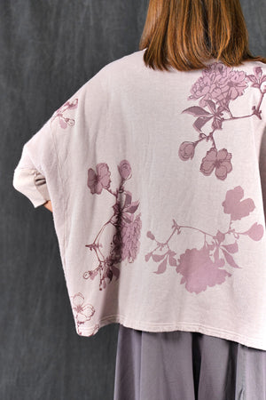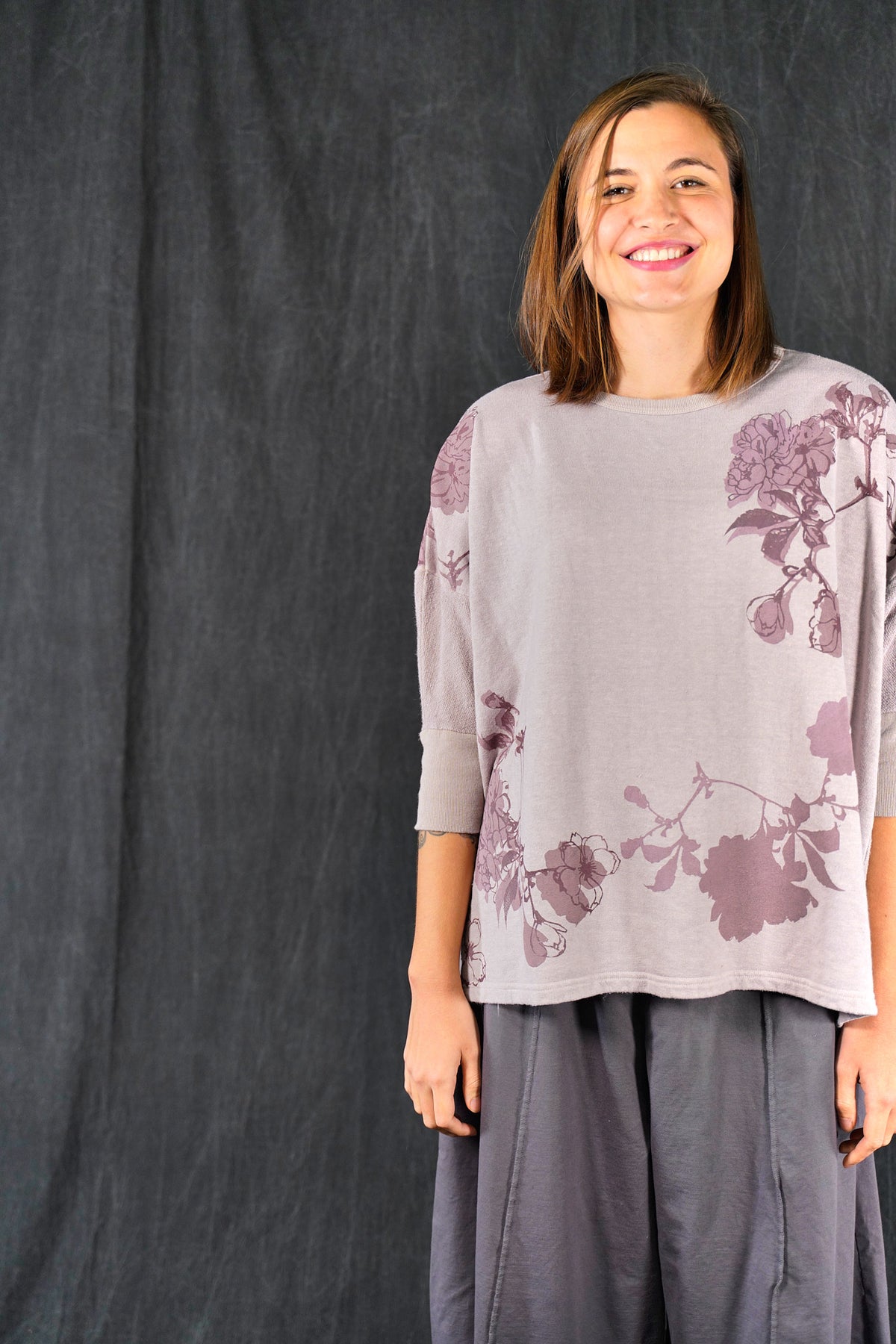 Printed on front and back! A beautiful soft neutral hint of pink color. Hand printed with a lovely floral design. This organic hemp/cotton pullover sweatshirt is a new style to love-- soft cozy fabric meets art from our studio to create a piece you'll reach for again & again! Contrasting panels of fabric around the arms & on the sides add visual interest. This is a more tailored version of the favorite square Blue Fish sweatshirt. Please note that fitted arms & neck make this style most suited to sizes 0 and 1.