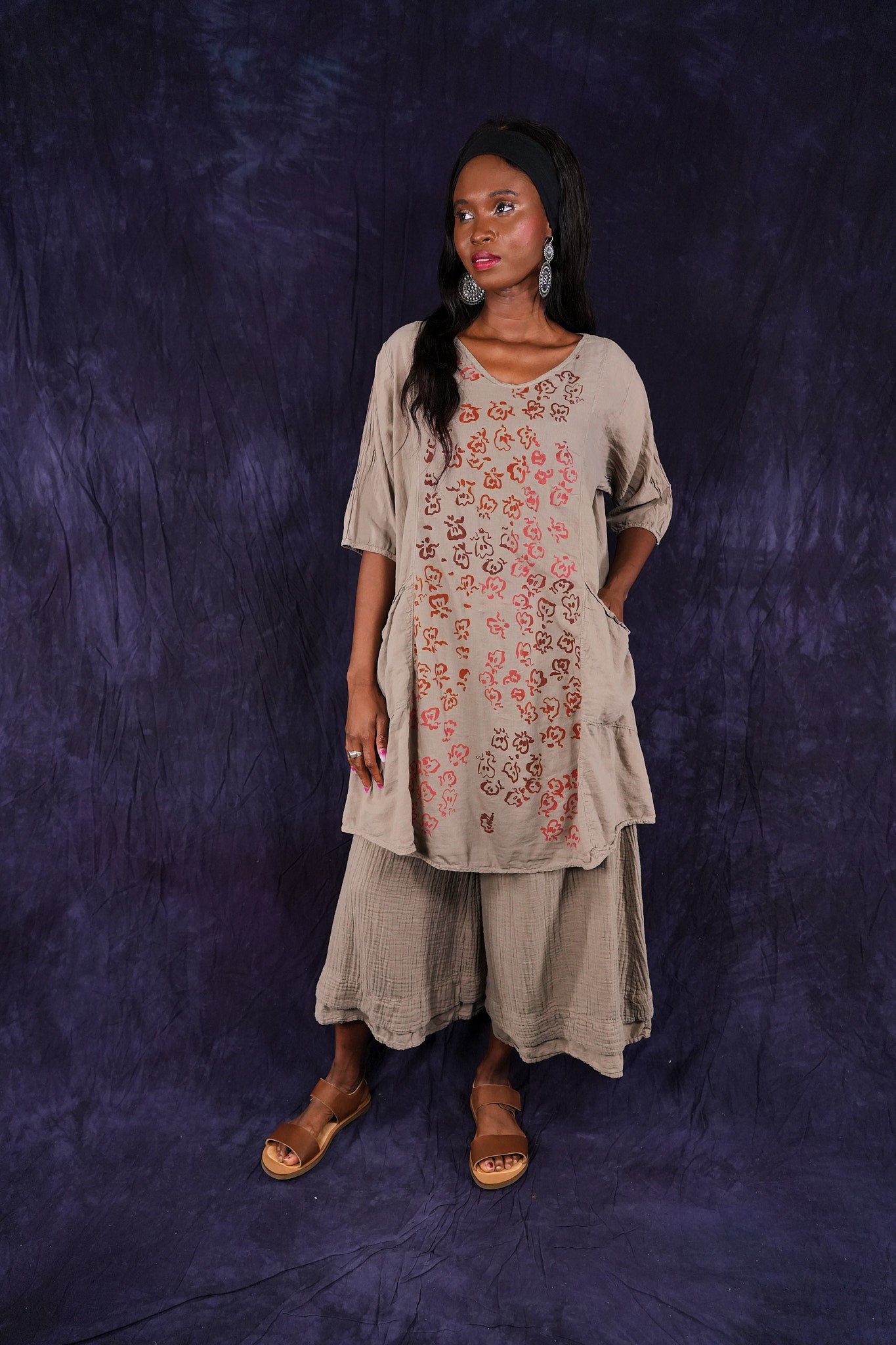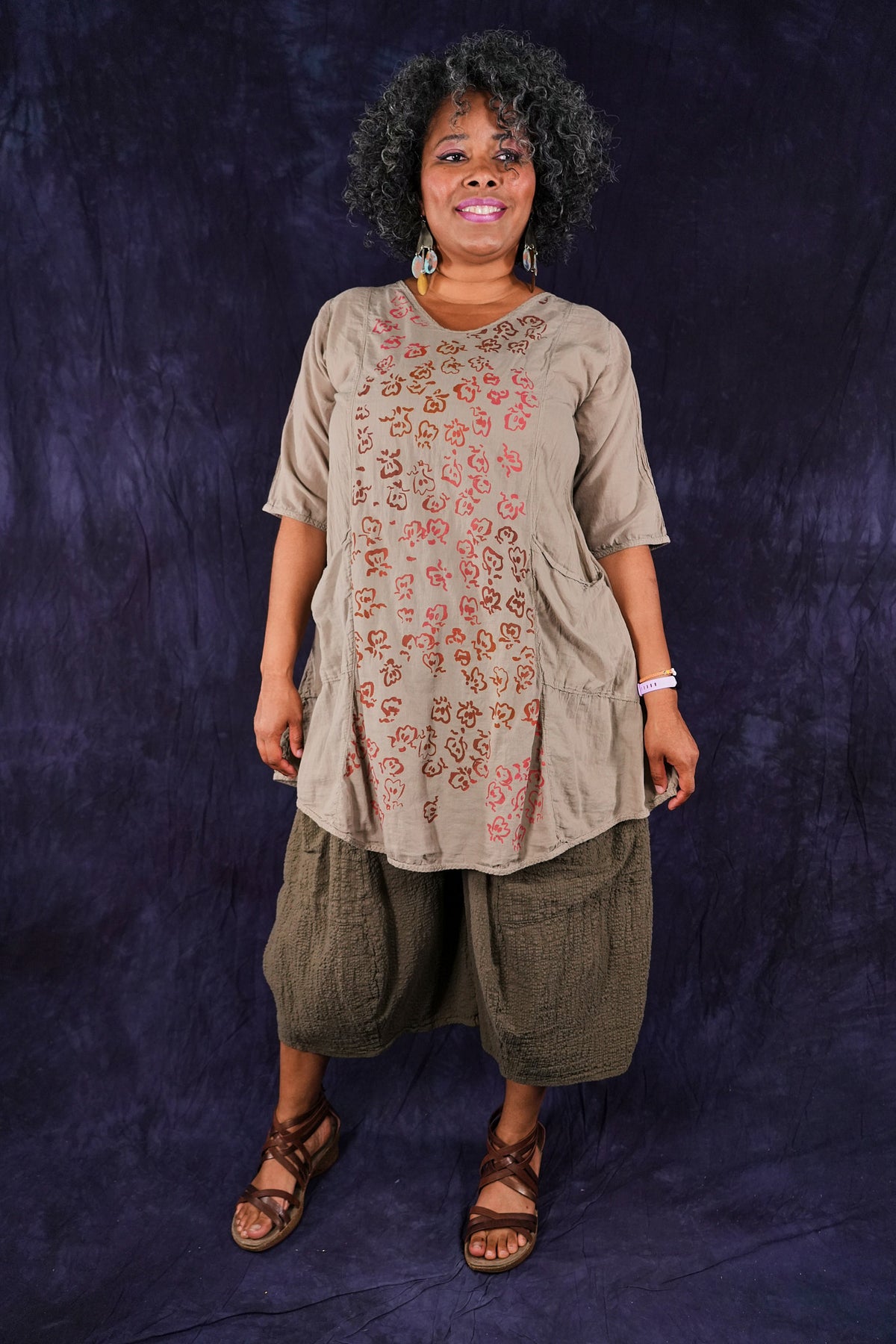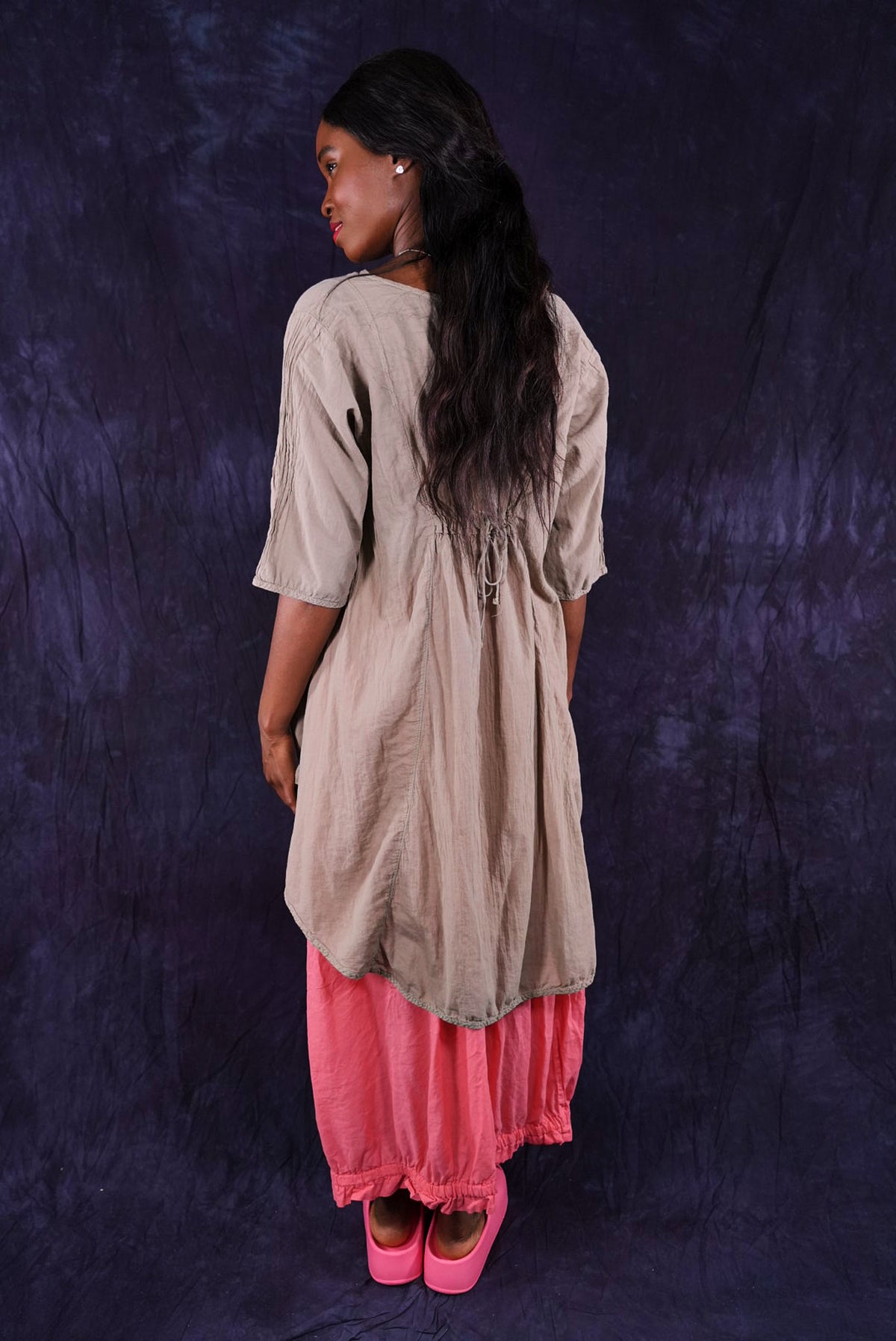 Light as air cotton tunic (a longer bliss top!) with a softly V'd neckline, pockets and princess seams, and a drawcord in the back. Perfect traveling piece for in between into summer days! Roll and pack. Two large pockets, drawcord longer back- the essential hot weather tunic. Wear over the #3242 Cropped Mojo Pant or the #3167 Cropped Legging. Cool.