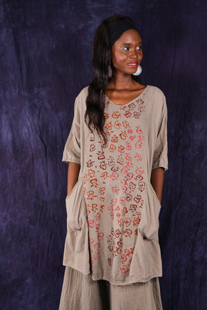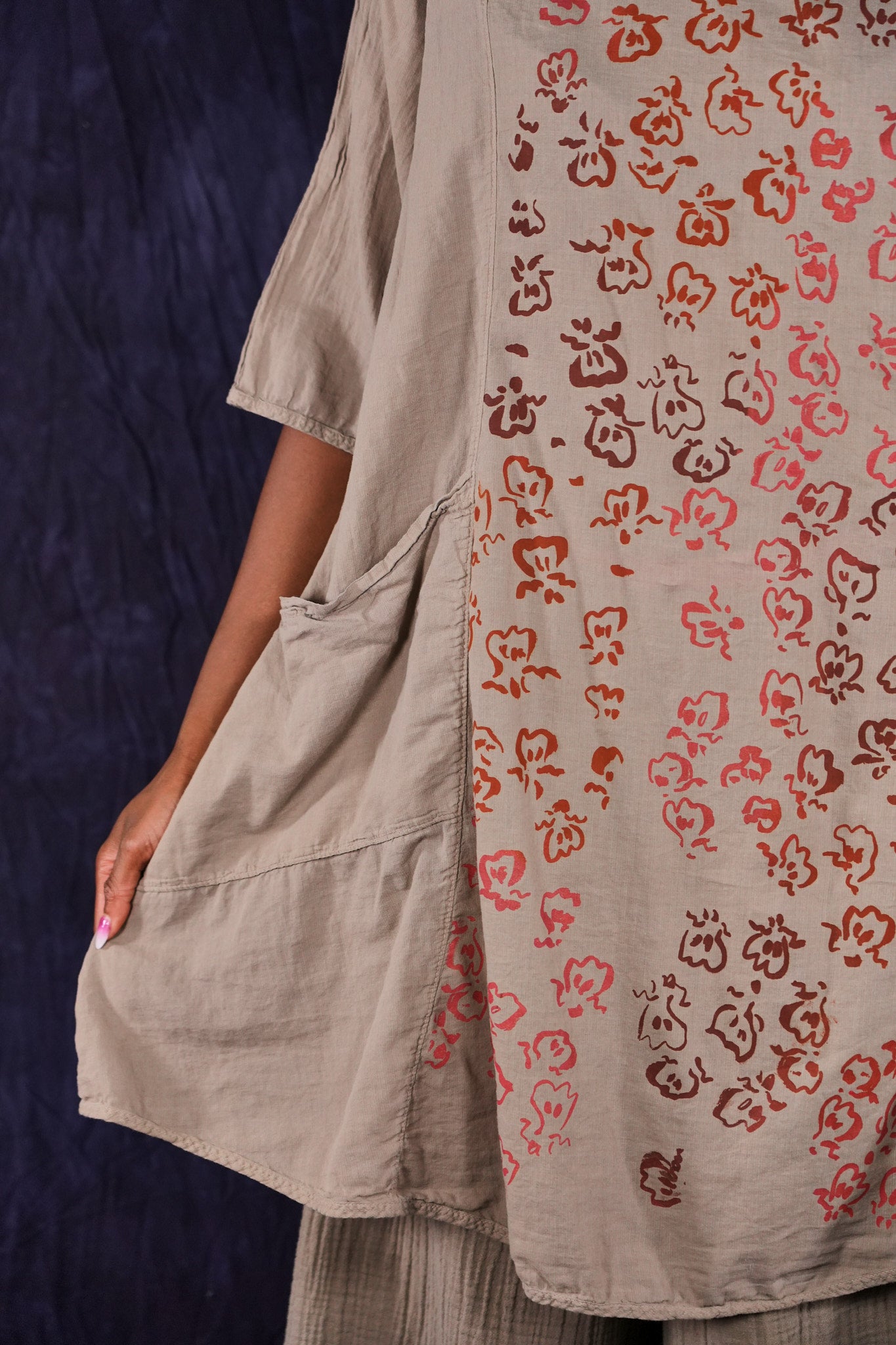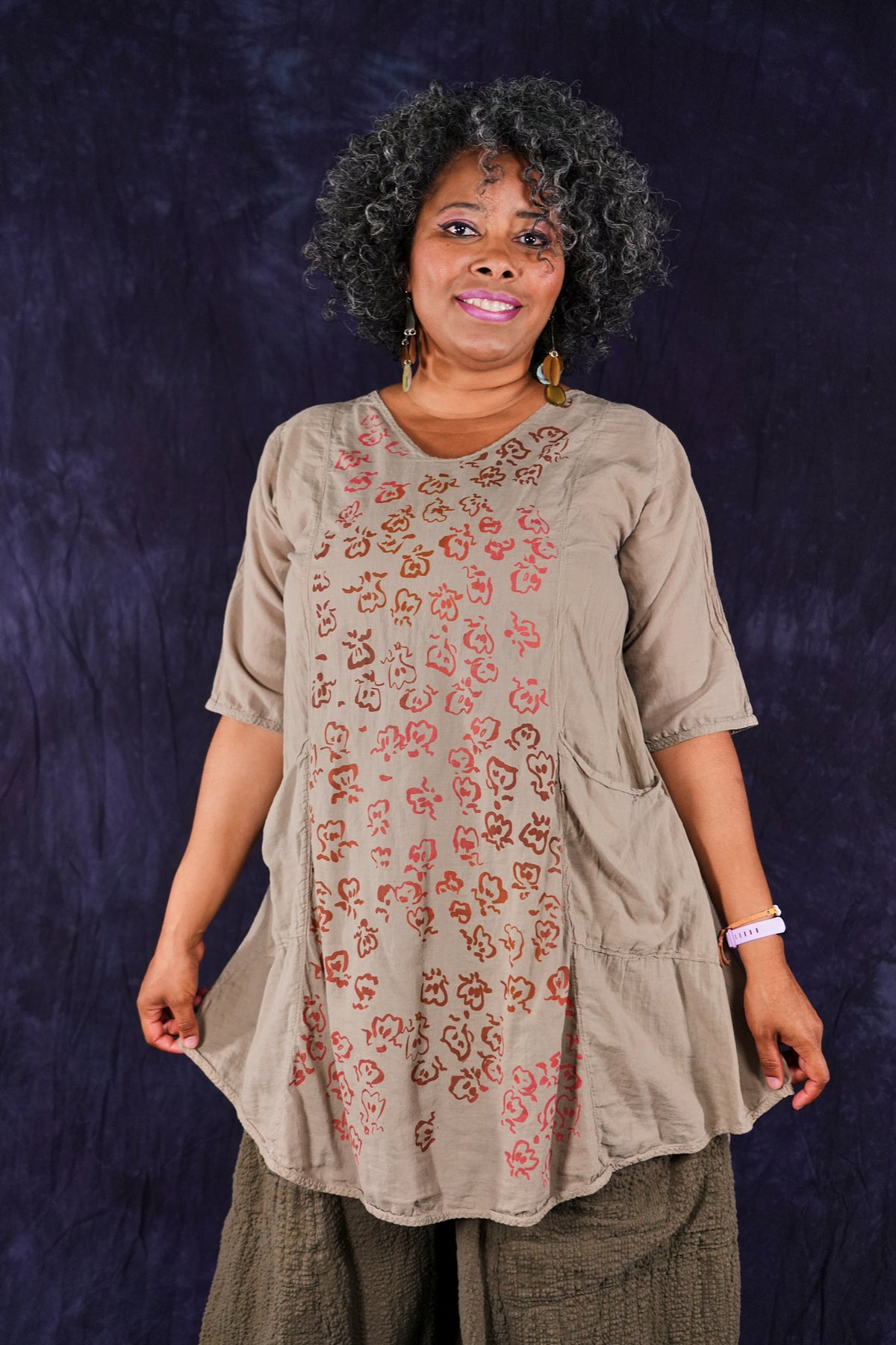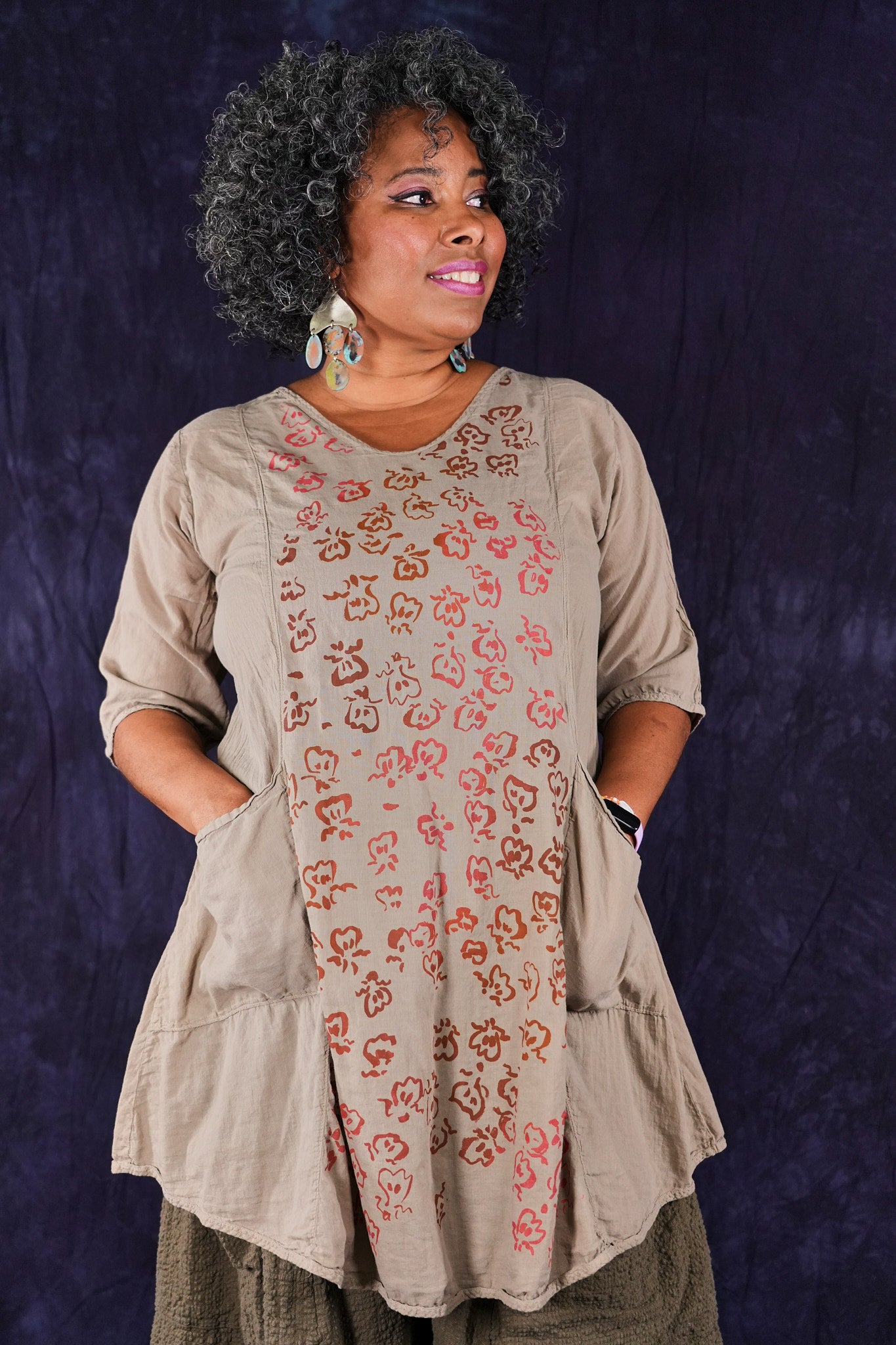 Light as air cotton tunic (a longer bliss top!) with a softly V'd neckline, pockets and princess seams, and a drawcord in the back. Perfect traveling piece for in between into summer days! Roll and pack. Two large pockets, drawcord longer back- the essential hot weather tunic. Wear over the #3242 Cropped Mojo Pant or the #3167 Cropped Legging. Cool.