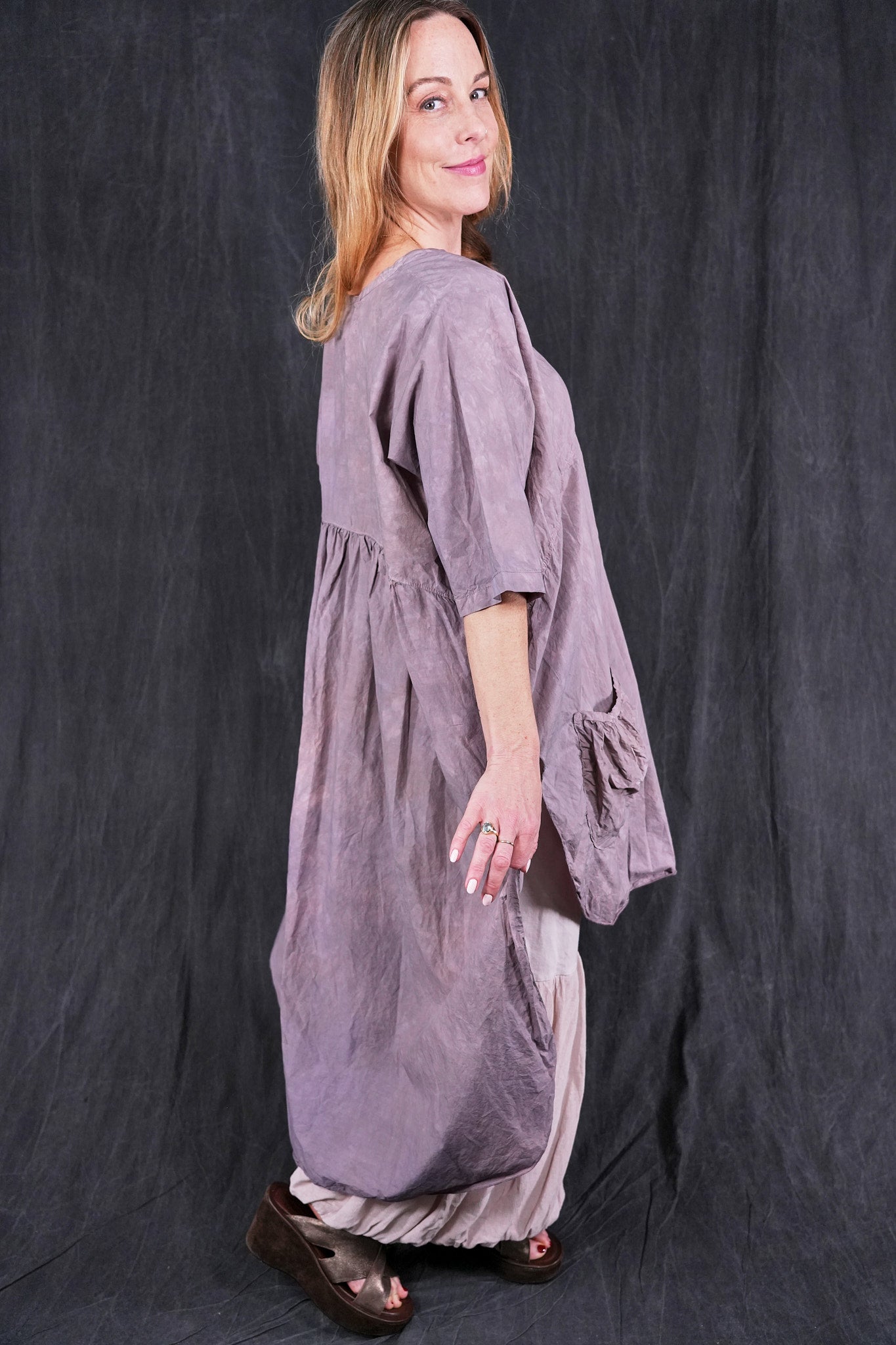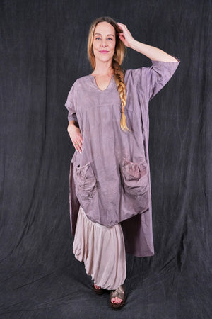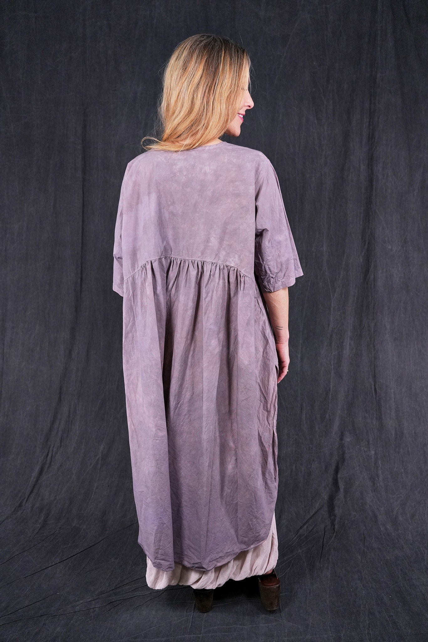 A hand dyed & beautiful style for those who like a little drama. Complex, interesting color and-dyed smoothly woven cotton sets the stage. The back of this tunic drops low in the back and so, this top layers well over wide pants or a skirt in a floaty cotton lawn quite nicely. Perfect for a warm weather event.